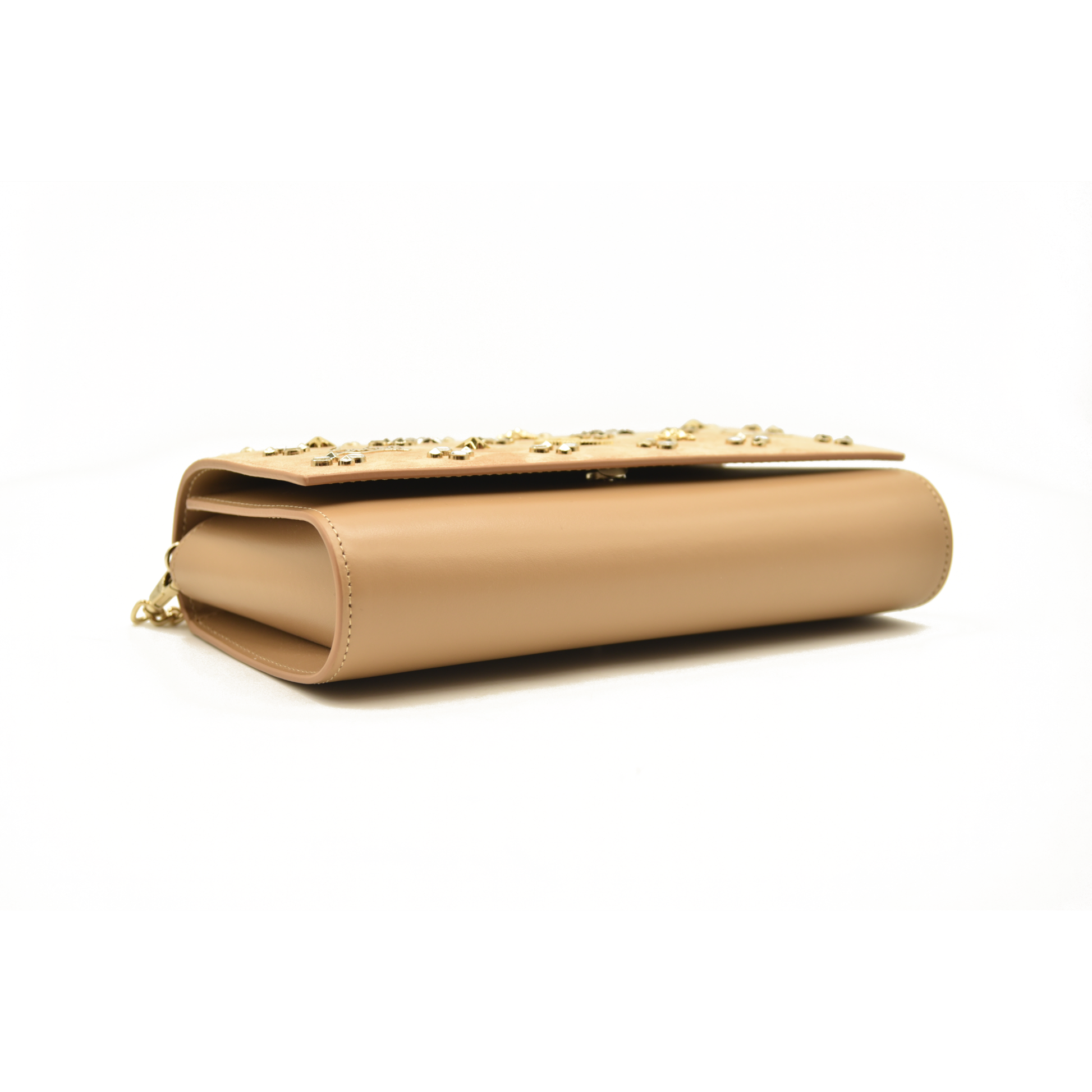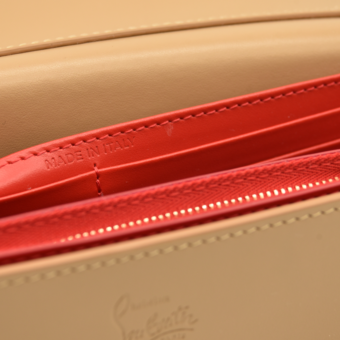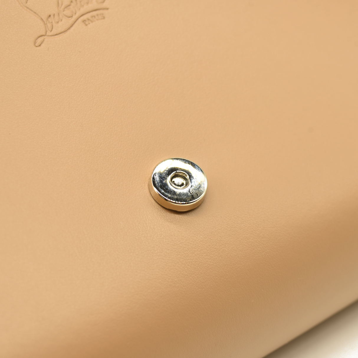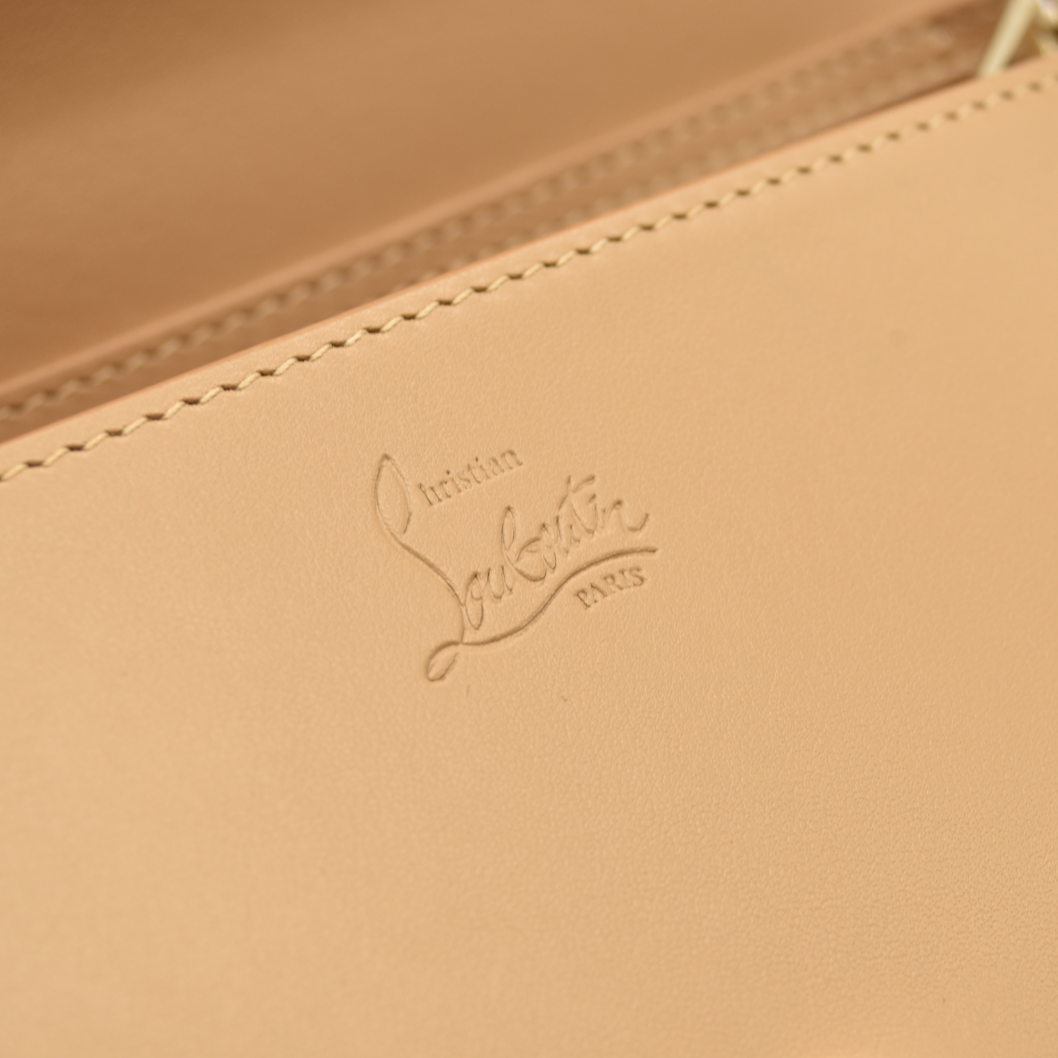 The Paloma clutch has a striking, elegant style. This slender design is crafted in Lionne beige veau velours and patent calf leather. It features Maison Christian Louboutin's signature tone-on-tone Loubinthesky spikes.