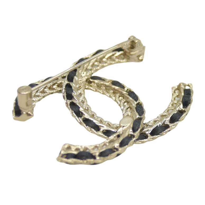 This is an authentic CHANEL Lambskin Chain CC Brooch in Black and Gold. This elegant brooch is a CC logo and is crafted of a light gold chain link threaded with black lambskin leather.