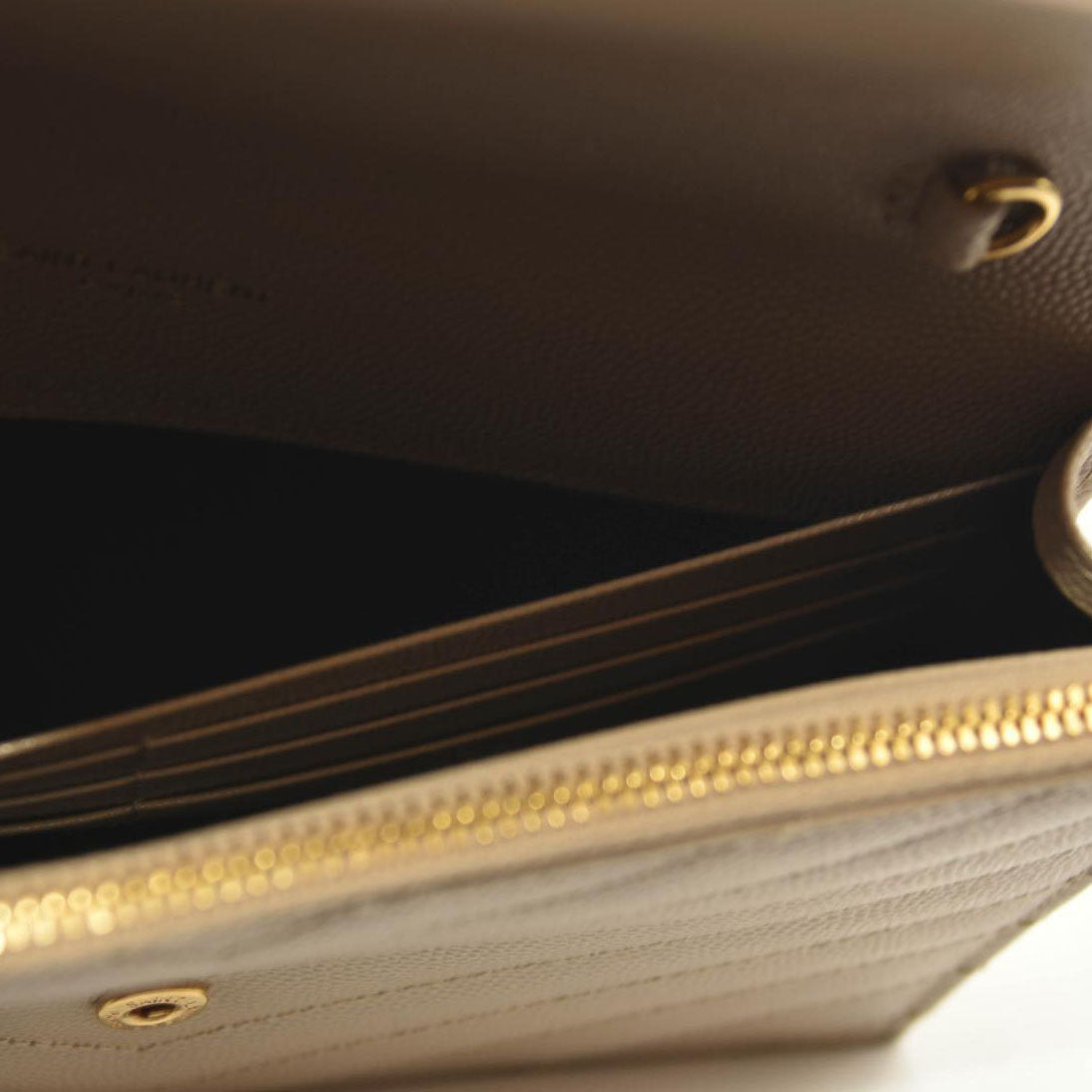 This is an authentic SAINT LAURENT Grain De Poudre Matelasse Chevron Monogram Chain Wallet in Dark Beige. This elegant chain wallet is crafted of chevron-quilted leather in beige. The bag features an optional gold bijoux chain shoulder strap and a facing flap with a prominent gold YSL monogram logo. The flap opens to a partitioned leather interior with card slot panels and a central zipper compartment.