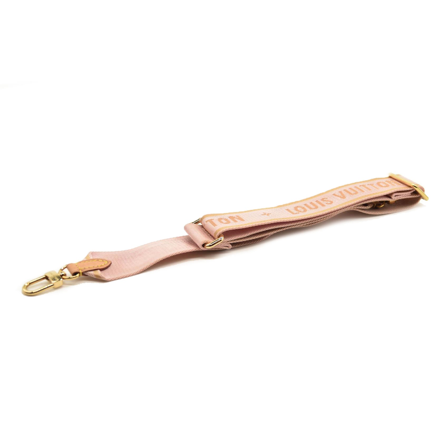 This is an authentic LOUIS VUITTON Monogram Multi Pochette Accessories Shoulder Strap in Rose Clair. This adjustable strap is crafted of canvas with the Louis Vuitton Paris logo embroidered throughout. It has pink leather ends and a polished brass clasp at each end.