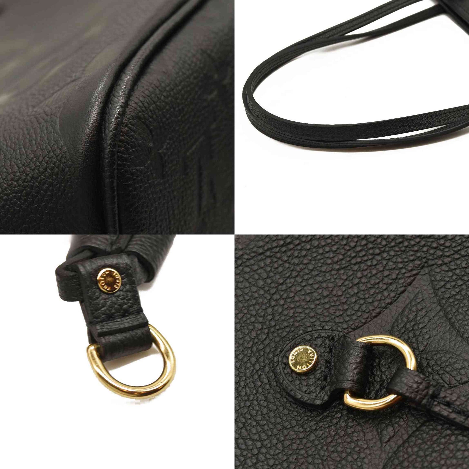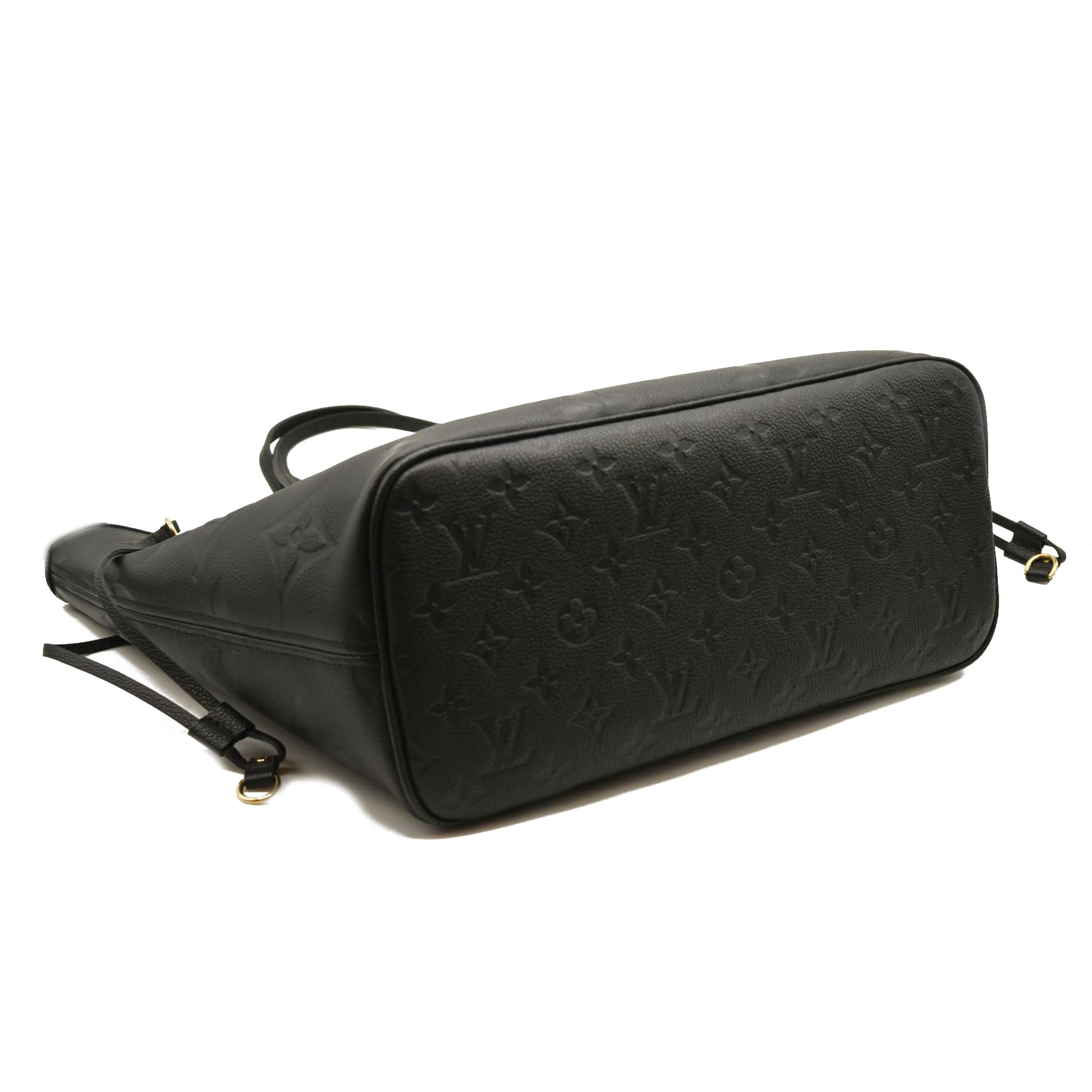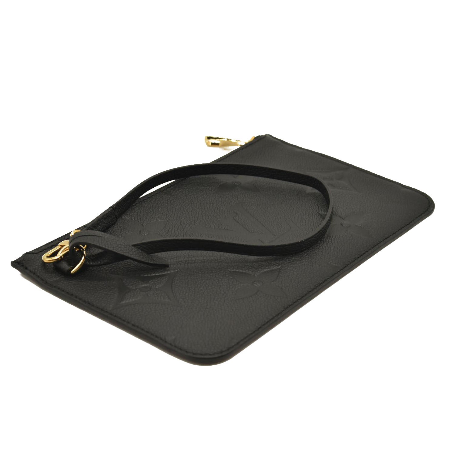 This is an authentic LOUIS VUITTON Empreinte Monogram Neverfull MM in Black. This spacious city tote is crafted of black monogram embossed calf leather. The bag features leather top handles and polished gold tone hardware with four side laces for cinching. The top is open to a spacious dark blue microfiber interior with a hanging zipper pocket, and includes a matching zippered pochette with a removable wrist strap.