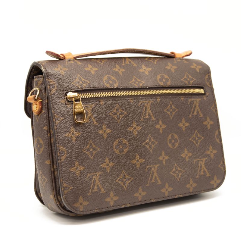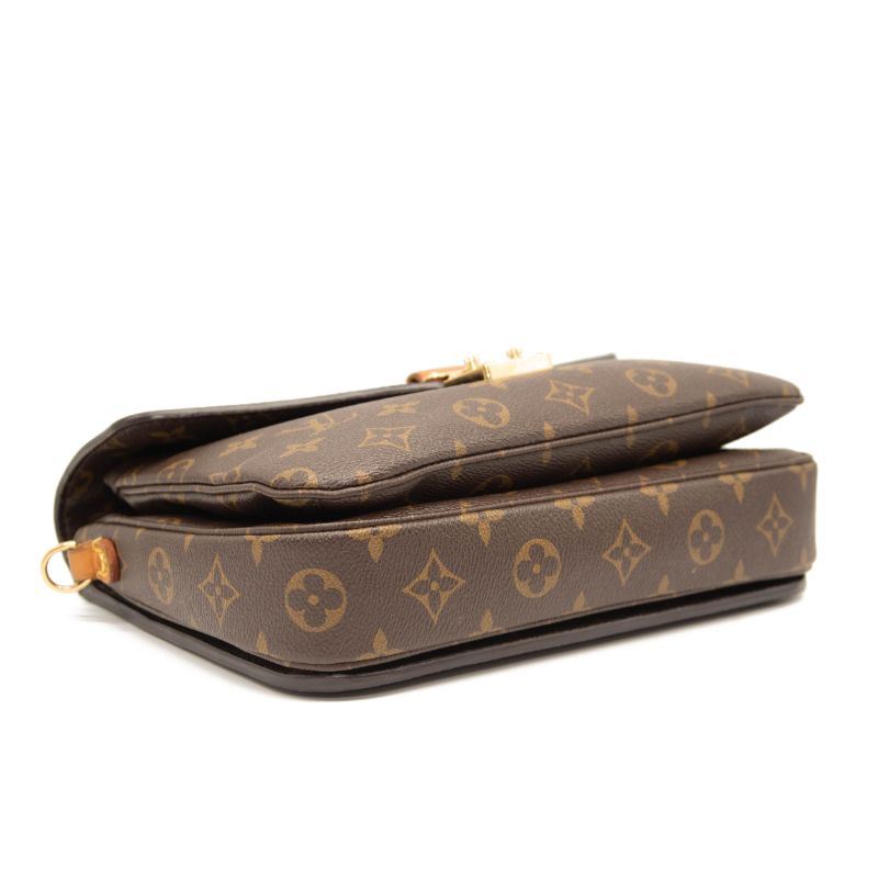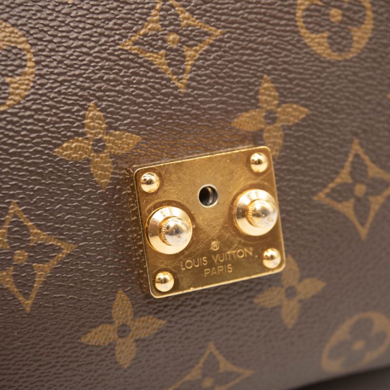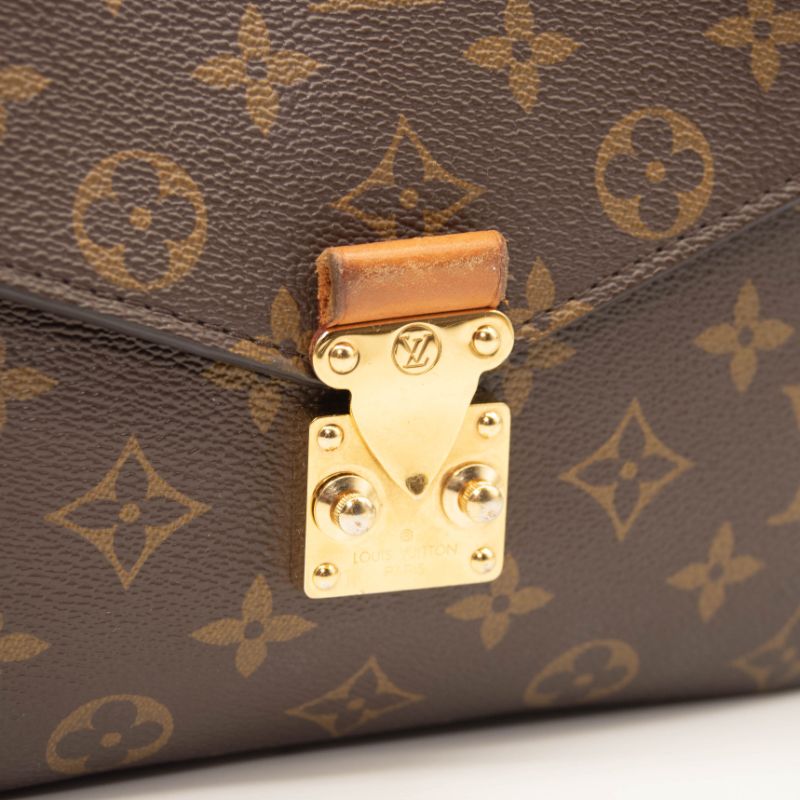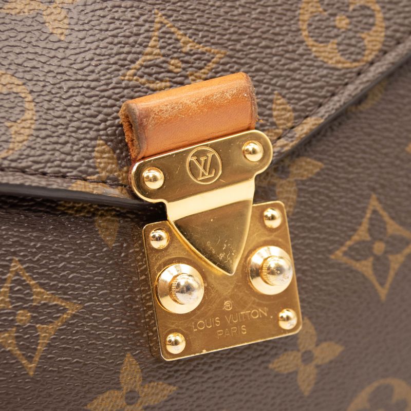 This is an authentic LOUIS VUITTON Monogram Pochette Metis. This chic handbag is finely crafted of classic Louis Vuitton monogram toile canvas. The bag features a vachetta cowhide leather top handle, an optional monogram coated canvas shoulder strap, and a rear zipper pocket. The envelope-style crossover flap opens with a polished brass S-lock to a partitioned brown microfiber interior.