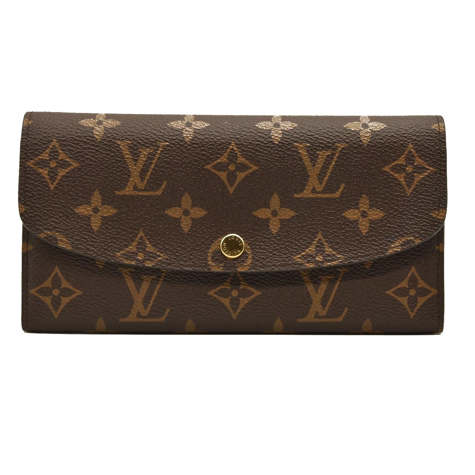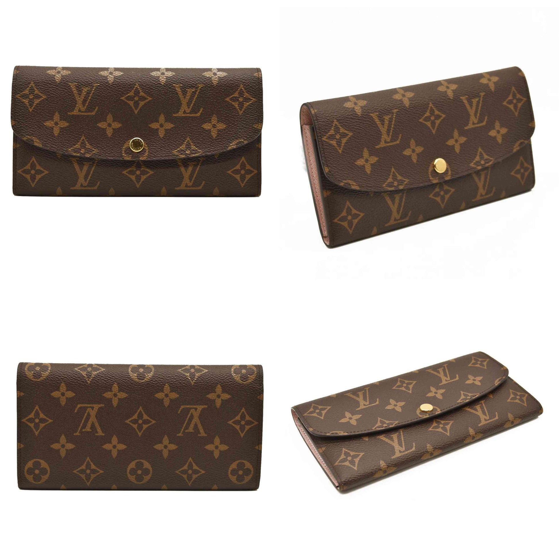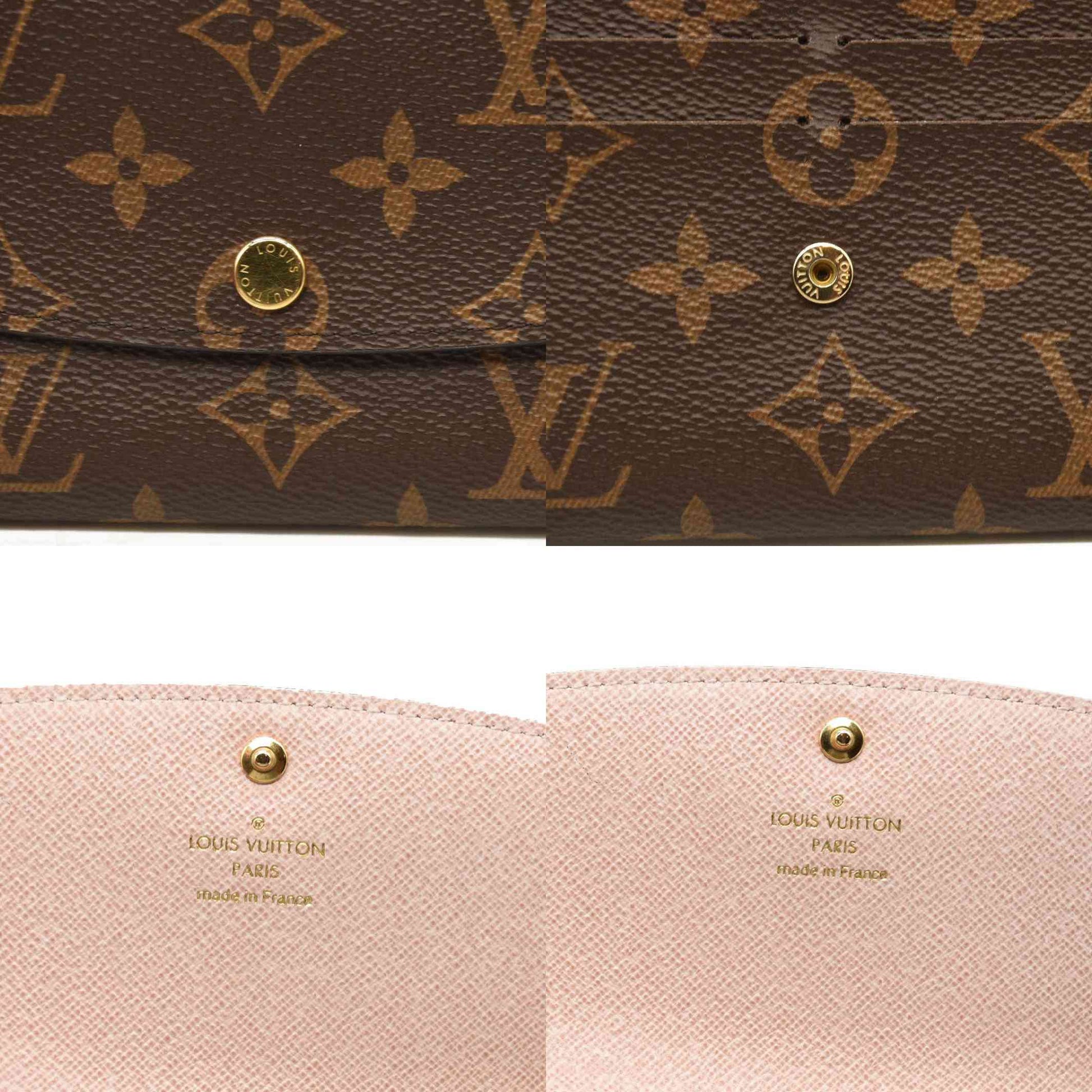 This is an authentic LOUIS VUITTON Monogram Emilie Wallet in Rose Ballerine. This stylish wallet is crafted of classic Louis Vuitton brown monogram canvas and features an envelope-style flap with a ballerina pink snap. This opens to a soft pink cross-grain leather and monogram canvas interior with card slots, patch pockets, and a zipper compartment.