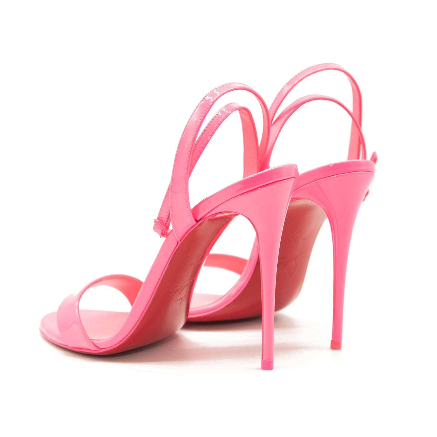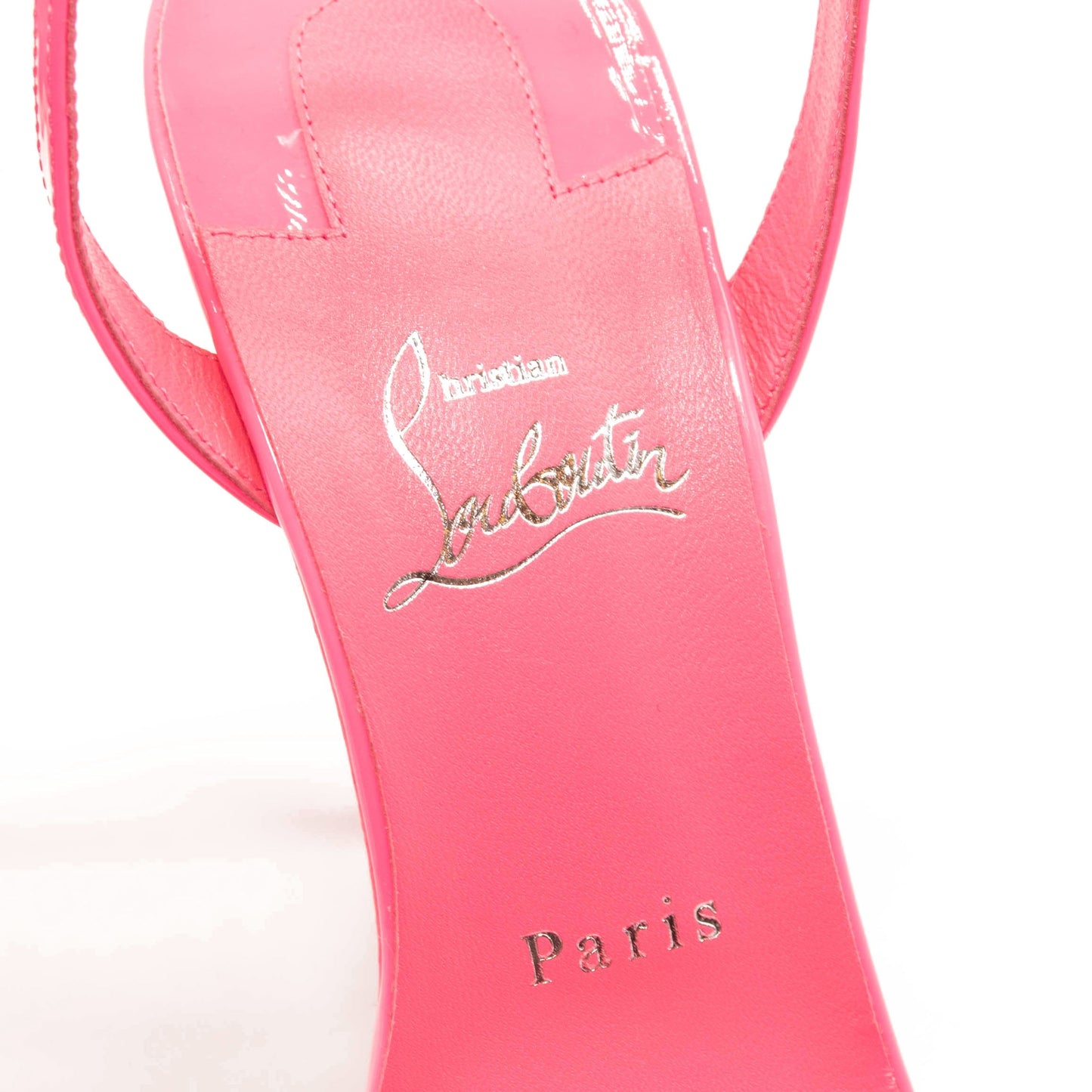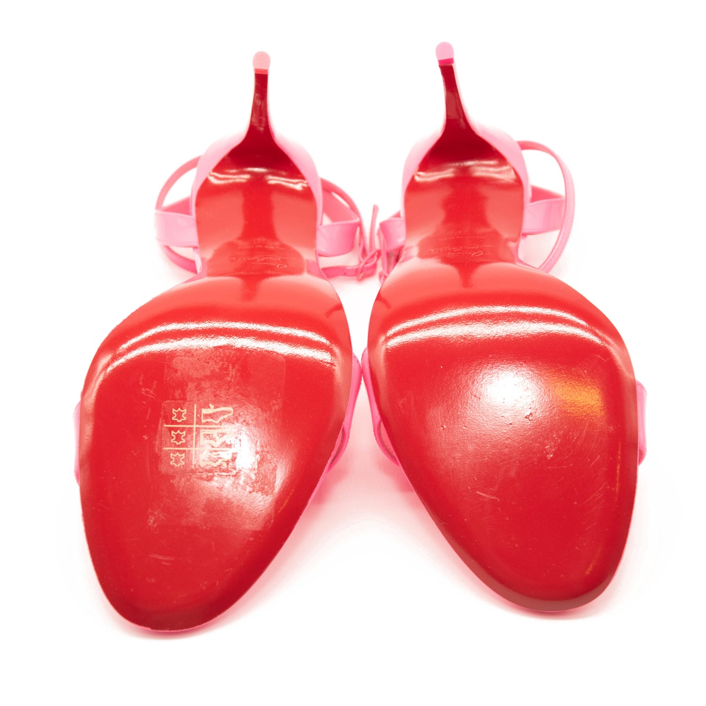 A lofty stiletto heel adds leg-lengthening lift to a glossy sandal topped with a graceful wraparound ankle strap. Christian Louboutin's iconic red sole—born from a fateful brush with red nail lacquer—adds a burst of signature color to every step.