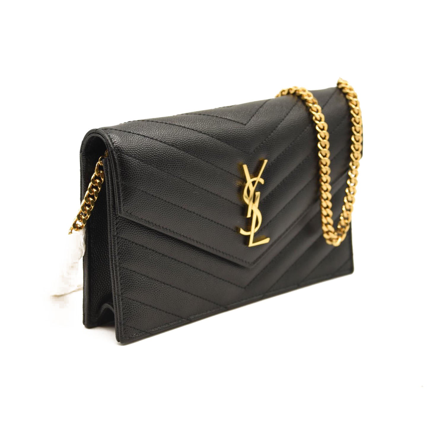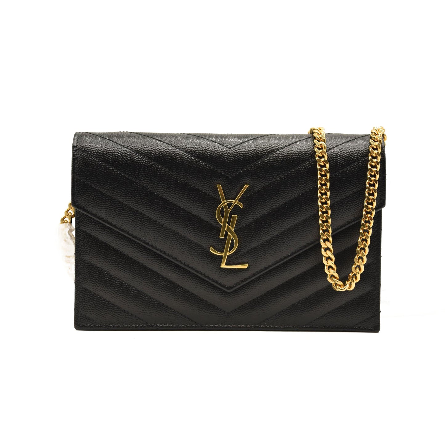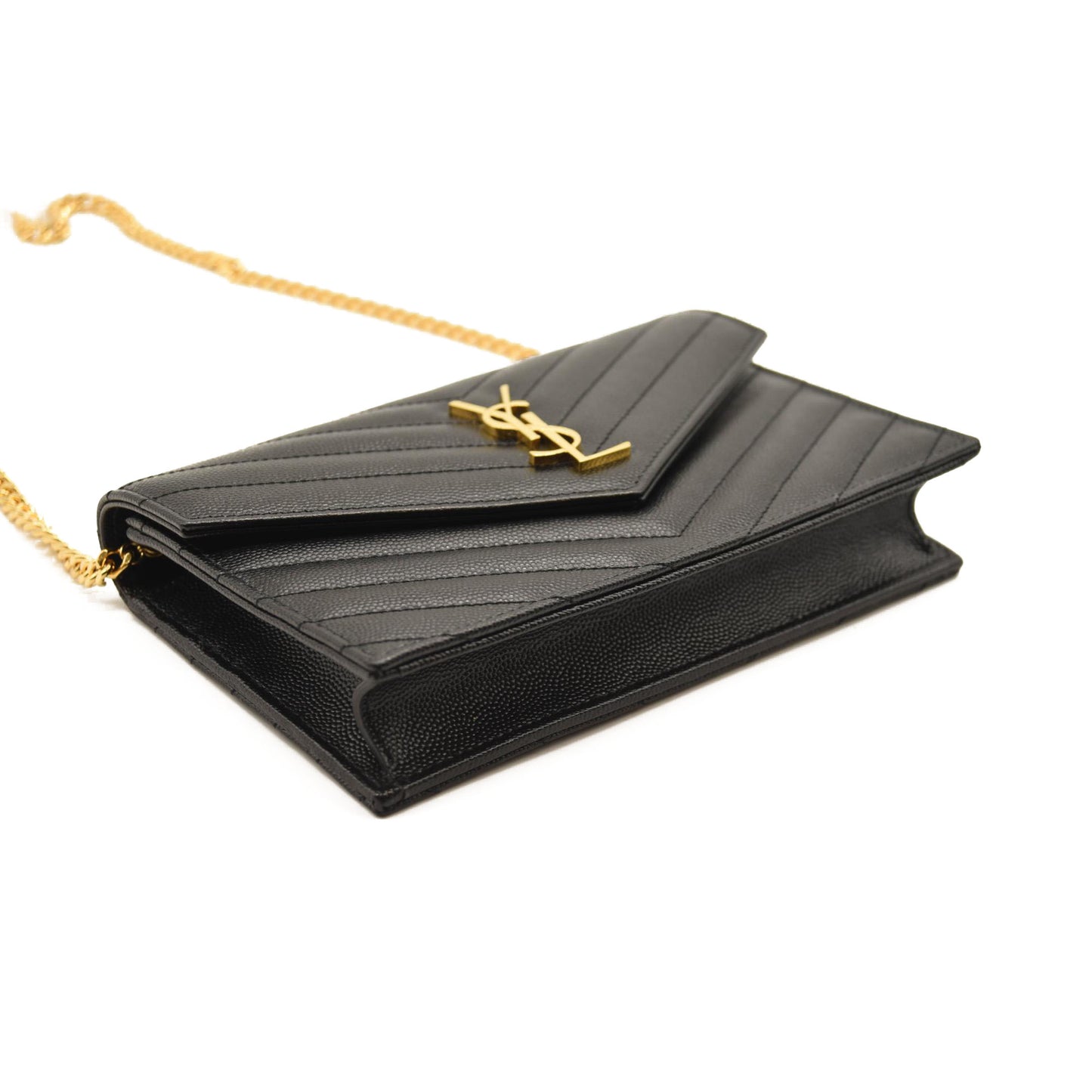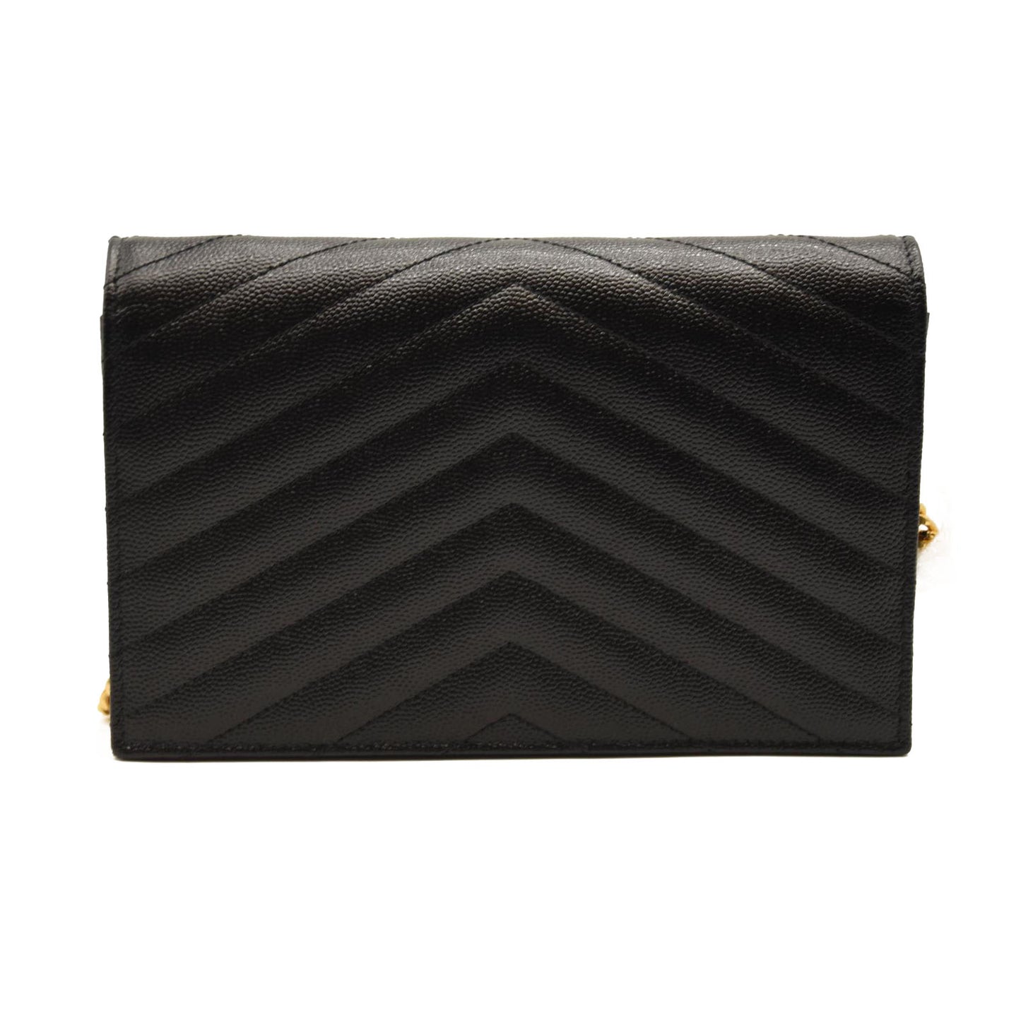 This is an authentic SAINT LAURENT Grain De Poudre Matelasse Chevron Monogram Chain Wallet in Black. This elegant wallet on a chain is crafted of finely pebbled chevron quilted leather in black. The shoulder bag features a removable waist-length bijoux gold chain shoulder strap with a shoulder pad and a gold classic YSL emblem on the flap. This opens to a black leather interior with card slots, a zipper compartment, and a pocket.