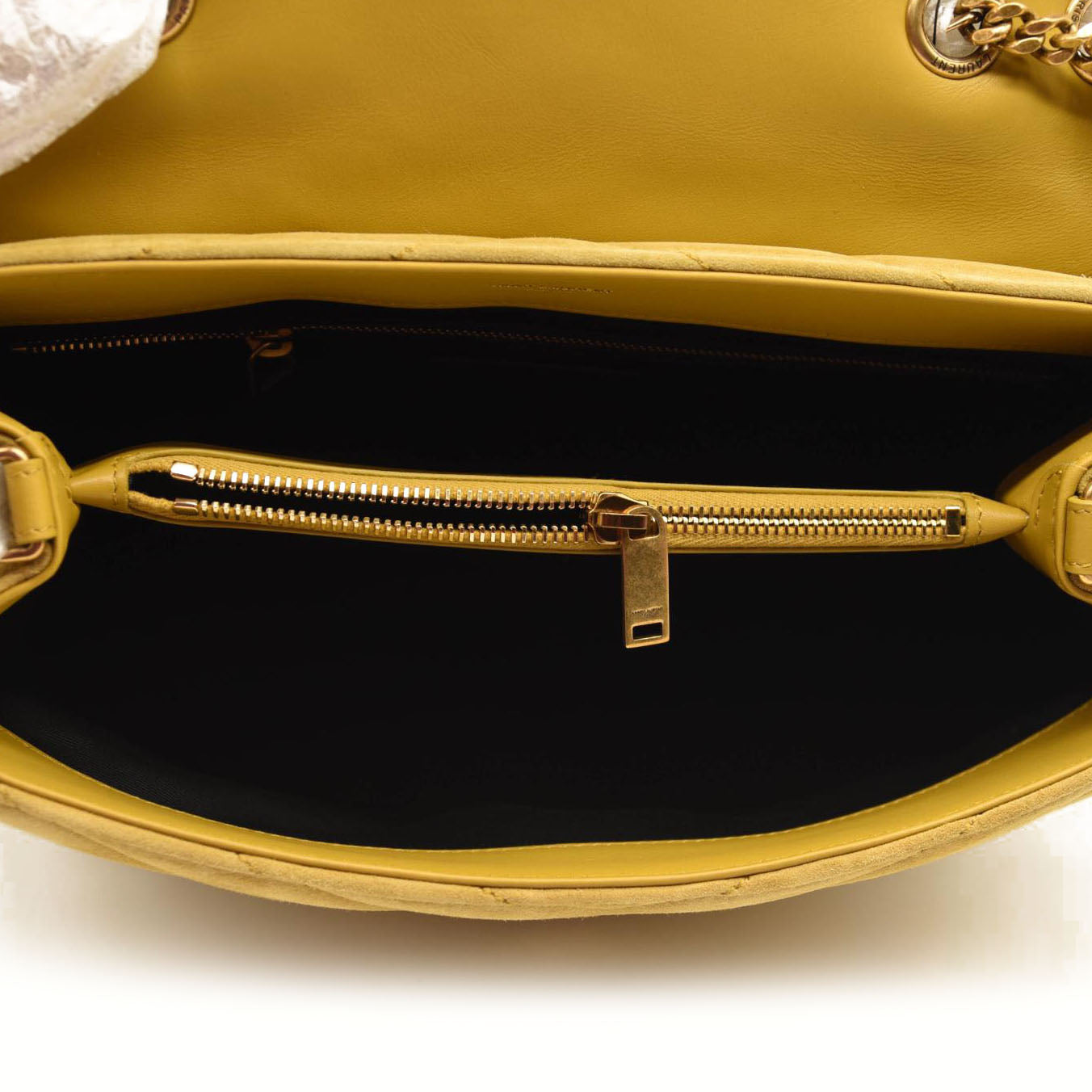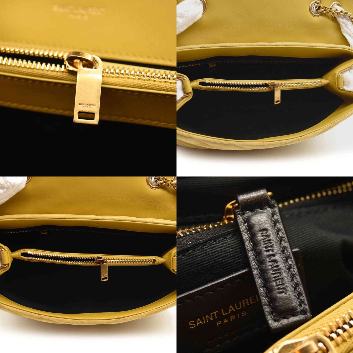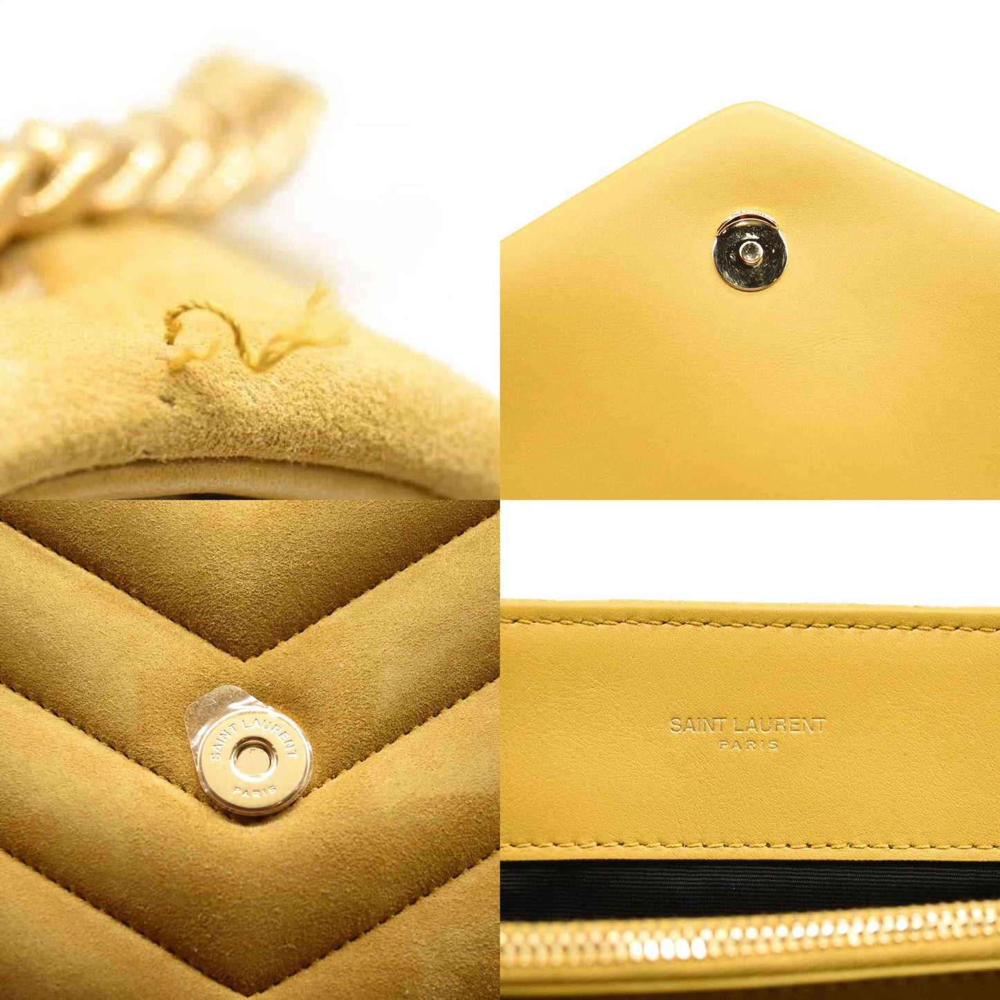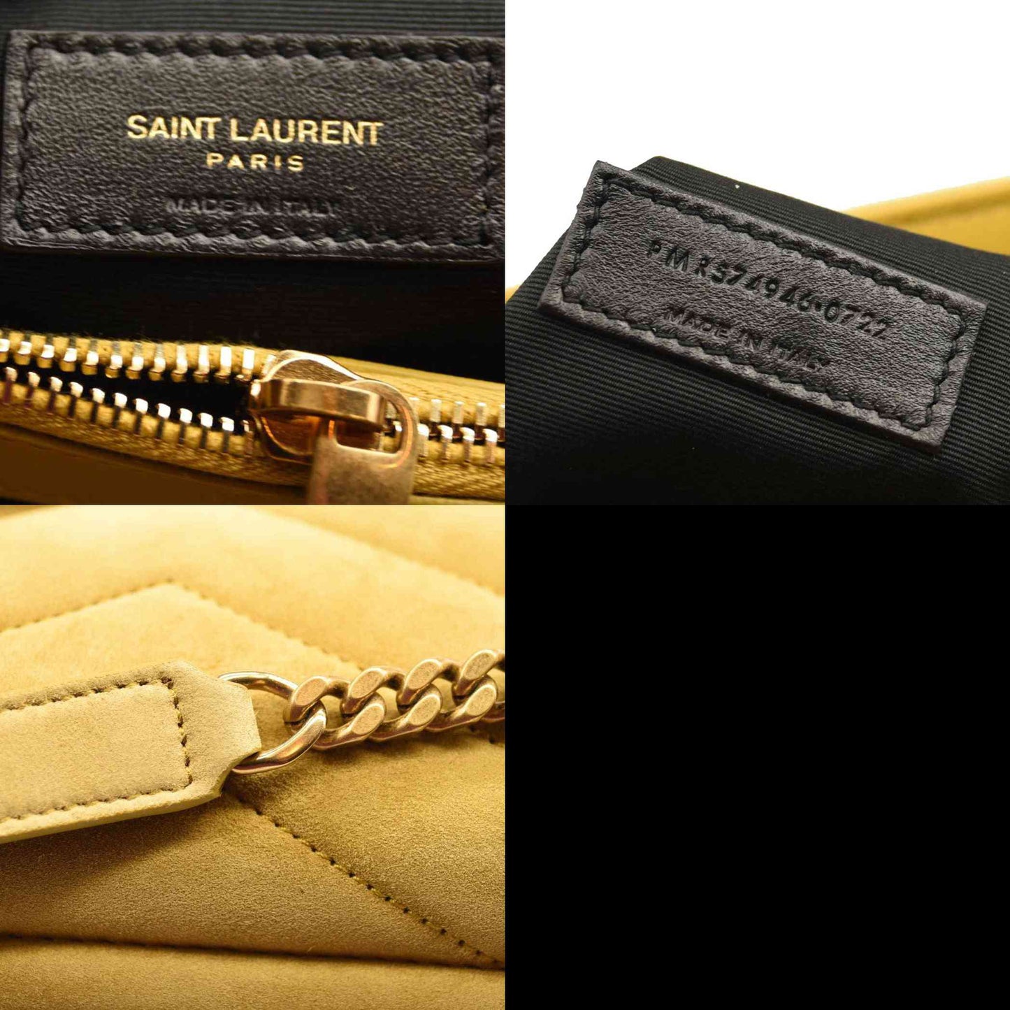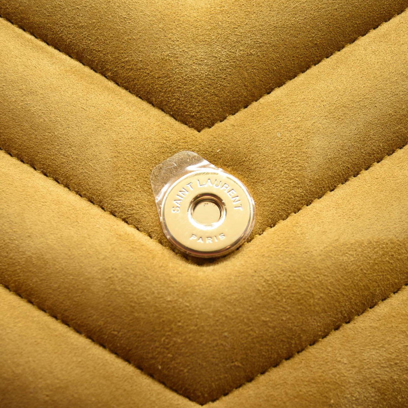 This is an authentic SAINT LAURENT Suede Y Quilted Monogram Medium Loulou Chain Satchel in Cinnamon. This elegant shoulder bag is crafted of brown chevron-quilted suede. The bag features an aged gold chain-link shoulder strap with matching shoulder pads. The front flap has a prominent gold YSL monogram detail and opens to a partitioned fabric interior with zipper and patch pockets.