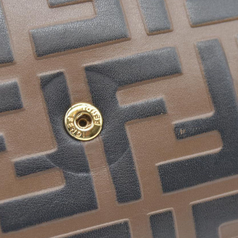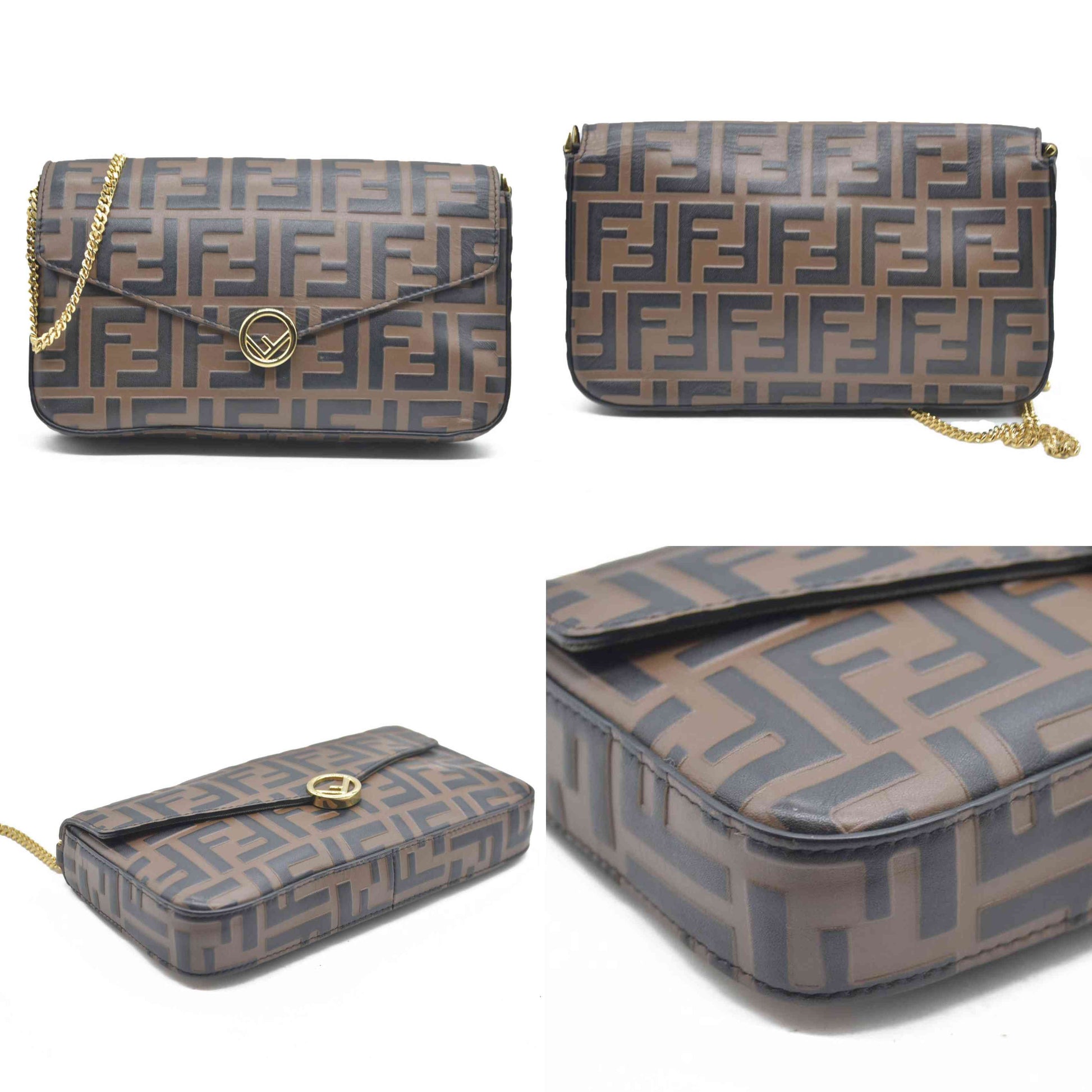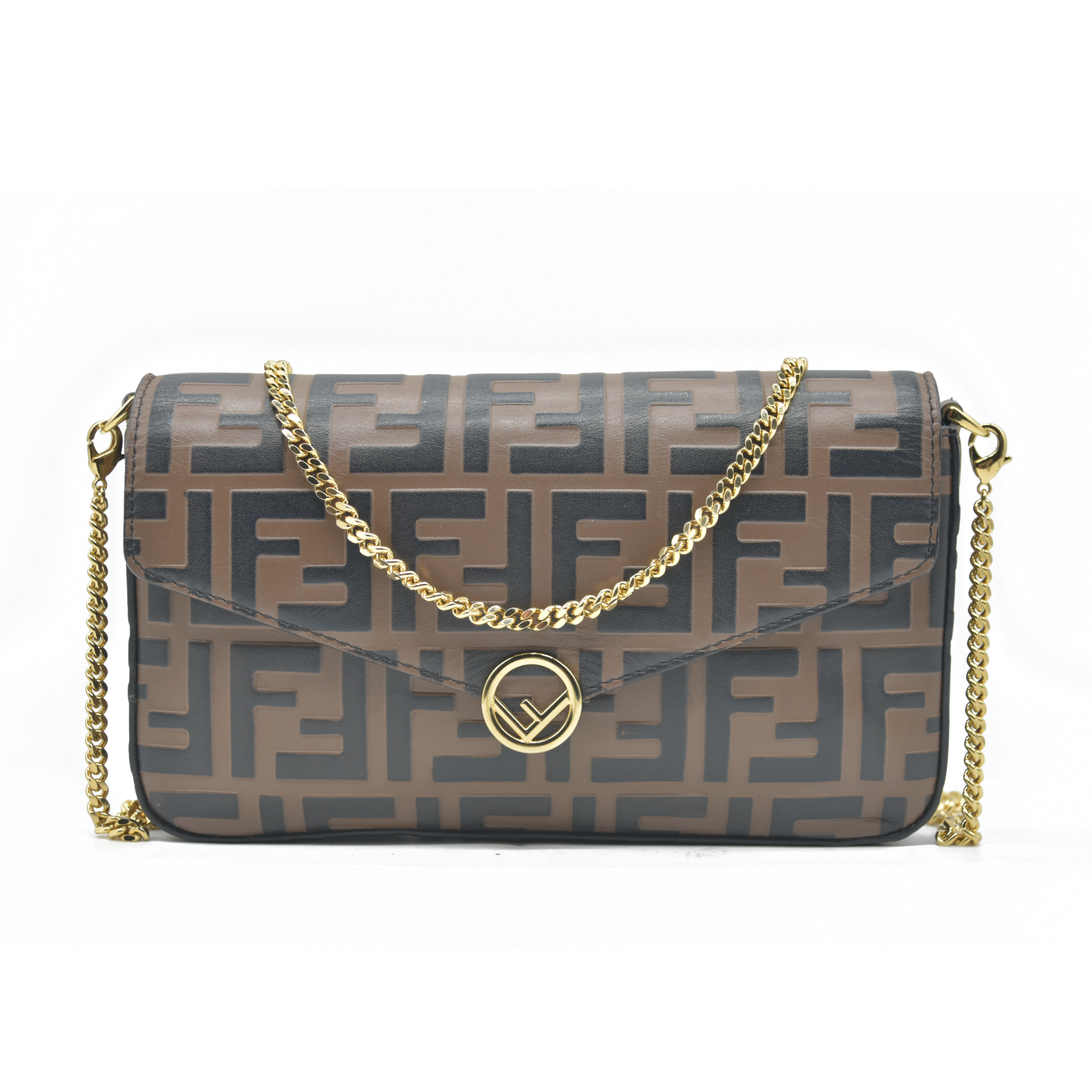 This is an authentic FENDI Vitello Soft F is Fendi Bi-Color FF 1974 Embossed Envelope Wallet On Chain with Pouches in Maya and Black. This chic wallet on a chain bag is crafted of embossed Fendi logos. The bag features a removable waist length gold chain link shoulder strap and a facing flap with a light brass F is Fendi logo. This opens to brown fabric interior with a patch pocket and two removable inserts.