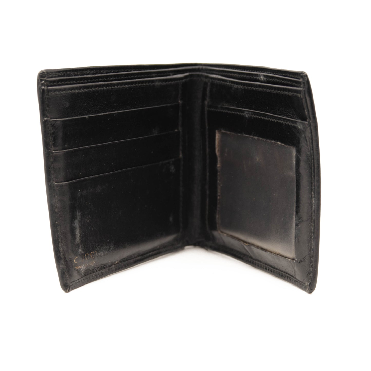 This is an authentic GUCCI Vintage Leather G Bi-Fold Wallet in Black. This stylish wallet is crafted of black leather and features a silver G monogram on the front. This wallet opens to a black leather interior with card slots and two bill compartments. This is a wonderful case for everyday conveniences, from Gucci!