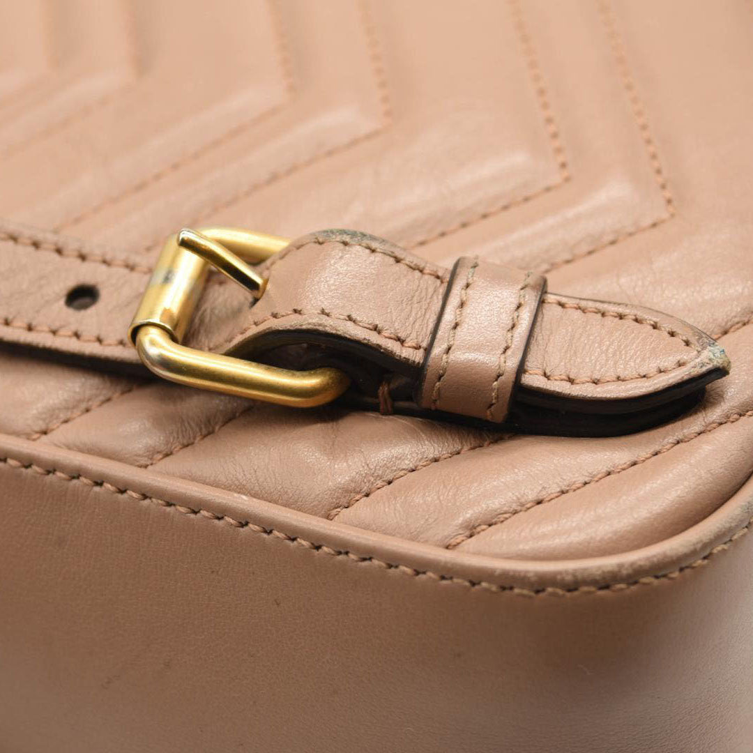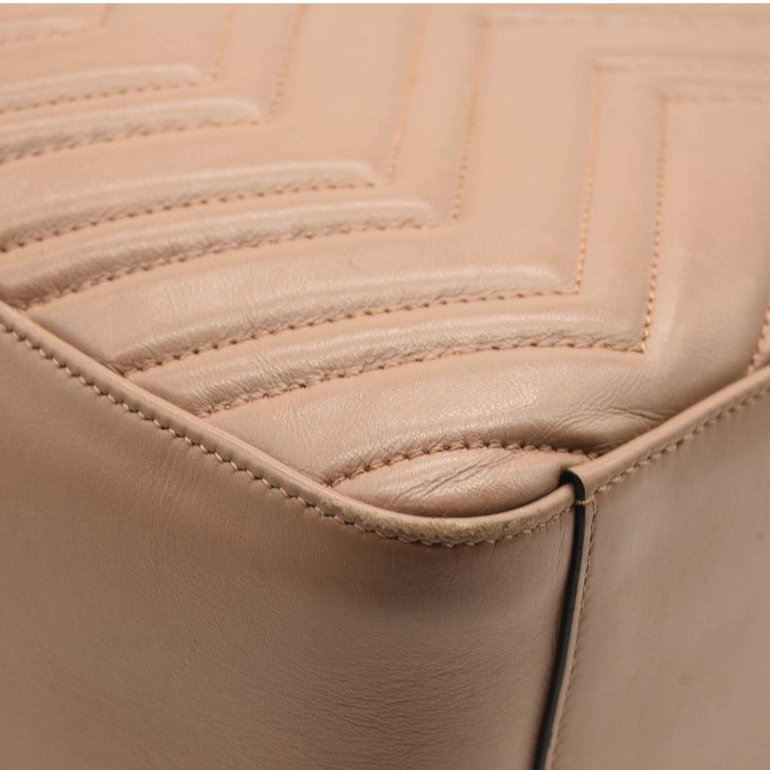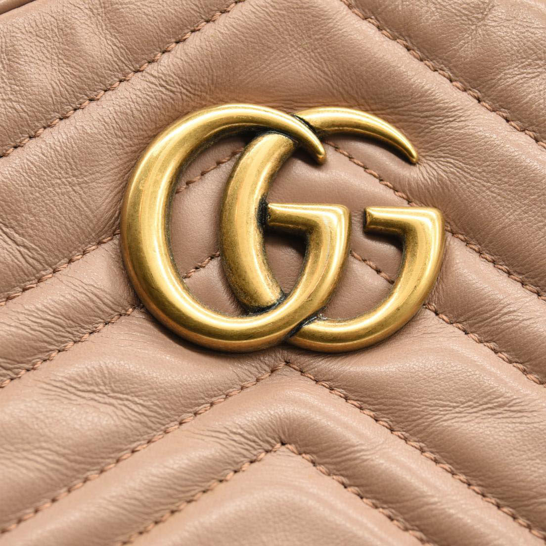 This is an authentic GUCCI Calfskin Matelasse GG Marmont Backpack in Porcelain Rose. This backpack is crafted of supple chevron quilted calfskin leather in pink. This bag features a matching leather handle, 2 shoulder straps, an interlocking aged gold GG logo and an aged gold zipper that opens to a pink microfiber interior with patch pockets.