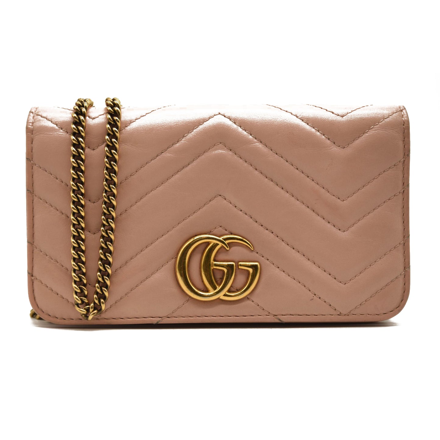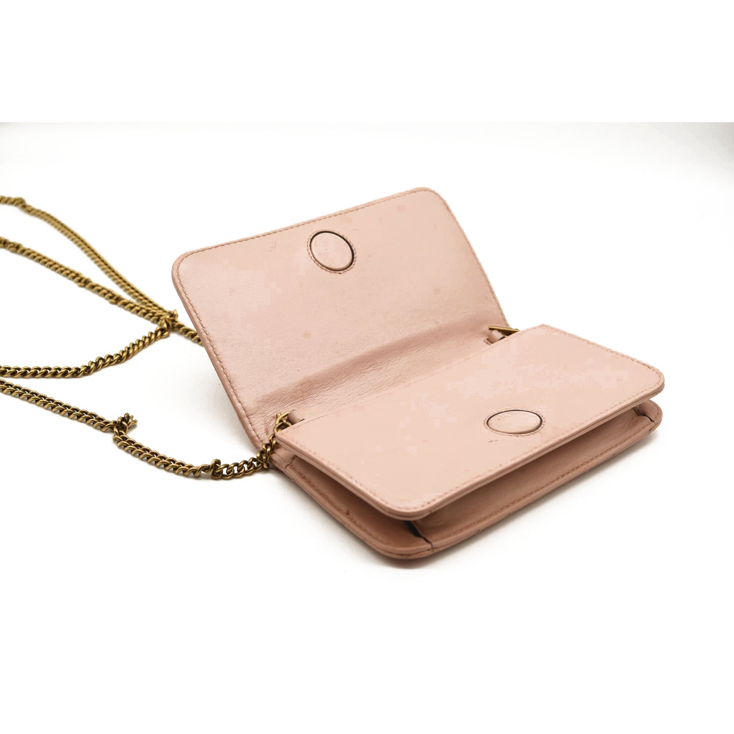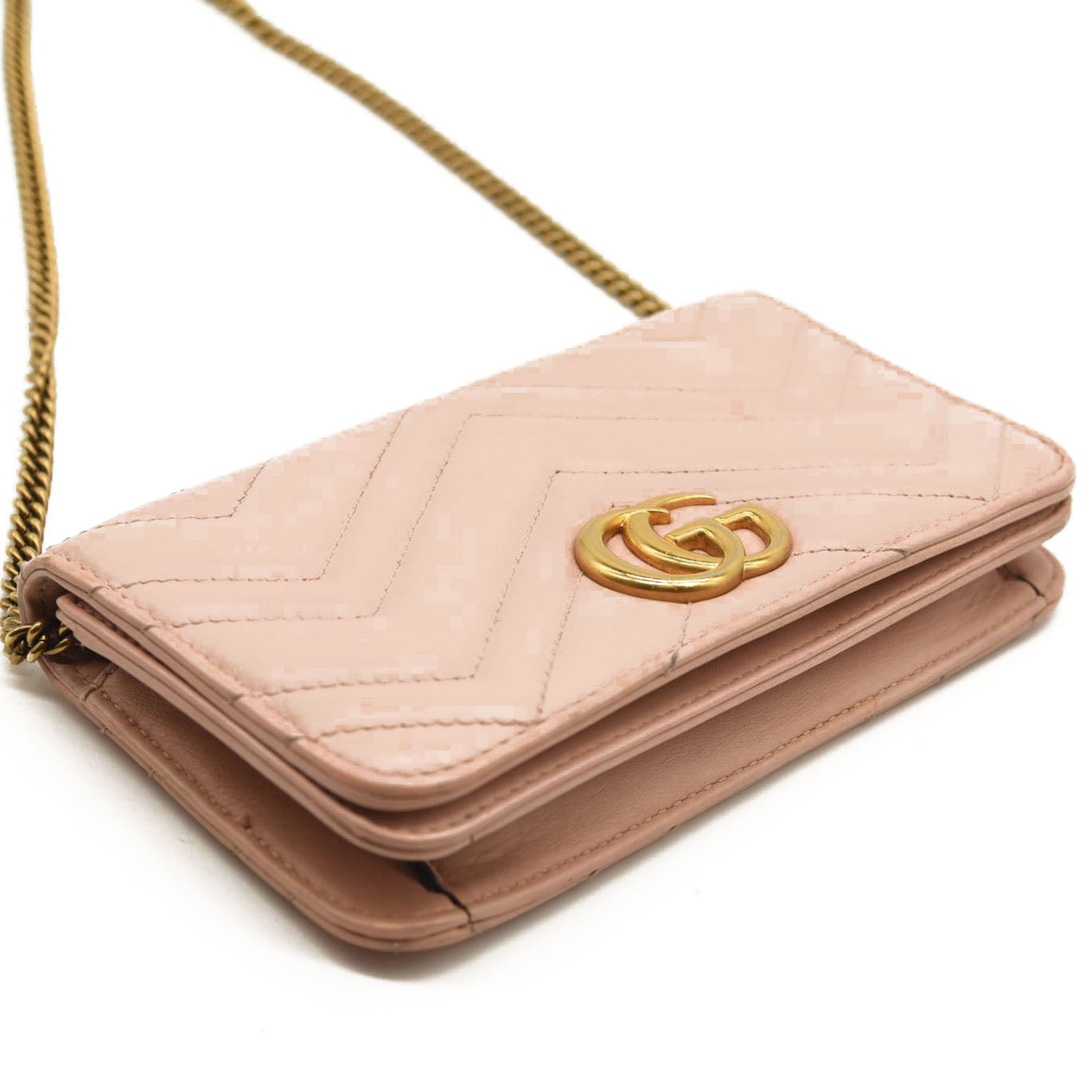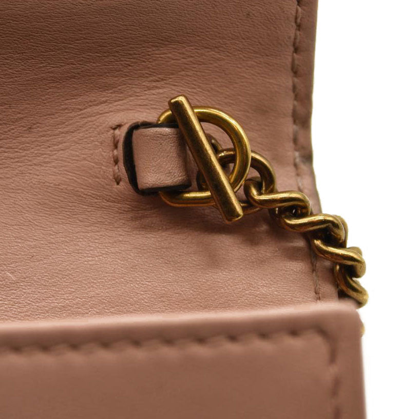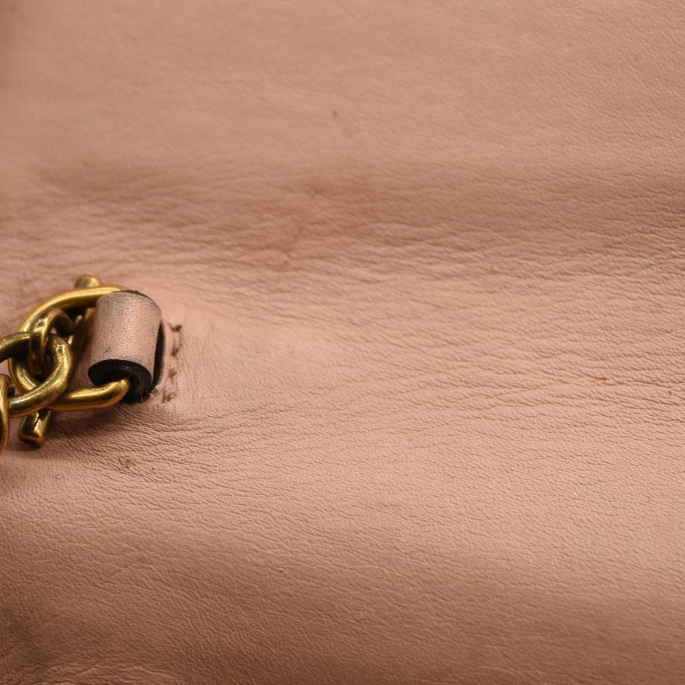 This is an authentic GUCCI Calfskin Matelasse GG Mini Shoulder Bag in Pink. This shoulder bag is crafted of smooth calfskin leather in light pink. This bag features an optional aged gold chain shoulder strap, and an interlocking GG logo on the front. The bag opens to a grey microfiber interior with a removable key ring clasp. This compact, yet spacious shoulder bag is perfect for anytime of the day, from Gucci!