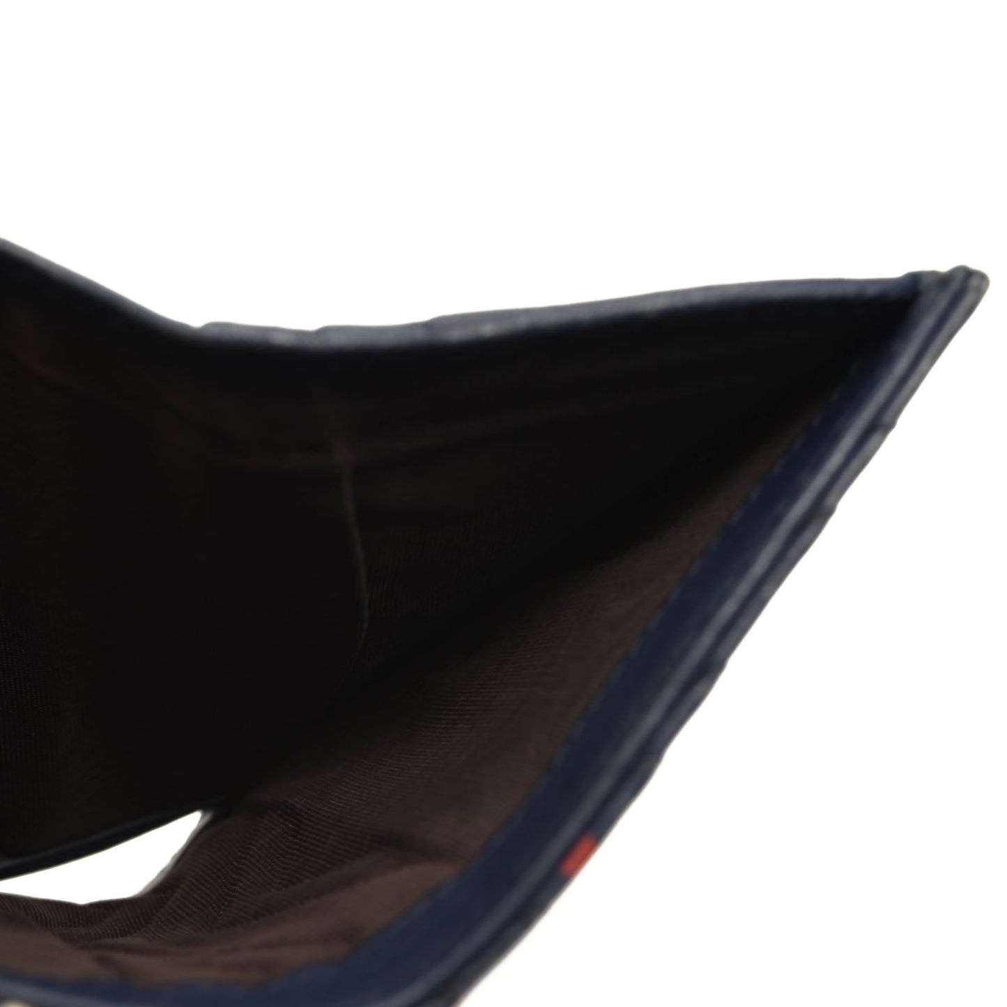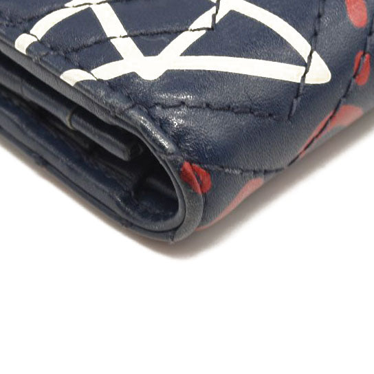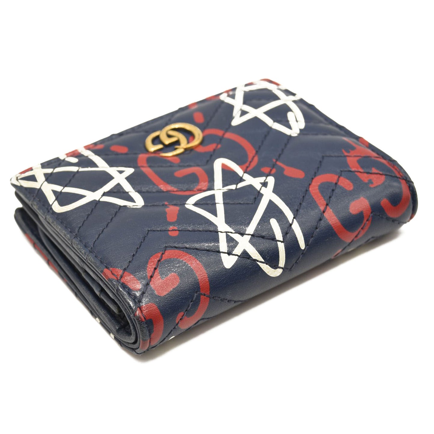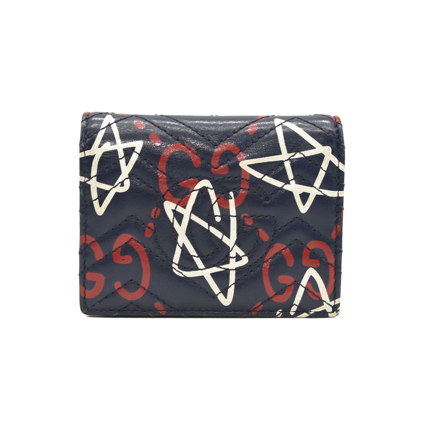 This is an authentic GUCCI Calfskin Matelasse Ghost GG Marmont Card Case Wallet in Navy. This compact stylish cardholder is crafted of black calfskin leather with an overlay print of white stars and Gucci GG red monogram print. The wallet snaps open to a blue leather interior with a pocket, card slots and a bill fold.