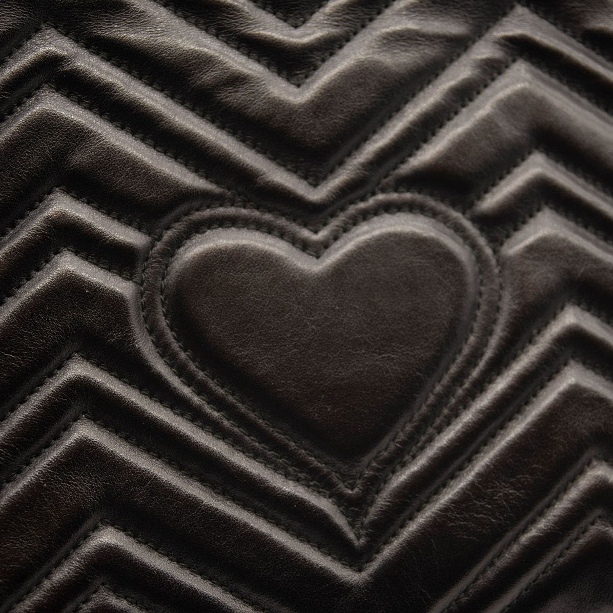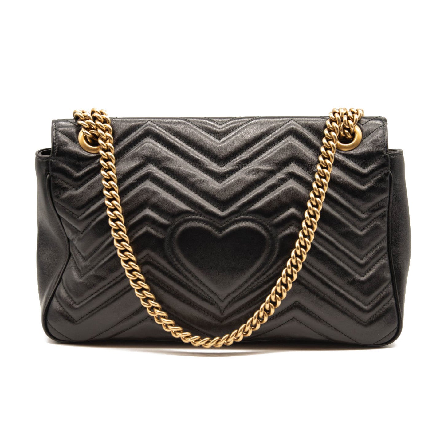 This is an authentic GUCCI Calfskin Medium GG Marmont Matelasse Shoulder Bag in Black. This shoulder bag is made out of soft calfskin leather in black. This handbag features antiqued gold chain shoulder straps, antiqued gold hardware, an interlocking GG logo closure and a stitched heart on the back. The top opens to a beige fabric interior with a zipper and patch pocket. This is the perfect everyday shoulder bag, from Gucci!