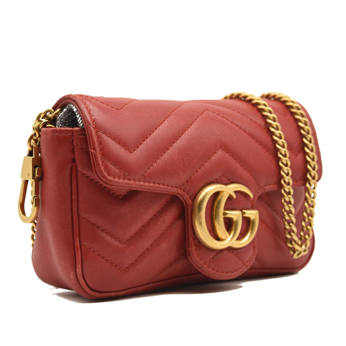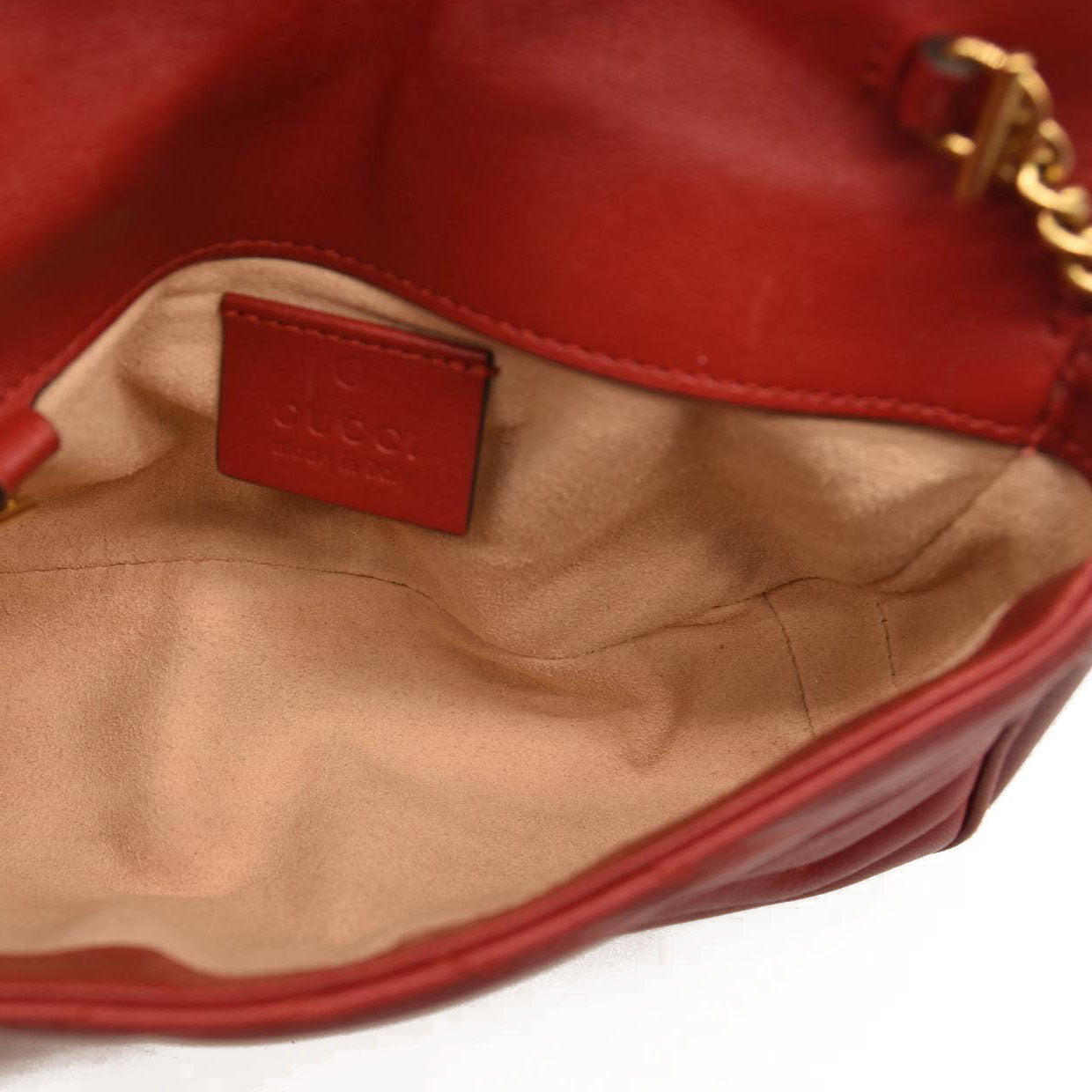 This is an authentic GUCCI Calfskin Matelasse Small GG Marmont Shoulder Bag in Hibiscus Red. This shoulder bag is crafted of smooth and supple calfskin leather in red. This bag features an aged gold chain and leather shoulder strap. The front flap has a double GG logo and opens to a beige suede interior with a zipper pocket.