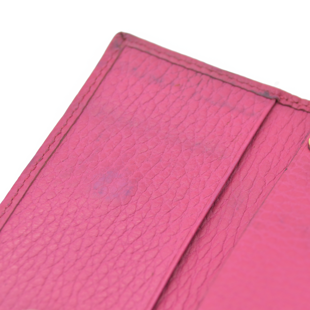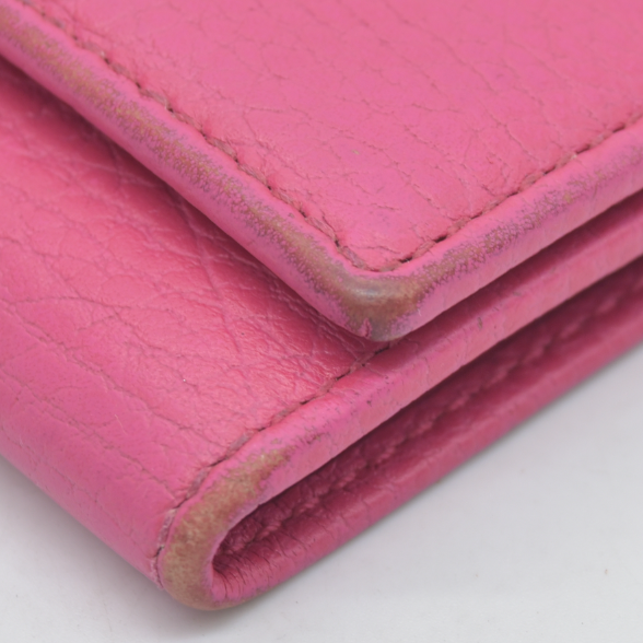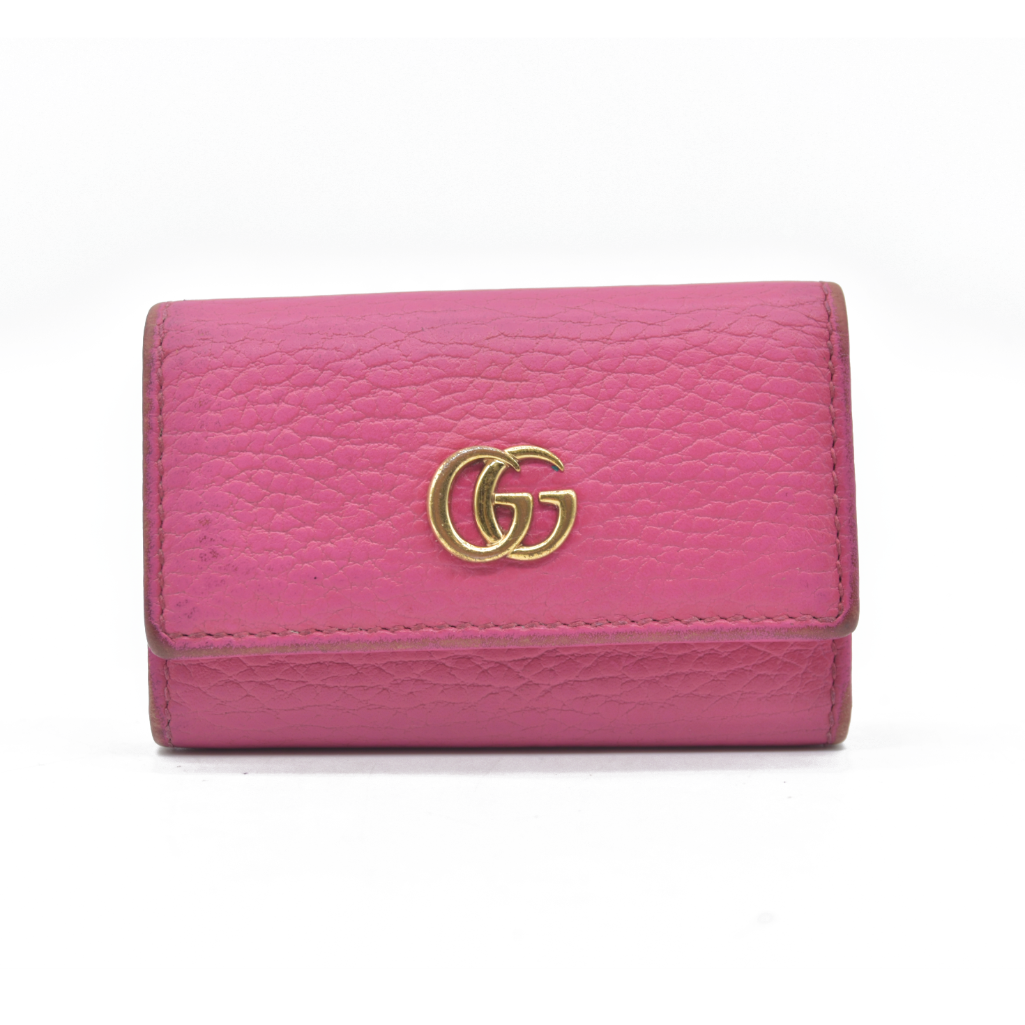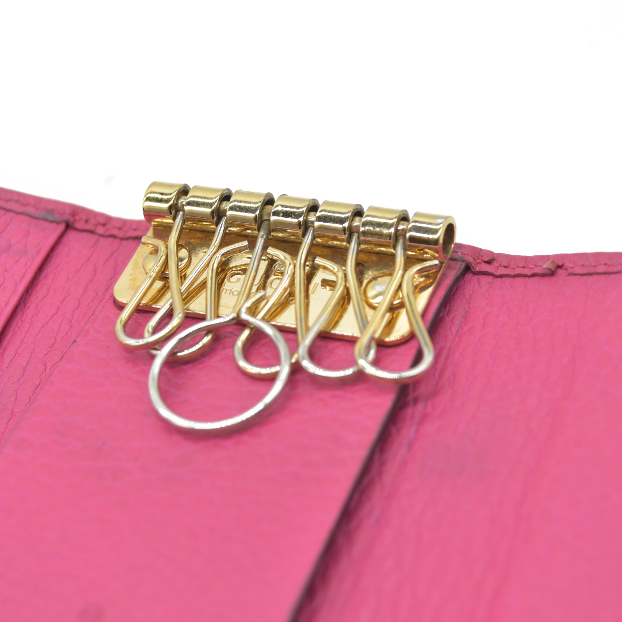 Pink Gucci leather 6 key holder with gold-tone hardware, snap closure and running GG logo.