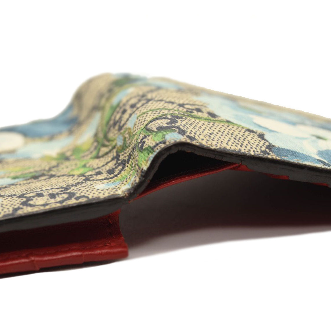 This is an authentic GUCCI GG Supreme Monogram Blooms Print Card Case Wallet in Blue. This petite, yet stylish case is crafted of Guccissima GG monogram coated canvas. The case features a beautiful print of various types of flowers throughout, in shades of blues and whites. This wallet opens to a compact red leather interior with six card slots, patch pocket, and a built in bill flap. This is a perfect card holder with a beautiful twist of style from Gucci!