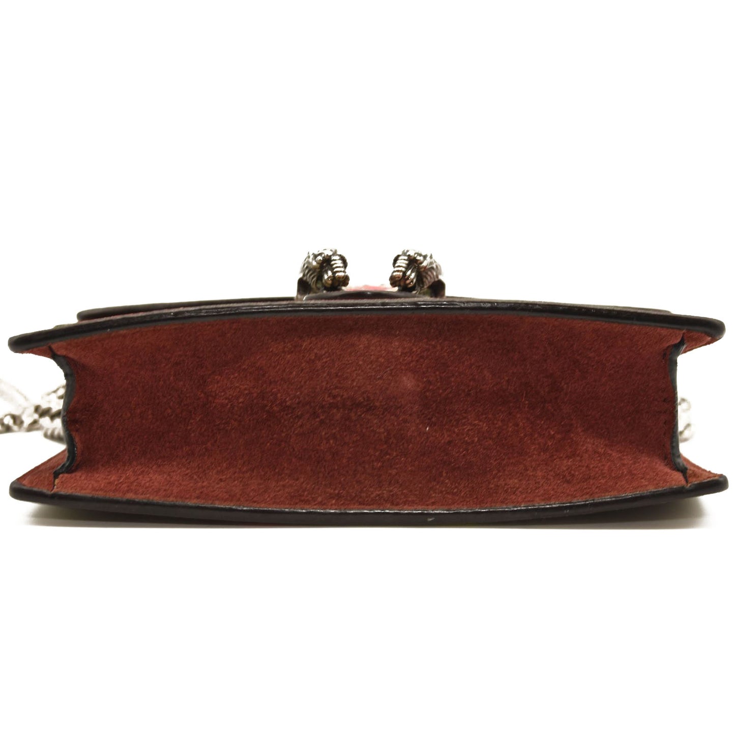 This is an authentic GUCCI GG Supreme Monogram Blooms Super Mini Dionysus Bag in Antique Rose. This stylish bag is crafted of traditional Gucci GG monogram supreme canvas with a floral print. This bag features an aged silver chain shoulder strap and a textured horseshoe tiger spur closure that opens to reveal an exterior suede flap. The flap opens to a beige interior with a key ring that can attach to a larger bag. This is a chic shoulder bag for just the essentials, with the sophistication and style of Gucci!