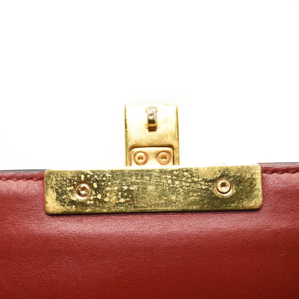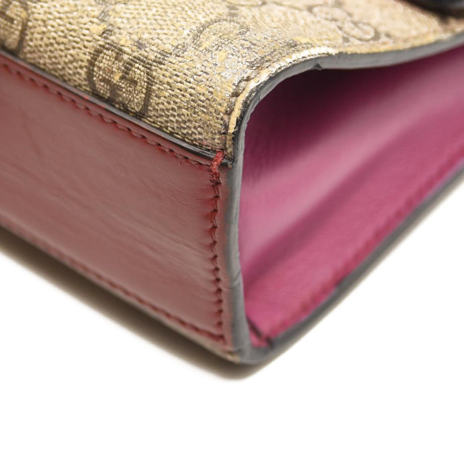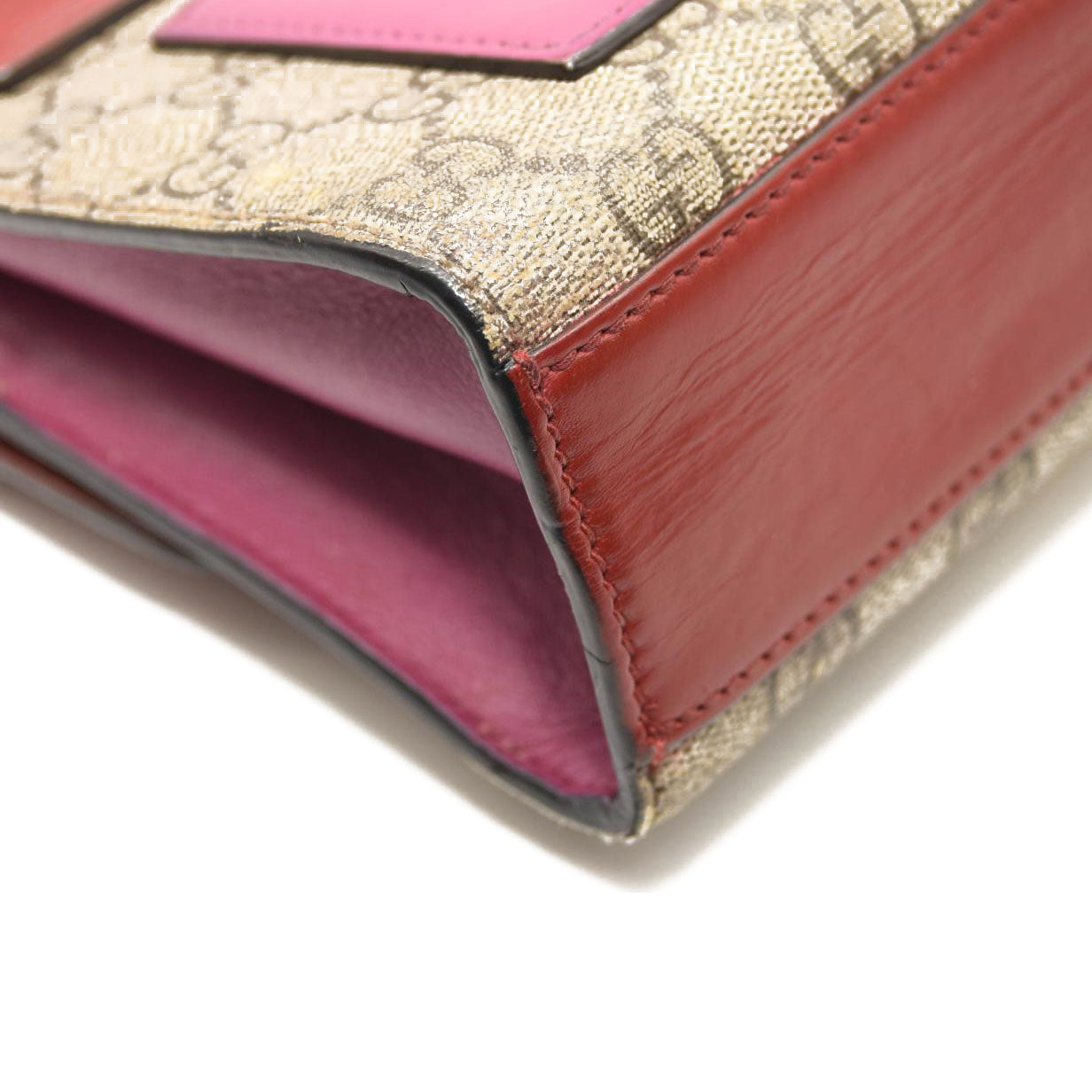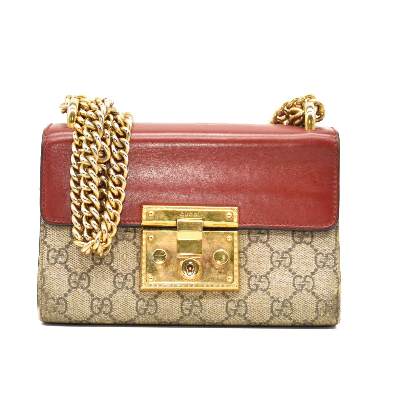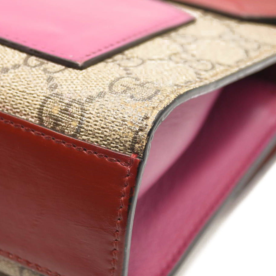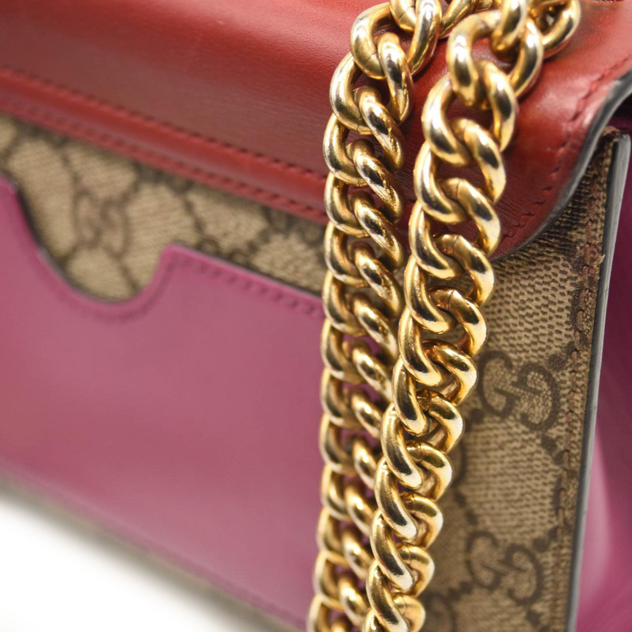 This is an authentic GUCCI GG Supreme Monogram Small Padlock Shoulder Bag in Hibiscus Pink. This stylish tote is crafted of Gucci GG monogram in brown on beige. The bag features a red leather flap and a polished gold chain shoulder strap with pink leather sides. The flap opens to an beige suede interior with a patch pocket. This is an ideal everyday bag with the sophisticated style of Gucci!