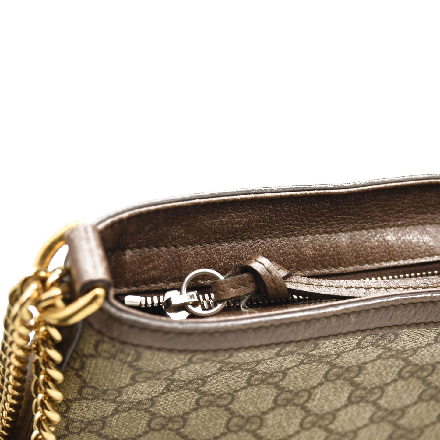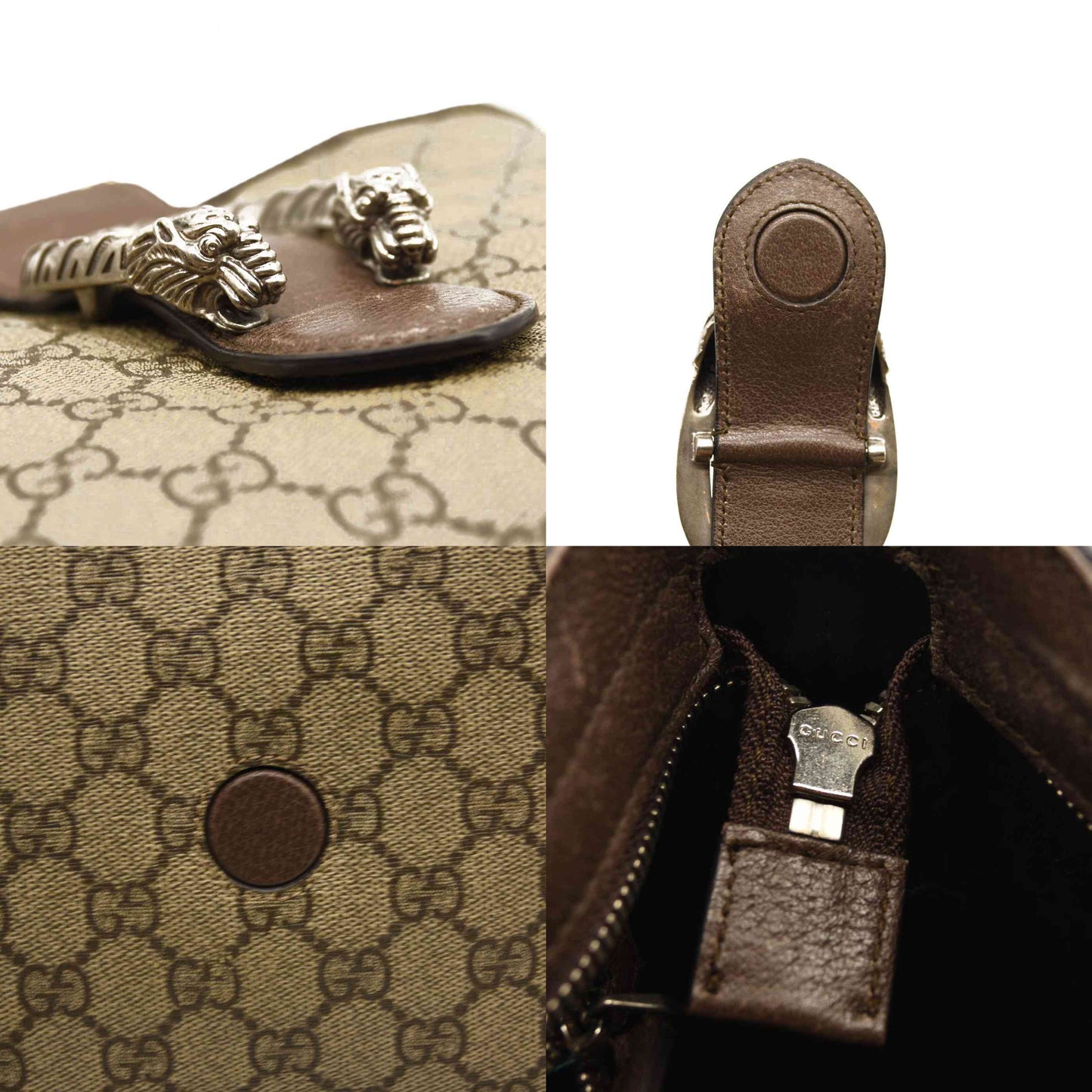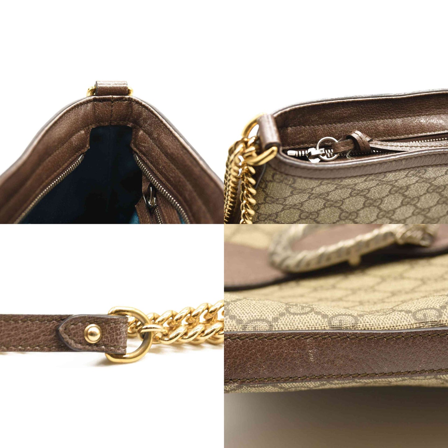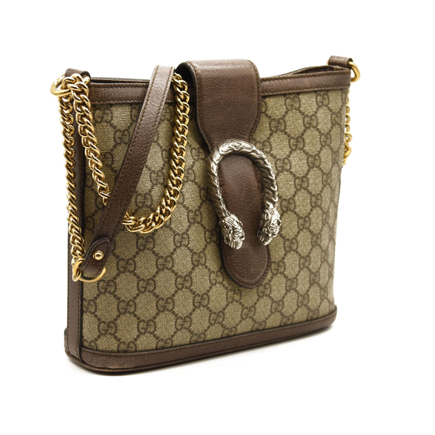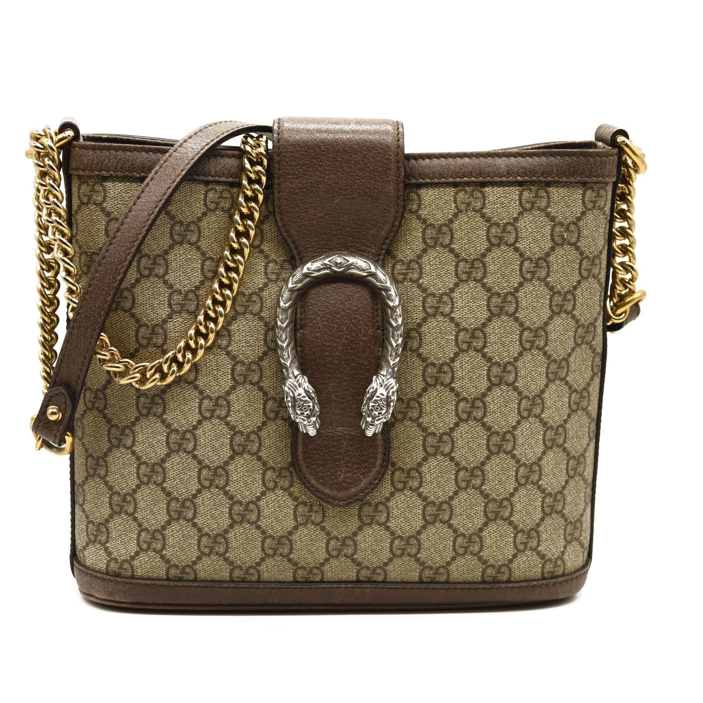 This is an authentic GUCCI GG Supreme Monogram Medium Dionysus Bucket Bag in Beige and New Acero. This stylish bag is crafted of Gucci GG monogram canvas with dark brown textured leather trim. This bag features a gold chain link shoulder strap with a leather shoulder pad and a textured silver horseshoe closure with lion heads at the end. The cross body opens to a turquoise satin interior with zipper and patch pockets.