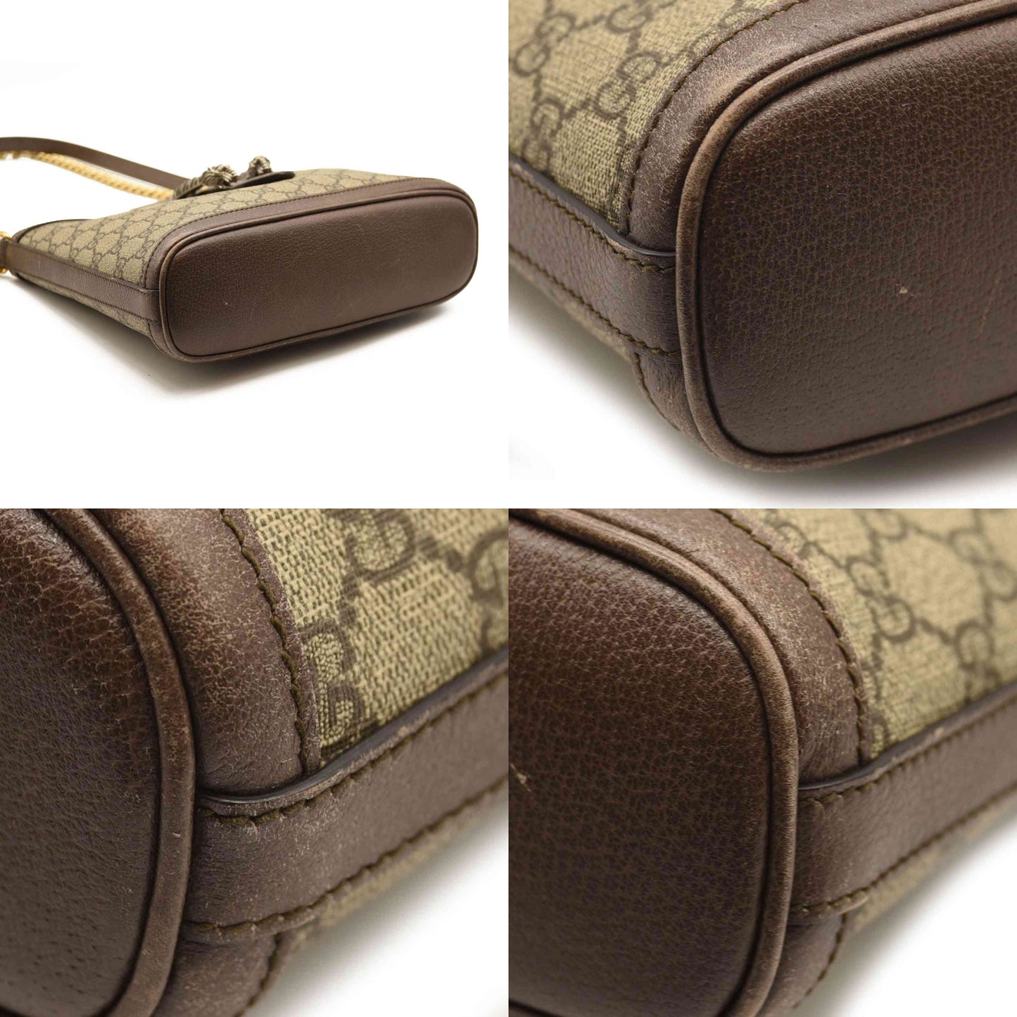 Exterior: Corner wear, creases, minor edge wear, stretched leather/canvas, faint scuffs