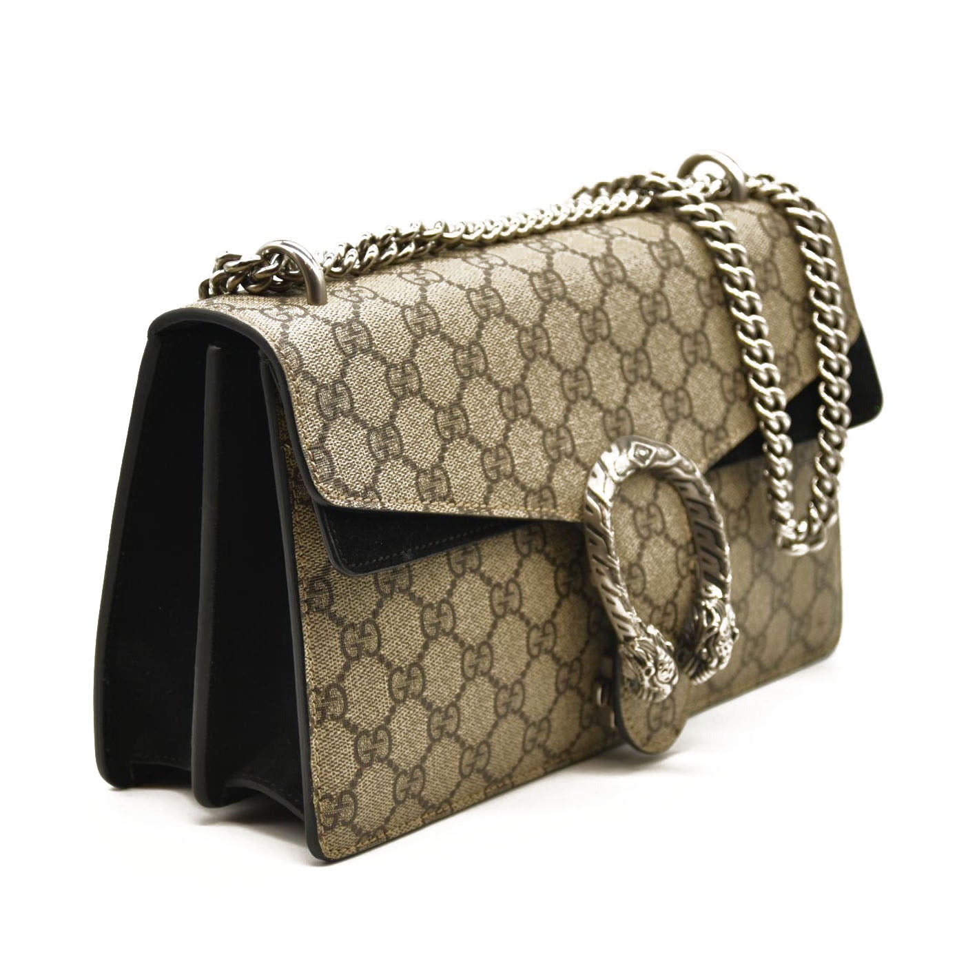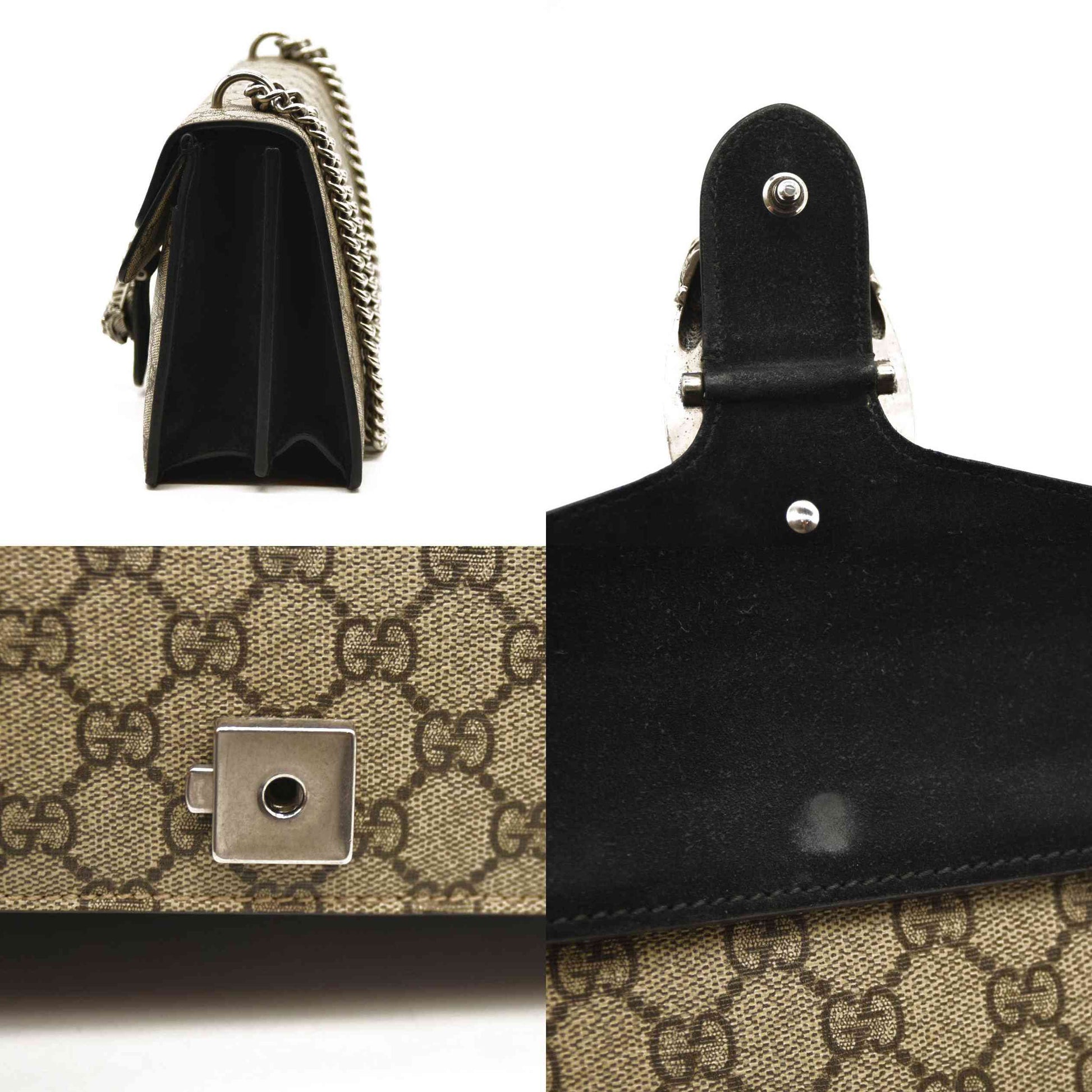 This is an authentic GUCCI GG Supreme Monogram Small Dionysus Shoulder Bag Black. This bag is crafted of Gucci GG monogram canvas. It features a second flap of black suede, a silver chain shoulder strap, and a textured horseshoe closure with tiger heads at the end. This opens to a black suede and coated canvas interior with a central zipper pocket.
