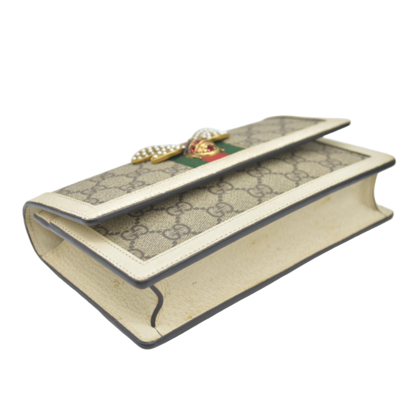 This is an authentic GUCCI GG Supreme Monogram Web Mini Queen Margaret Bag in White. This shoulder bag is crafted of monogram coated canvas. The shoulder bag features a white leather trim, an aged-gold cross body chain and a front flap with an enameled aged gold metallic bee encrusted with small pearls and faceted stones. The bag opens to a leather and fabric interior and card slots with zipper and patch pockets. This compact, yet spacious shoulder bag is perfect for anytime of the day, from Gucci!