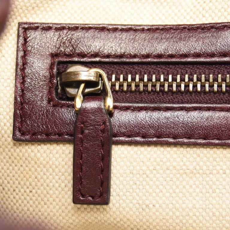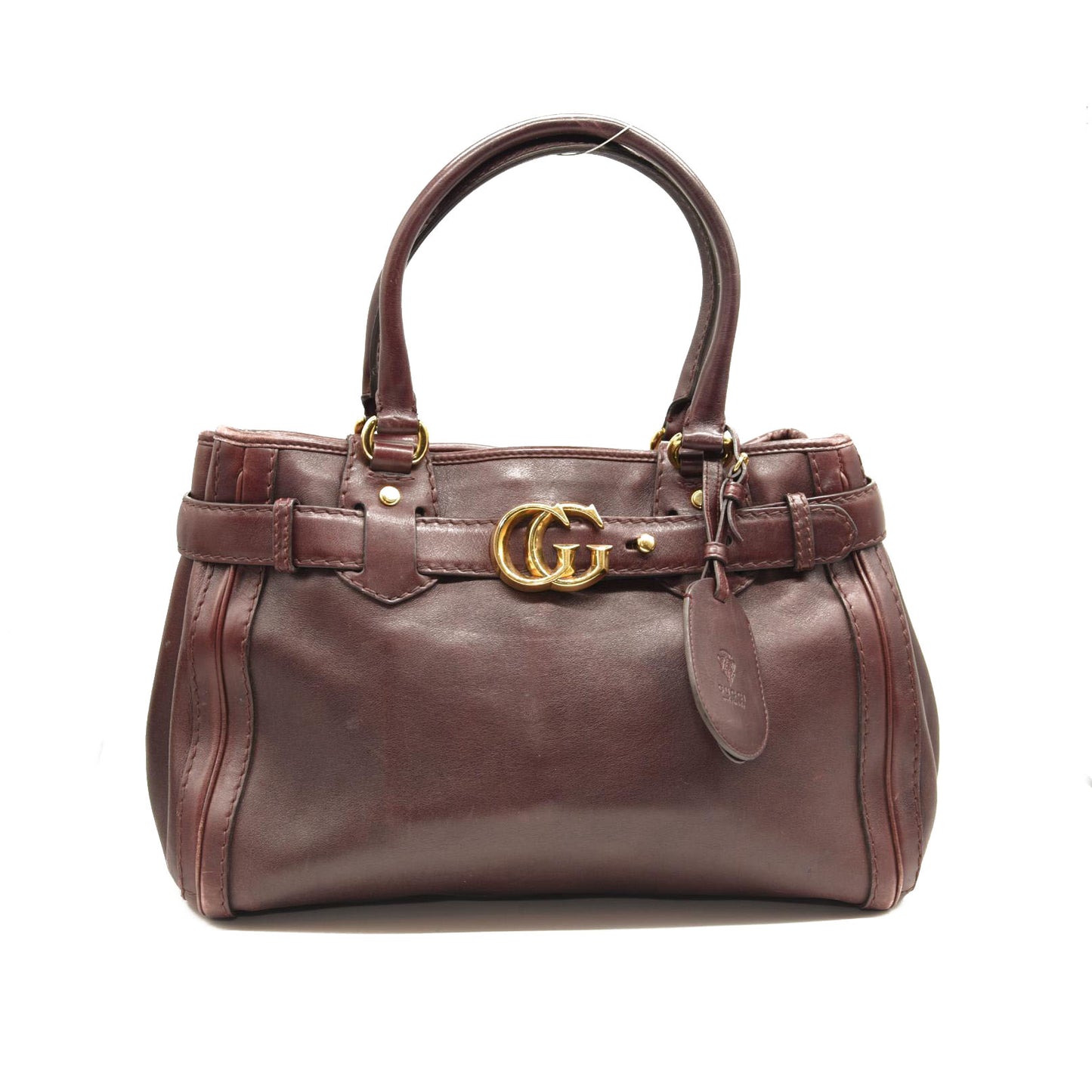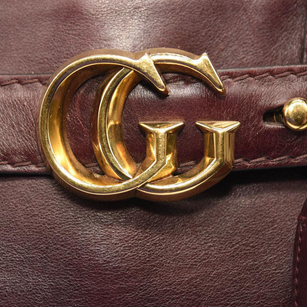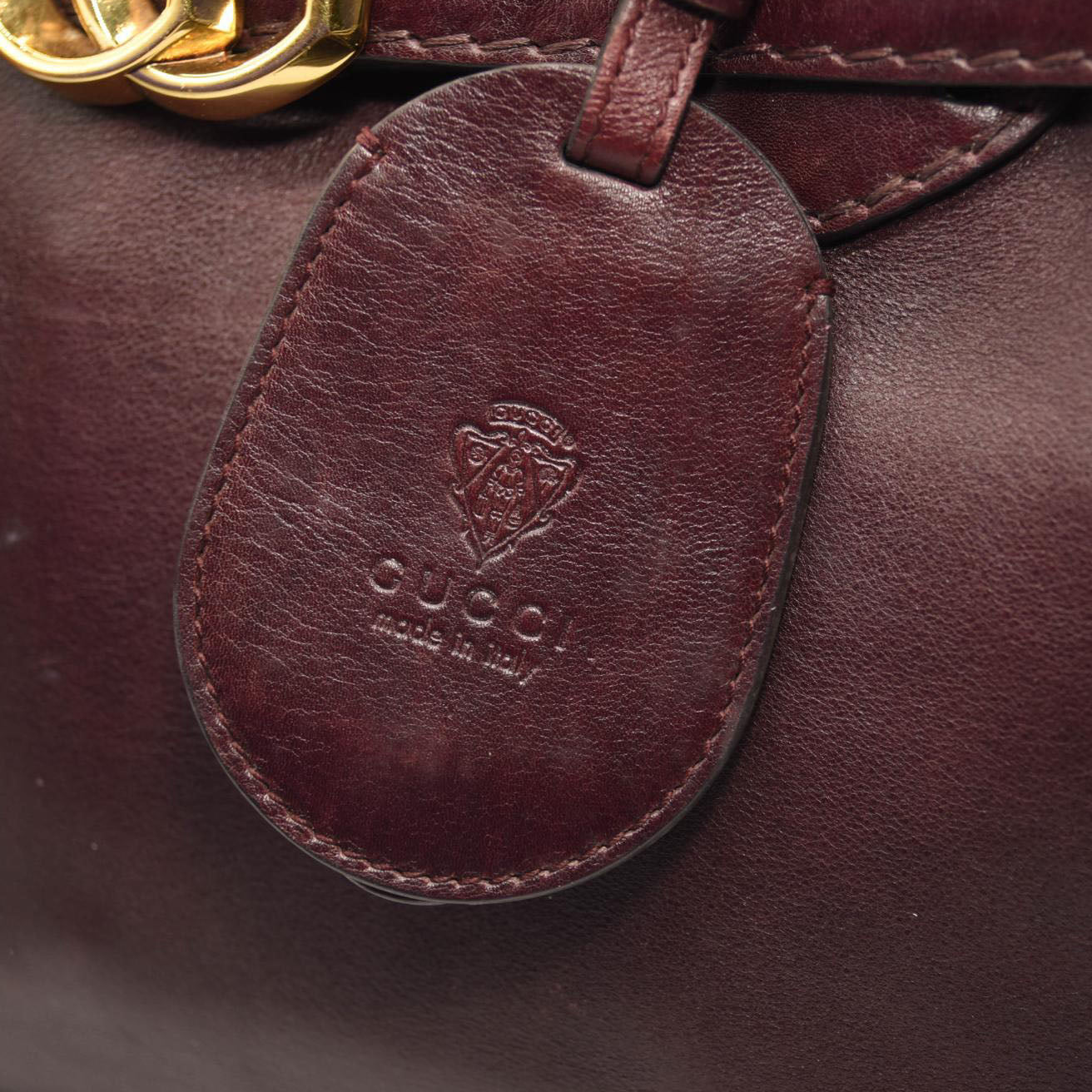 This is an authentic GUCCI Leather Large GG Running Tote in Burgundy. This stylish tote is crafted of fine leather in Burgundy. The handbag features rolled leather top handles and a top belt with loops with a brass Gucci interlocking GG buckle. This shoulder bag opens to a spacious leather interior for all of your day or evening necessities with the sophisticated style of Gucci!