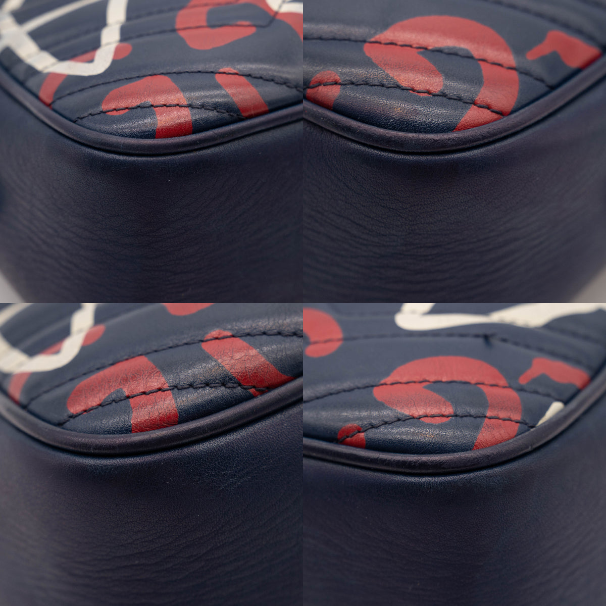 This is an authentic GUCCI Calfskin GucciGhost Print Small GG Marmont Shoulder Bag in Blue. This chic shoulder bag is crafted of soft chevron quilted calfskin leather in blue. The cross body bag features the graffiti art by street artist Trouble Andrew, an aged gold chain shoulder strap with a leather handle, a long leather tassel zipper pull and an aged gold interlocking GG logo. On the back there is an interlocking GG logo stitched into the chevron design. This bag opens to a beige microfiber fabric interior with a patch pocket. This is the perfect everyday shoulder bag, from Gucci!