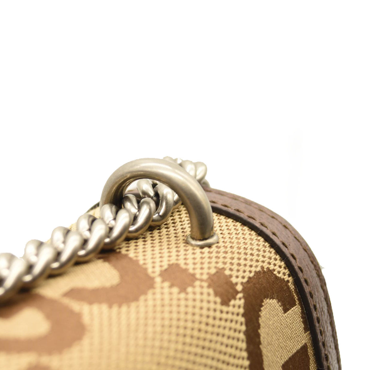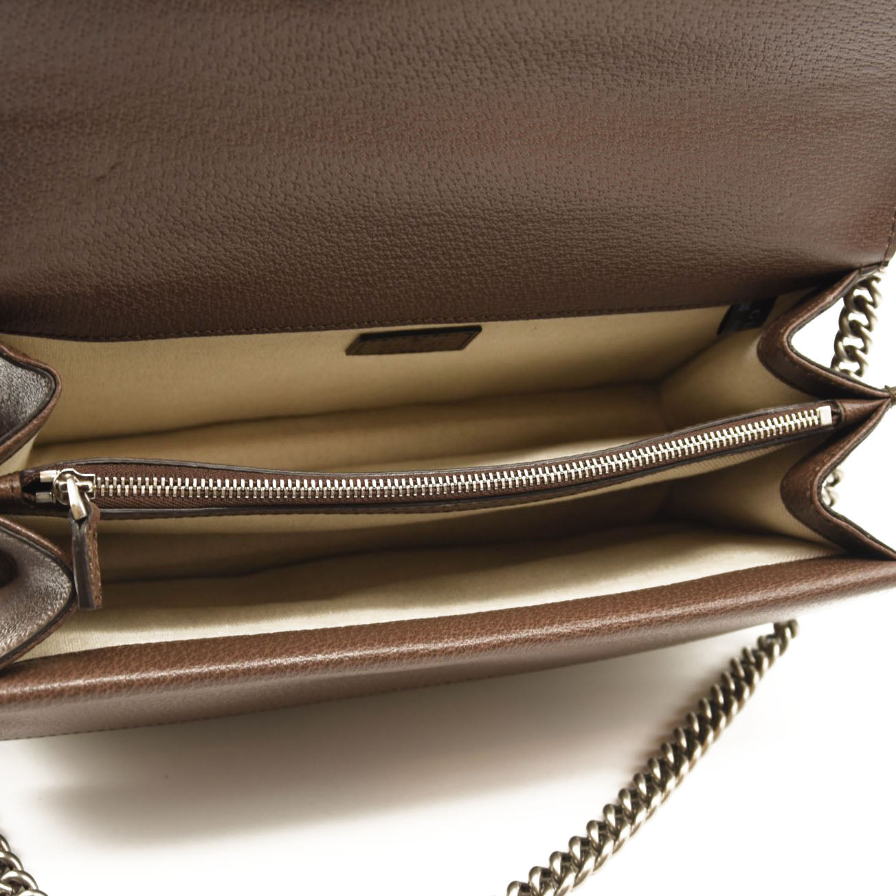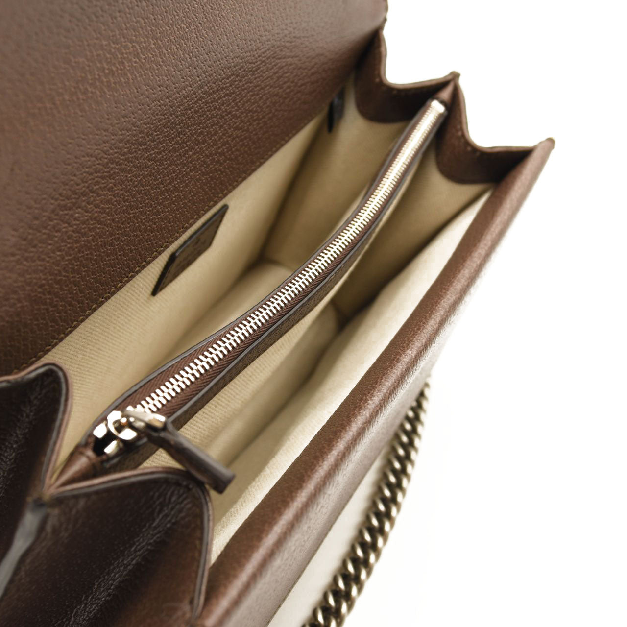This is an authentic GUCCI Monogram Jumbo GG Textured Dollar Calfskin Medium Dionysus Chain Wallet in Camel, Ebony, and New Acero. This stylish bag is crafted of Gucci monogram fabric in camel. This bag features an optional silver chain shoulder strap and a textured horseshoe closure with lion heads and brown leather trim. This opens to a brown leather interior with card slot panels, patch pockets and a zipper compartment.