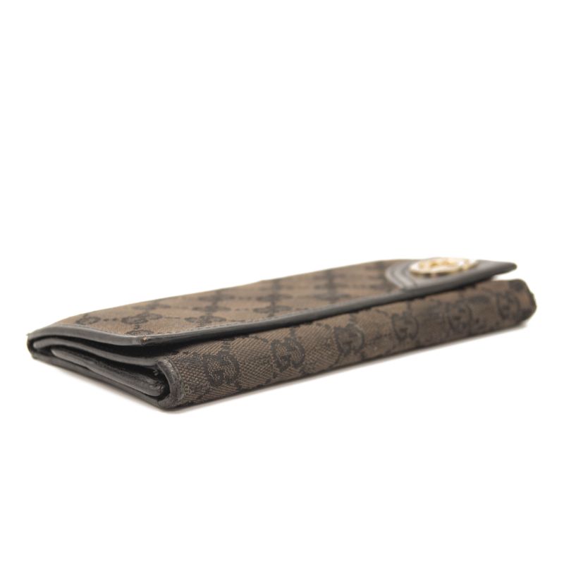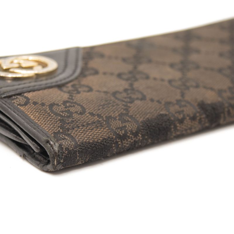 This is an authentic GUCCI Monogram New Britt Continental Wallet in Dark Chocolate Brown. This stylish wallet is crafted of black Gucci monogram canvas. The wallet features black trim and a light gold Gucci interlocking G logo. The flap opens to a brown leather interior with card slots, patch pockets, and a zipper compartment.