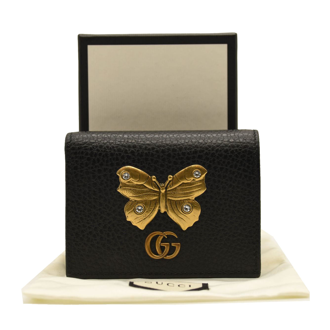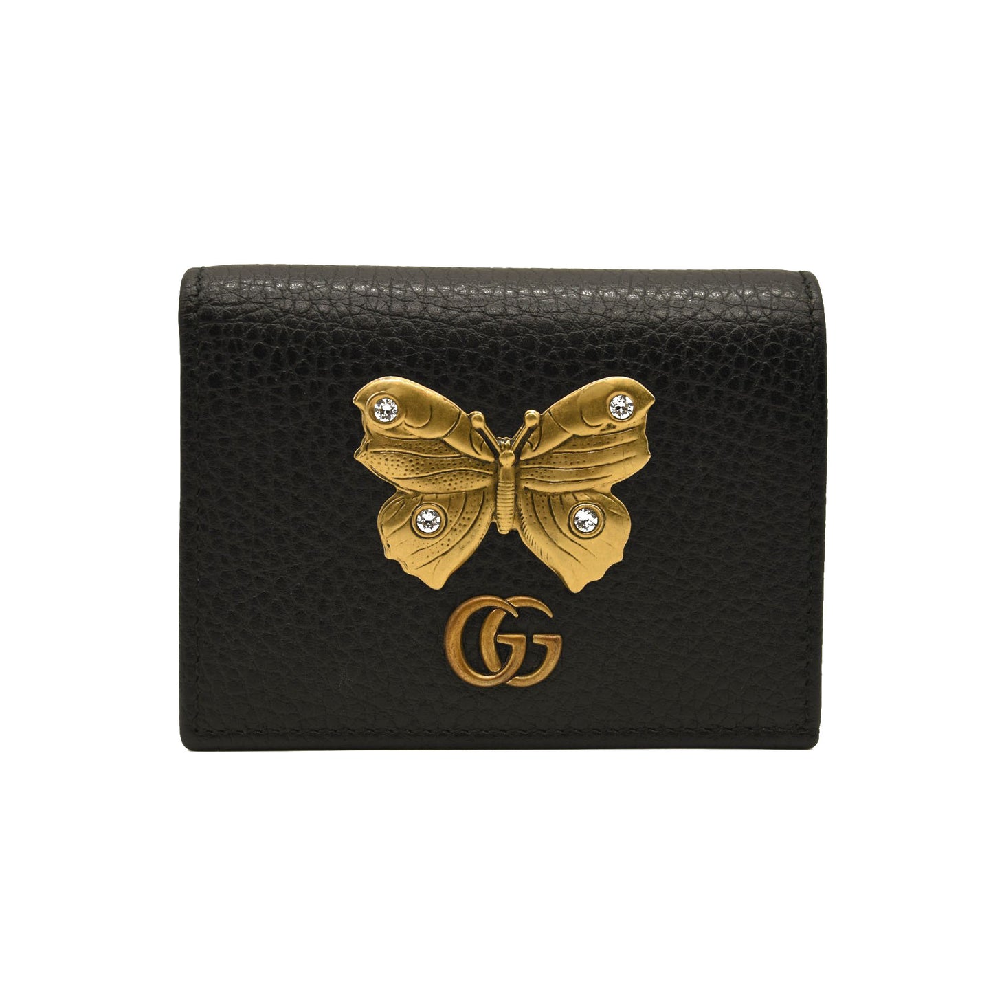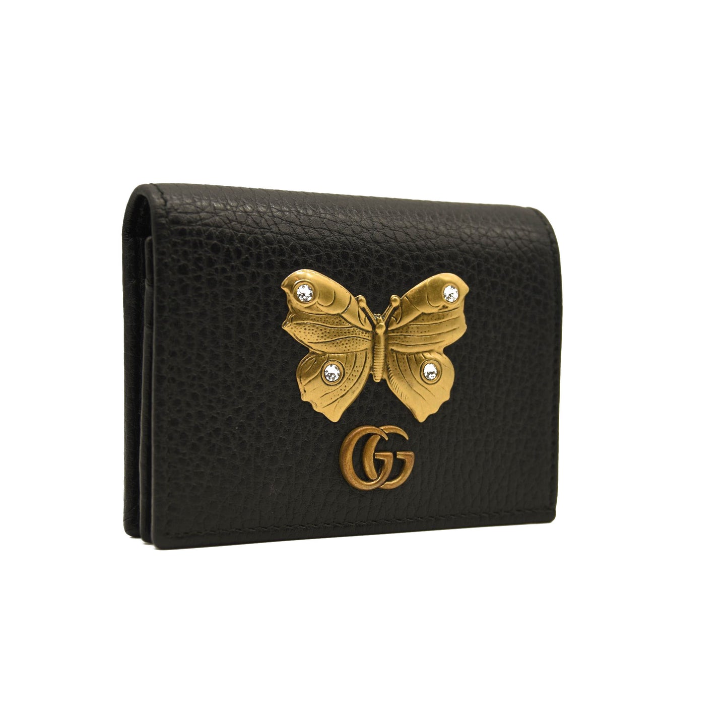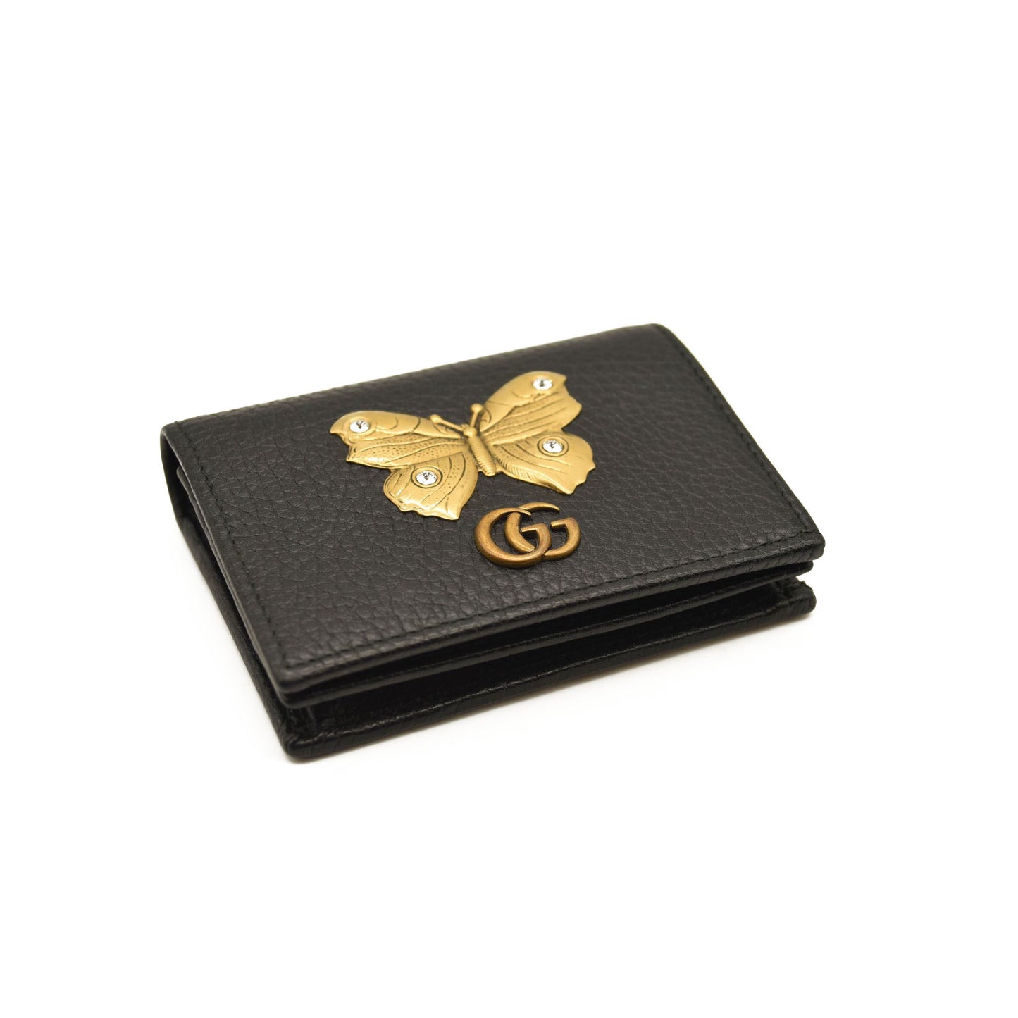 This is an authentic GUCCI Pebbled Calfskin Butterfly Card Case in Black. This stylish card holder is crafted of textured calfskin leather in black, adorned with a beautiful gold tone butterfly with crystal embellishments as well as an aged gold GG logo at the flap. The flap opens to a black leather interior with card slots and a small zippered compartment. This is a wonderful case for everyday conveniences, from Gucci!