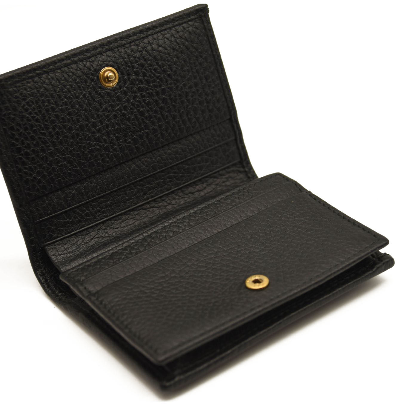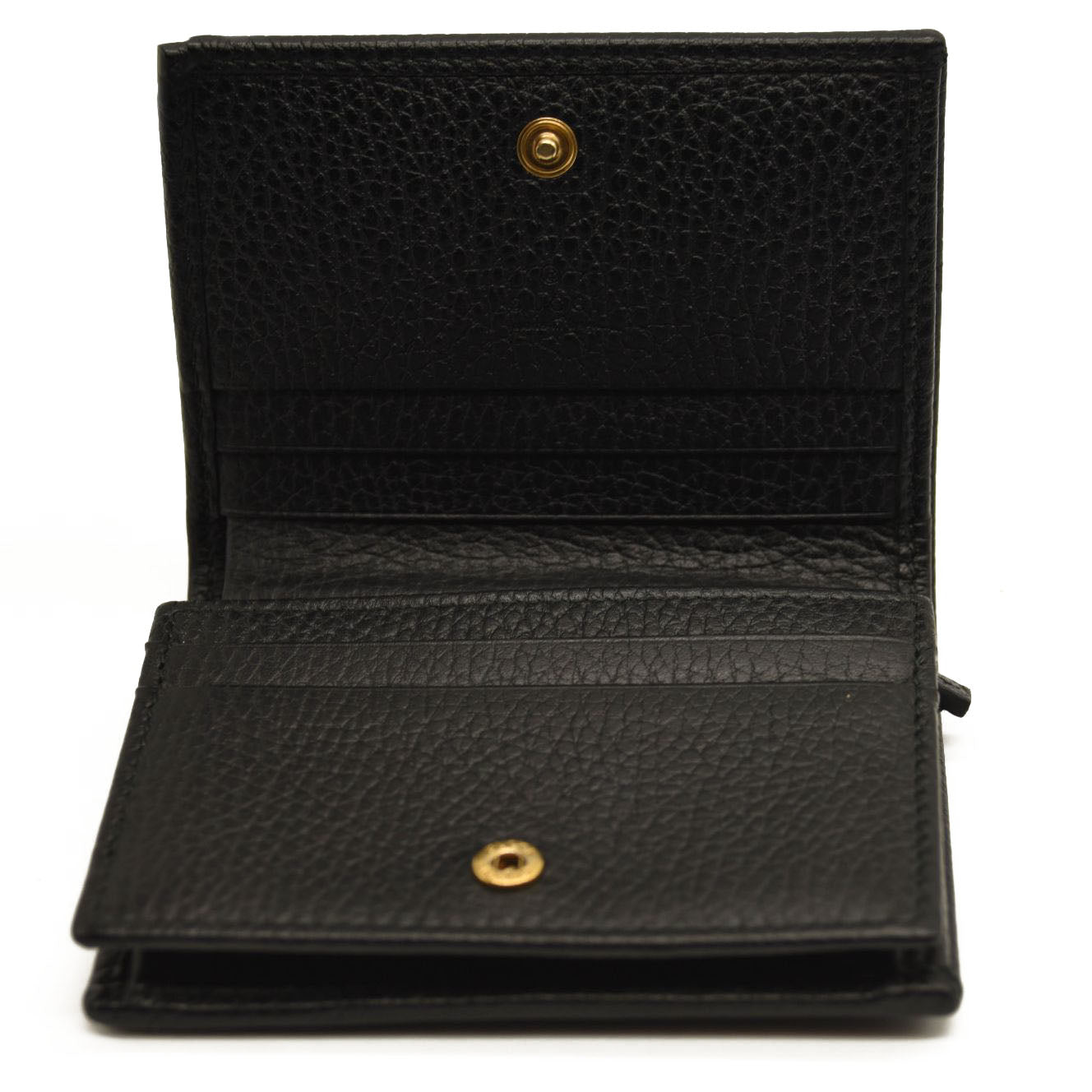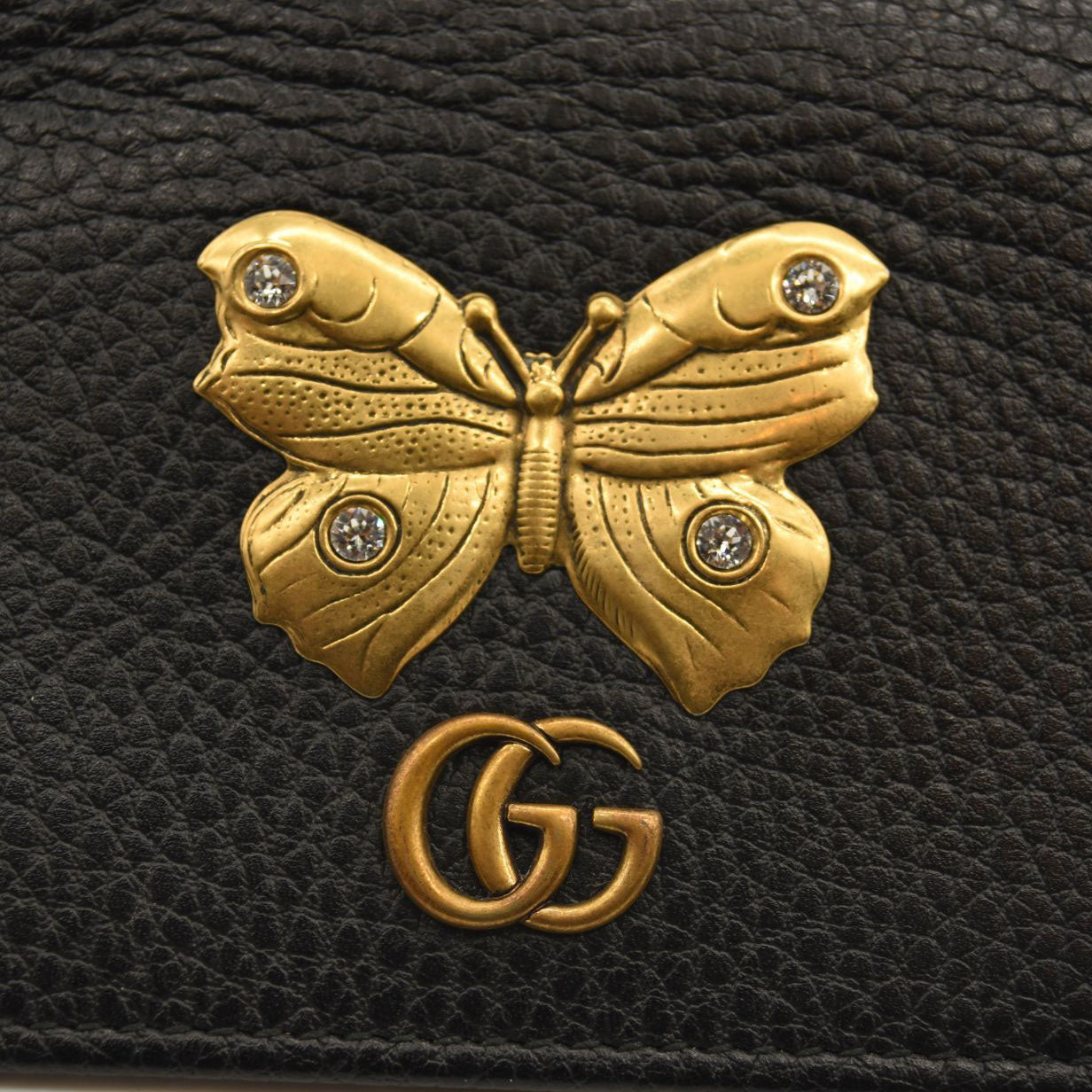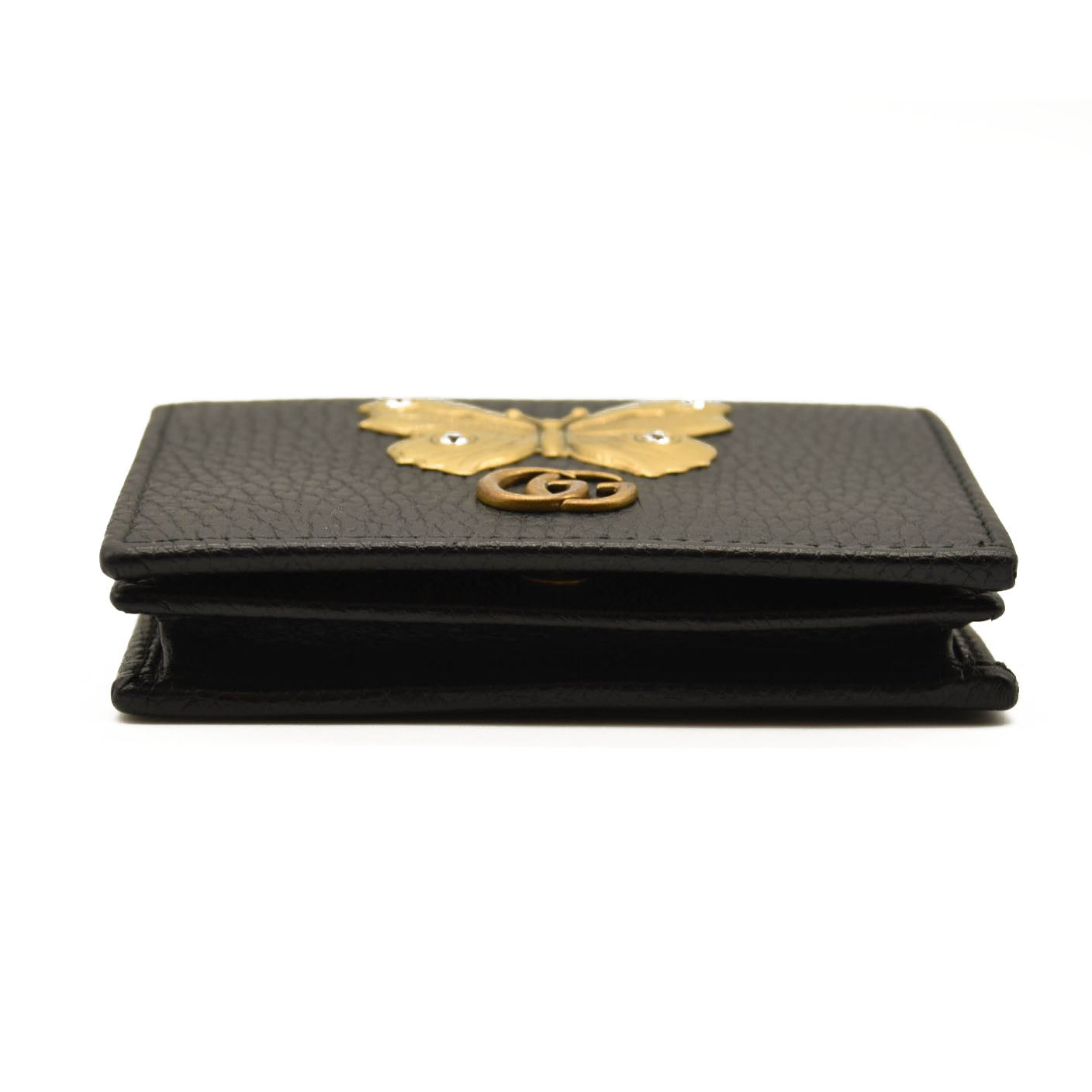 This is an authentic GUCCI Pebbled Calfskin Butterfly Card Case in Black. This stylish card holder is crafted of textured calfskin leather in black, adorned with a beautiful gold tone butterfly with crystal embellishments as well as an aged gold GG logo at the flap. The flap opens to a black leather interior with card slots and a small zippered compartment. This is a wonderful case for everyday conveniences, from Gucci!