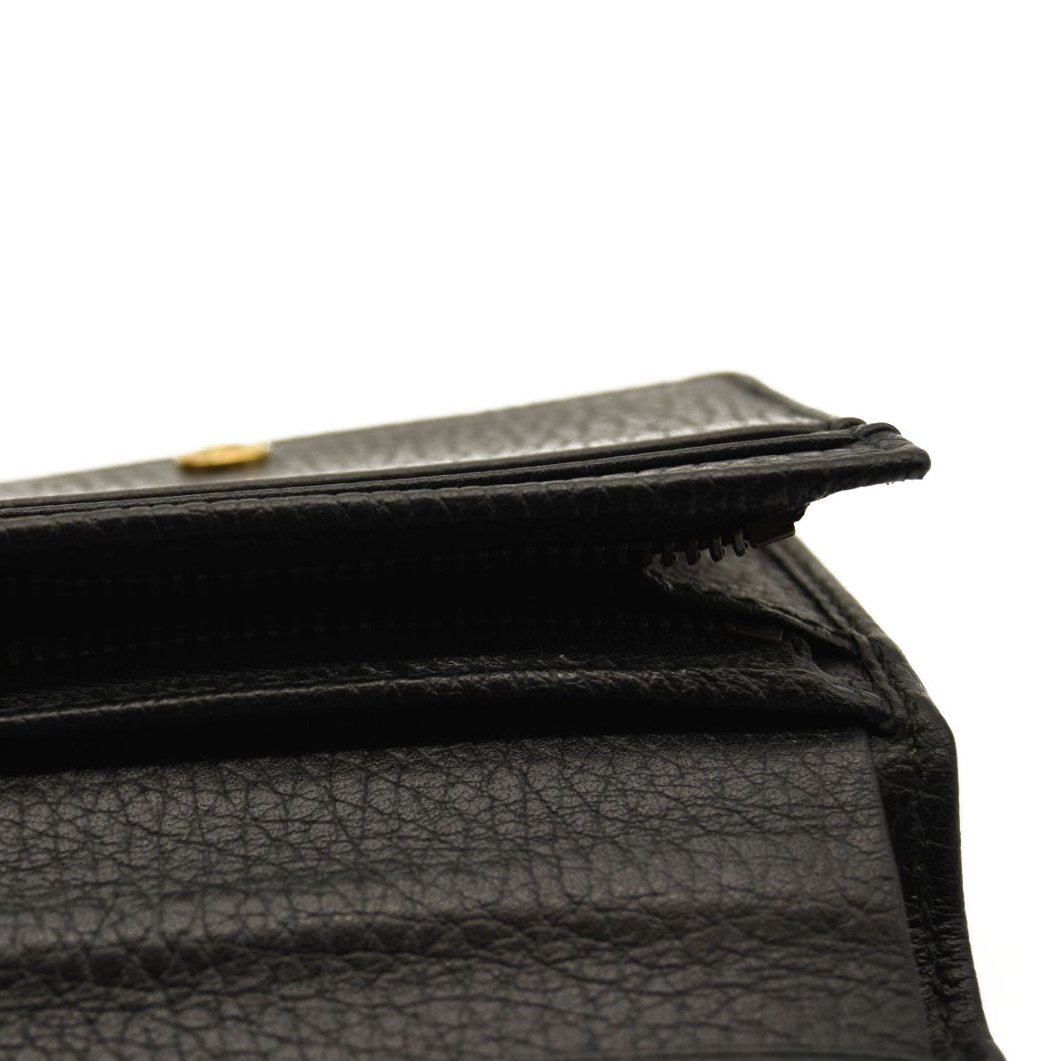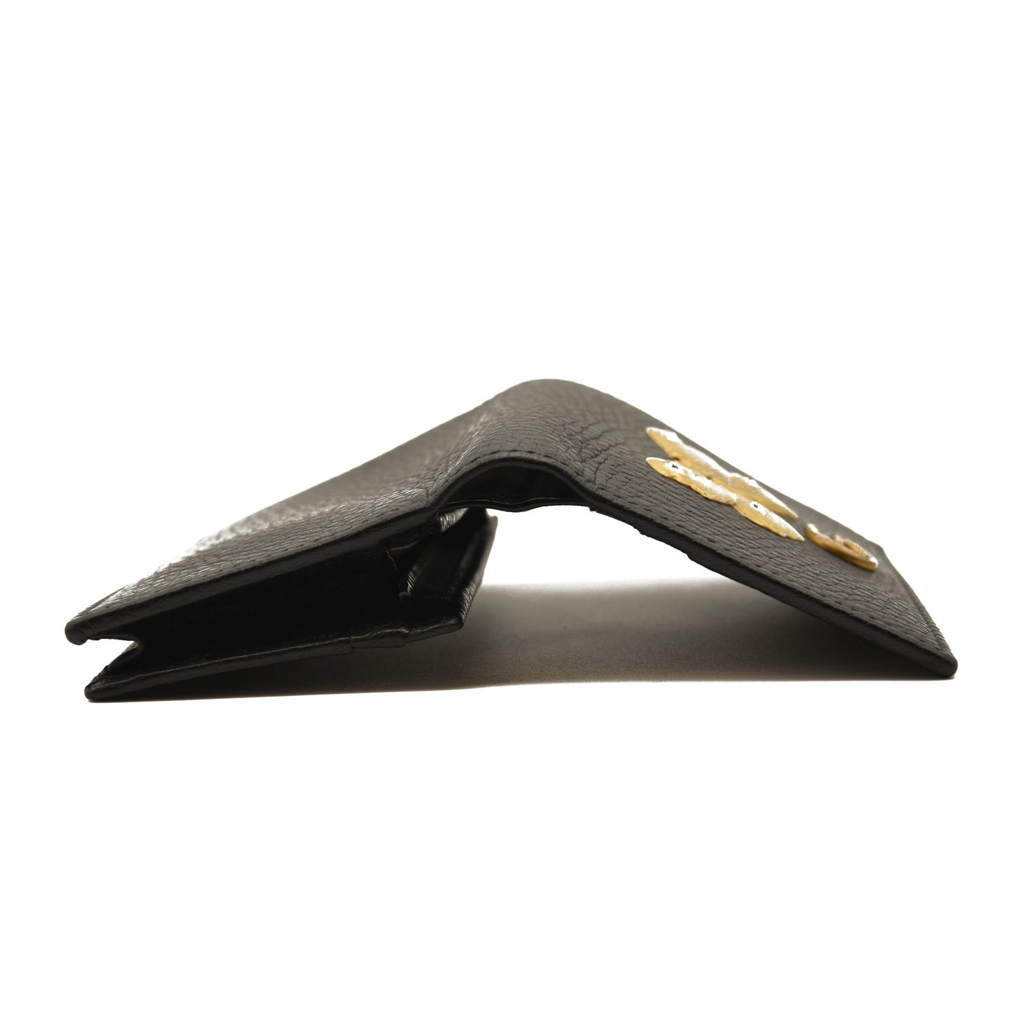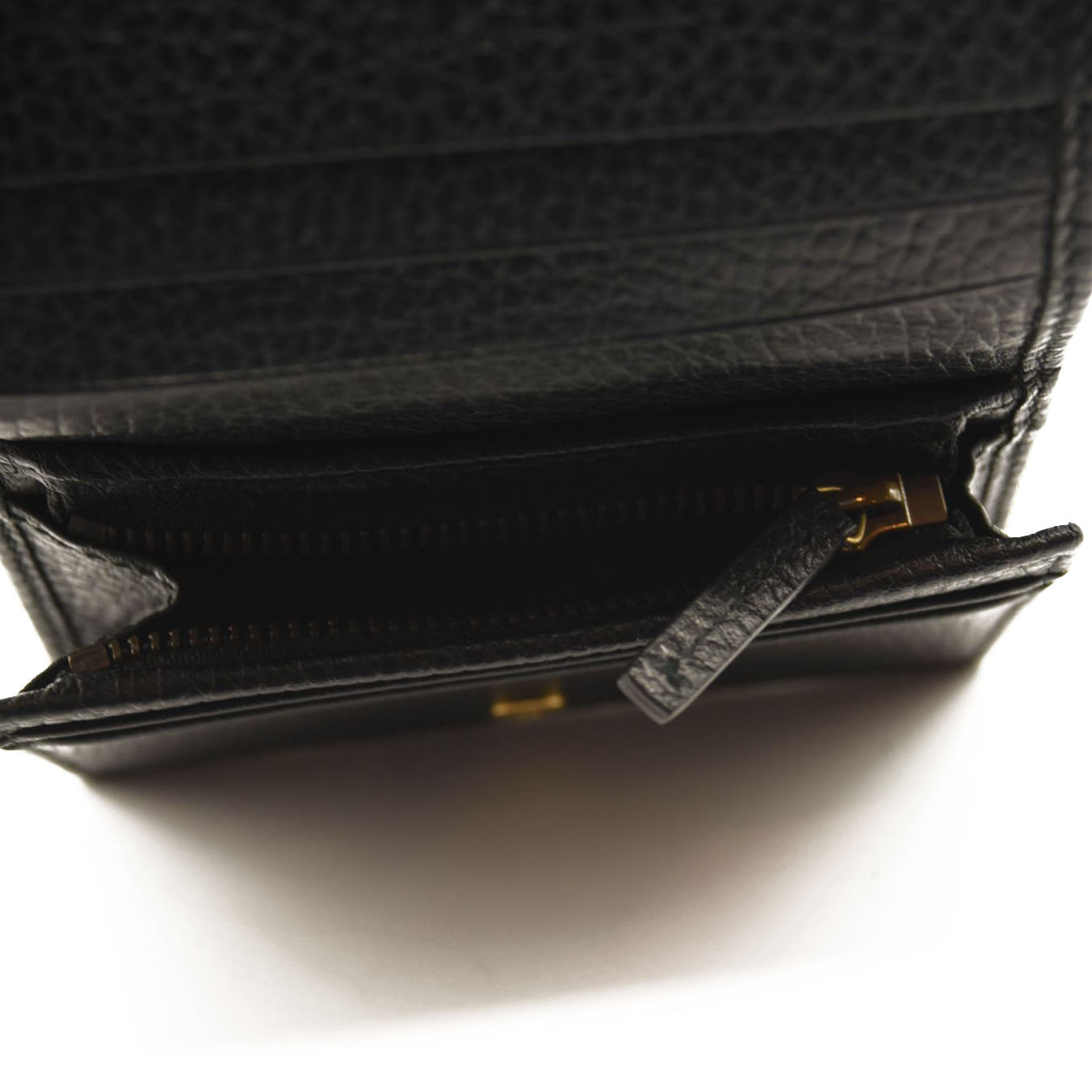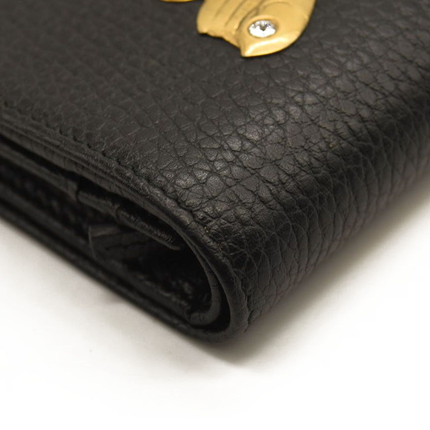 This is an authentic GUCCI Pebbled Calfskin Butterfly Card Case in Black. This stylish card holder is crafted of textured calfskin leather in black, adorned with a beautiful gold tone butterfly with crystal embellishments as well as an aged gold GG logo at the flap. The flap opens to a black leather interior with card slots and a small zippered compartment. This is a wonderful case for everyday conveniences, from Gucci!