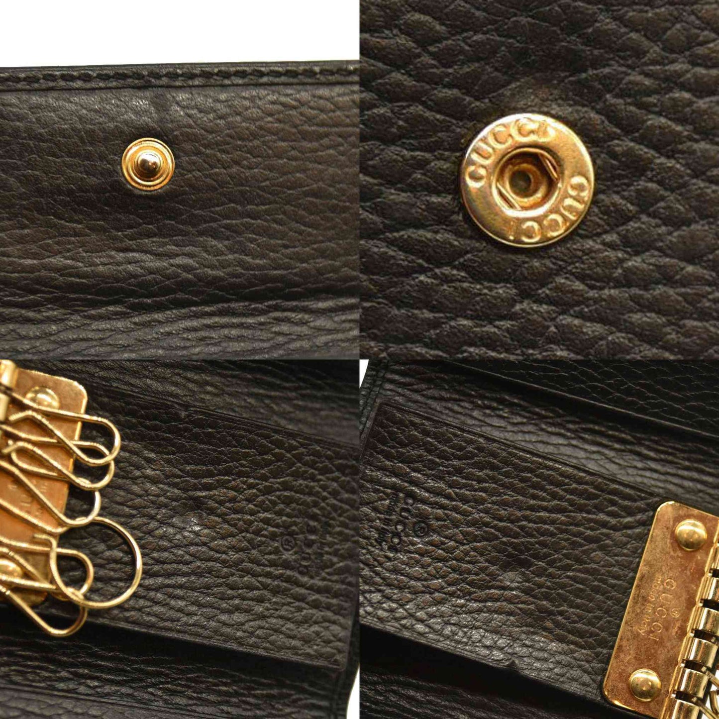 This is an authentic GUCCI Pebbled Calfskin GG Marmont 6 Key Holder in Black. This case is crafted of textured black calfskin leather. It features a gold interlocking GG logo and a snap closure that opens to a black leather interior with six gold key rings.