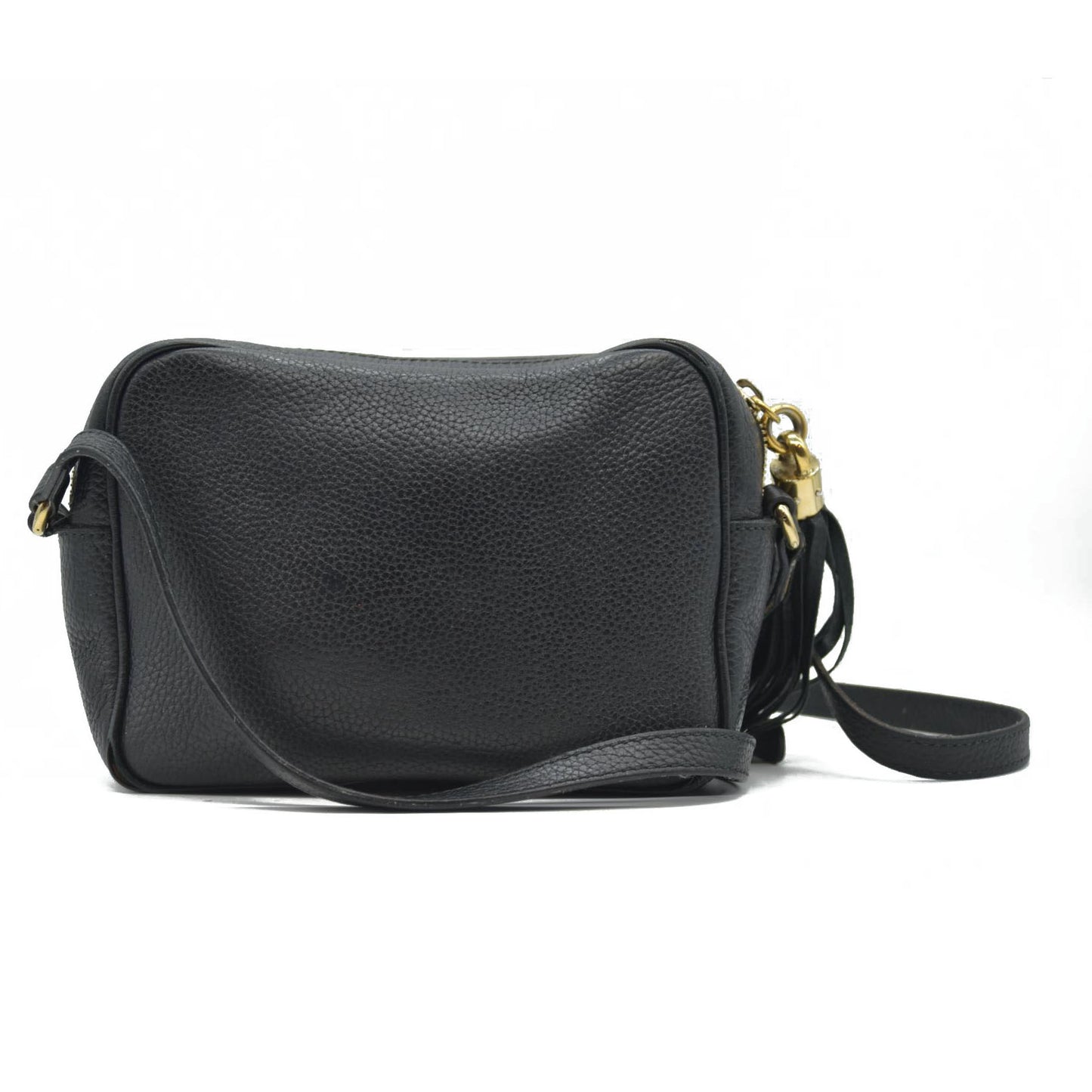 This is an authentic GUCCI Pebbled Calfskin Small Soho Disco Bag in Black. This stylish crossbody bag is crafted of textured calfskin leather in black. The shoulder bag features an adjustable leather shoulder strap, a stitched interlocking GG logo, and a polished gold knobbed leather tassel zipper pull. The top zipper opens to a beige fabric interior with patch pockets.