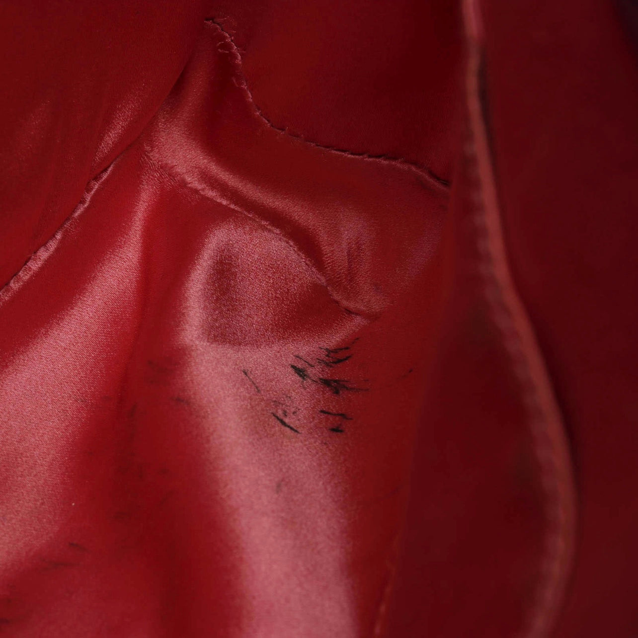 The exterior velvet is clean and has light rubbing to the bottom corners. The embroidery and appliques remain in good condition with light signs of rubbing. The goldtone hardware remains bright and crisp. The shoulder strap is clean with light creasing. The interior lining has some pen marks