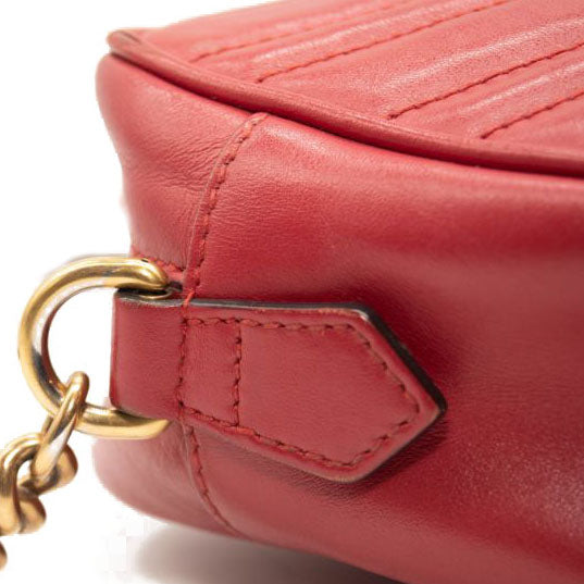This is an authentic GUCCI Calfskin Matelasse Small GG Marmont Chain Shoulder Bag in Hibiscus Red. This shoulder bag is crafted of chevron-quilted calfskin leather in red, with a prominent Gucci GG logo stitched on the back. The bag features an aged gold chain and leather shoulder strap, and a matching gold GG logo on the front. The top zipper opens the bag to a beige microfiber interior with a patch pocket.