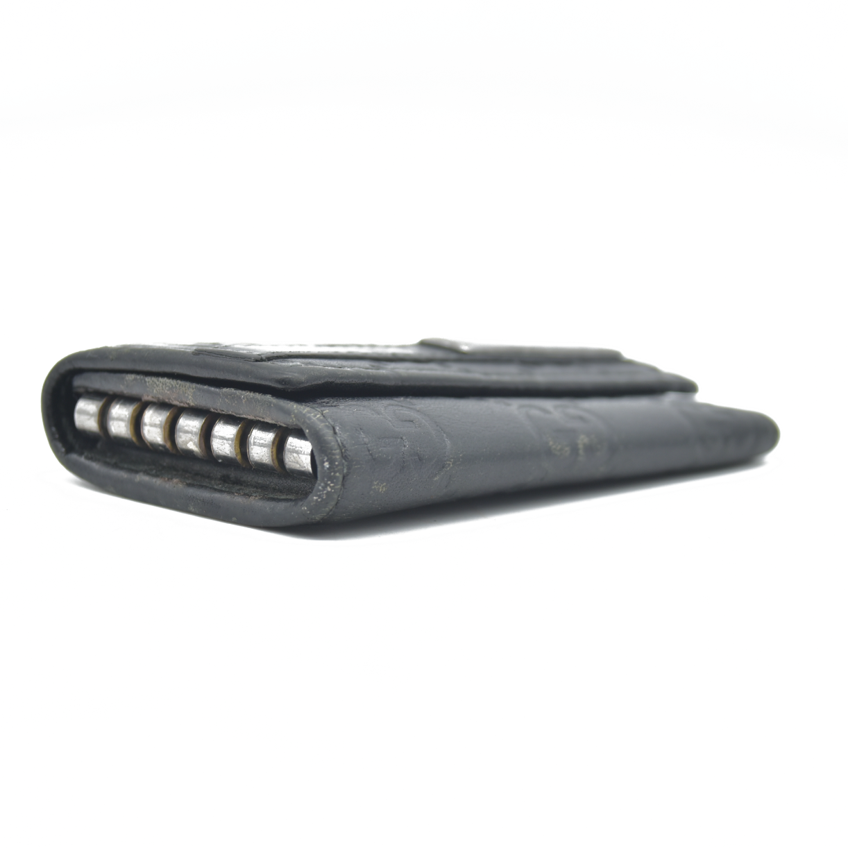 This is an authentic GUCCI Ssima GG Logo Leather 6 Ring Key Case crafted from black embossed leather featuring the iconic GG logo pattern throughout. The compact case opens with a snap closure to reveal six brass key rings and a slip pocket for small essentials. Finished with polished hardware and a sleek silhouette, this key case offers both organization and timeless Gucci luxury in a practical everyday accessory.