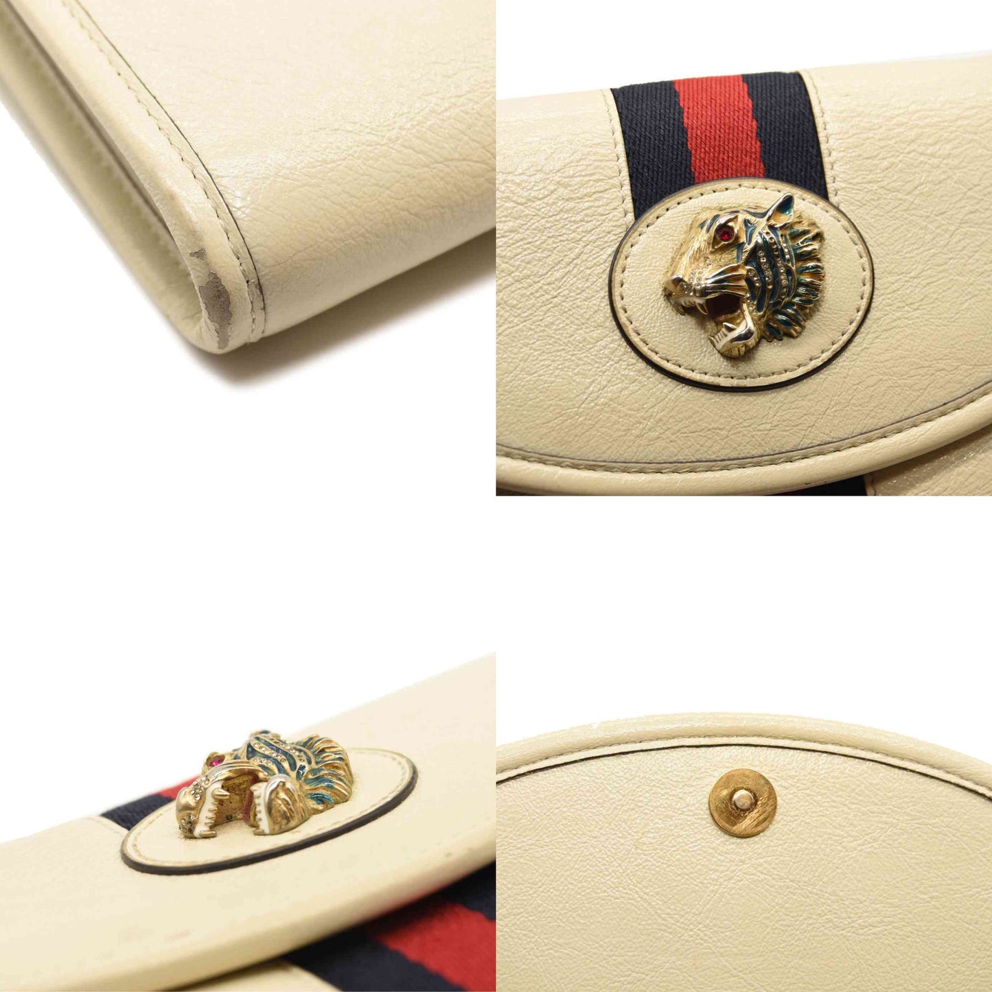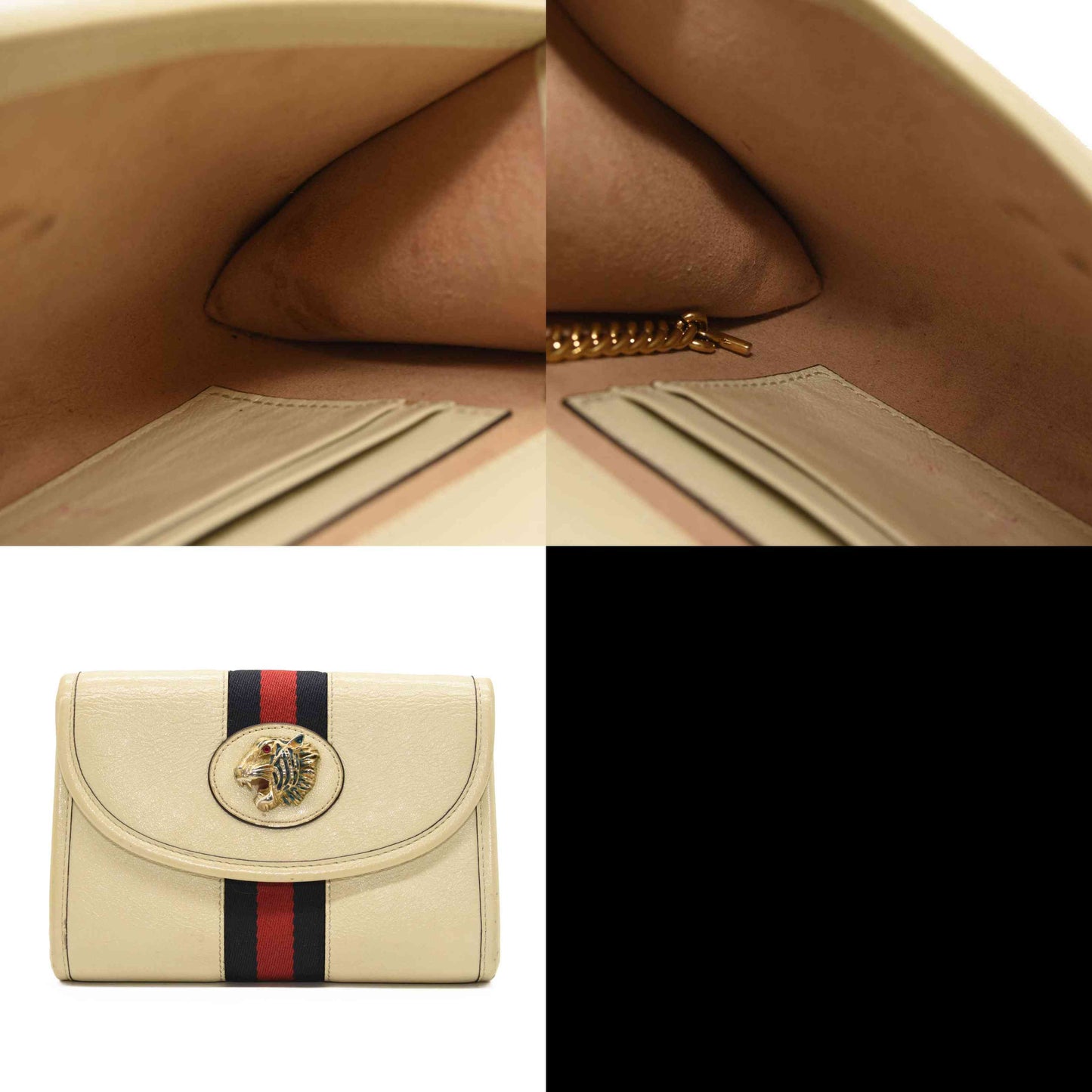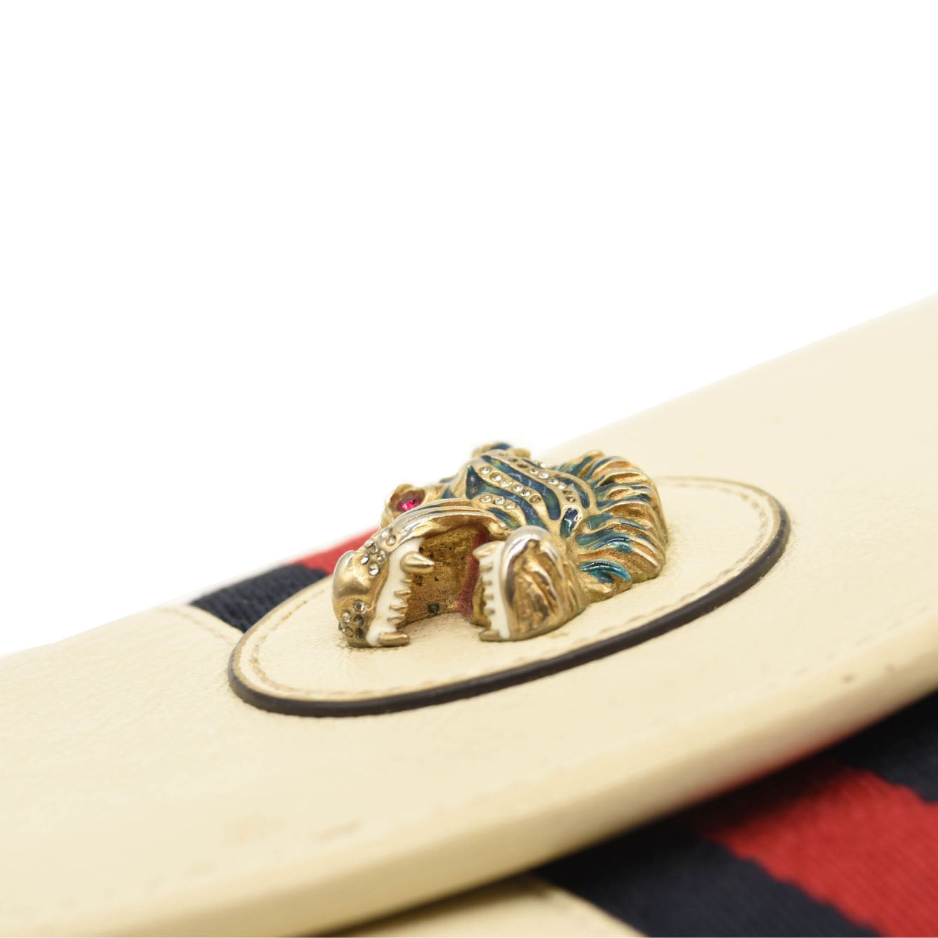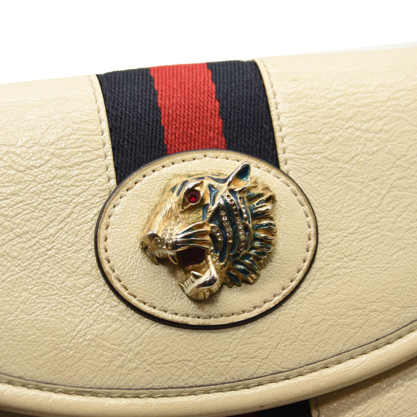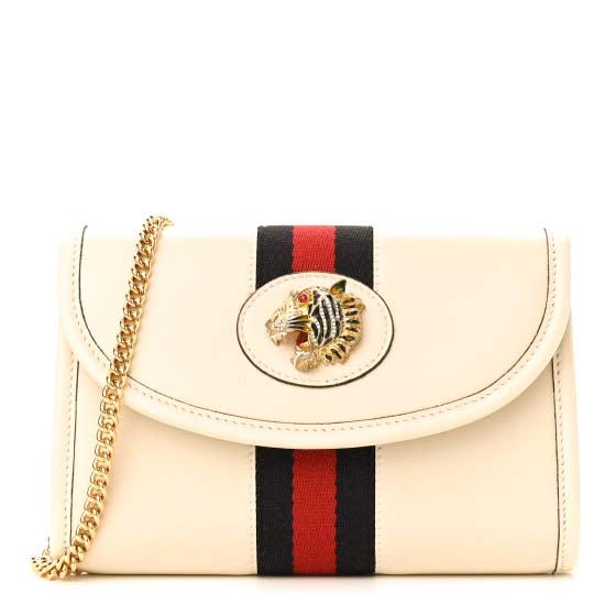 This is an authentic GUCCI Calfskin Web Mini Rajah Shoulder Bag in Off White. This chic shoulder bag is crafted of white leather with a blue and red stripe canvas web. It features a prominent front flap detailed with a web stripe and a crystal-encrusted tiger head and an optional gold chain shoulder strap. The flap opens to a microfiber interior with leather card slots and a removable key ring.