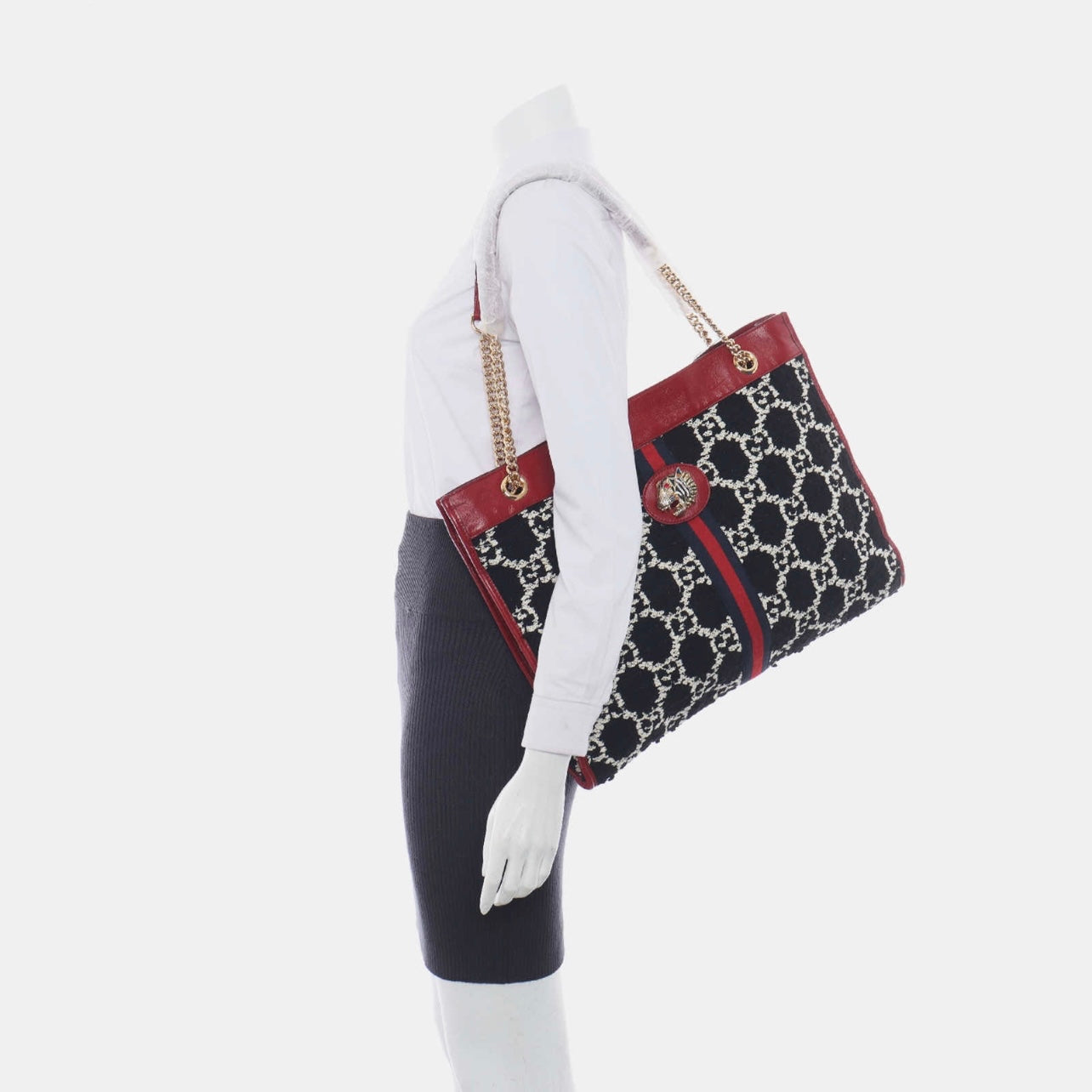 This is an authentic GUCCI Tweed GG Large Rajah Tote in Romantic Cherry, Black and White. This stylish shoulder bag is finely crafted of woven black and white monogram printed tweed with red leather trim. The bag features a prominent crystal-encrusted tiger head medallion on the front, red and blue web striping, and gold chain-link shoulder straps with red leather shoulder pads. The top is open to a beige microfiber interior with a matching removable pouch.