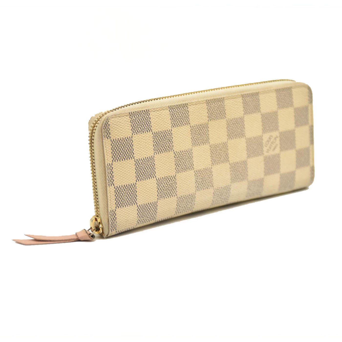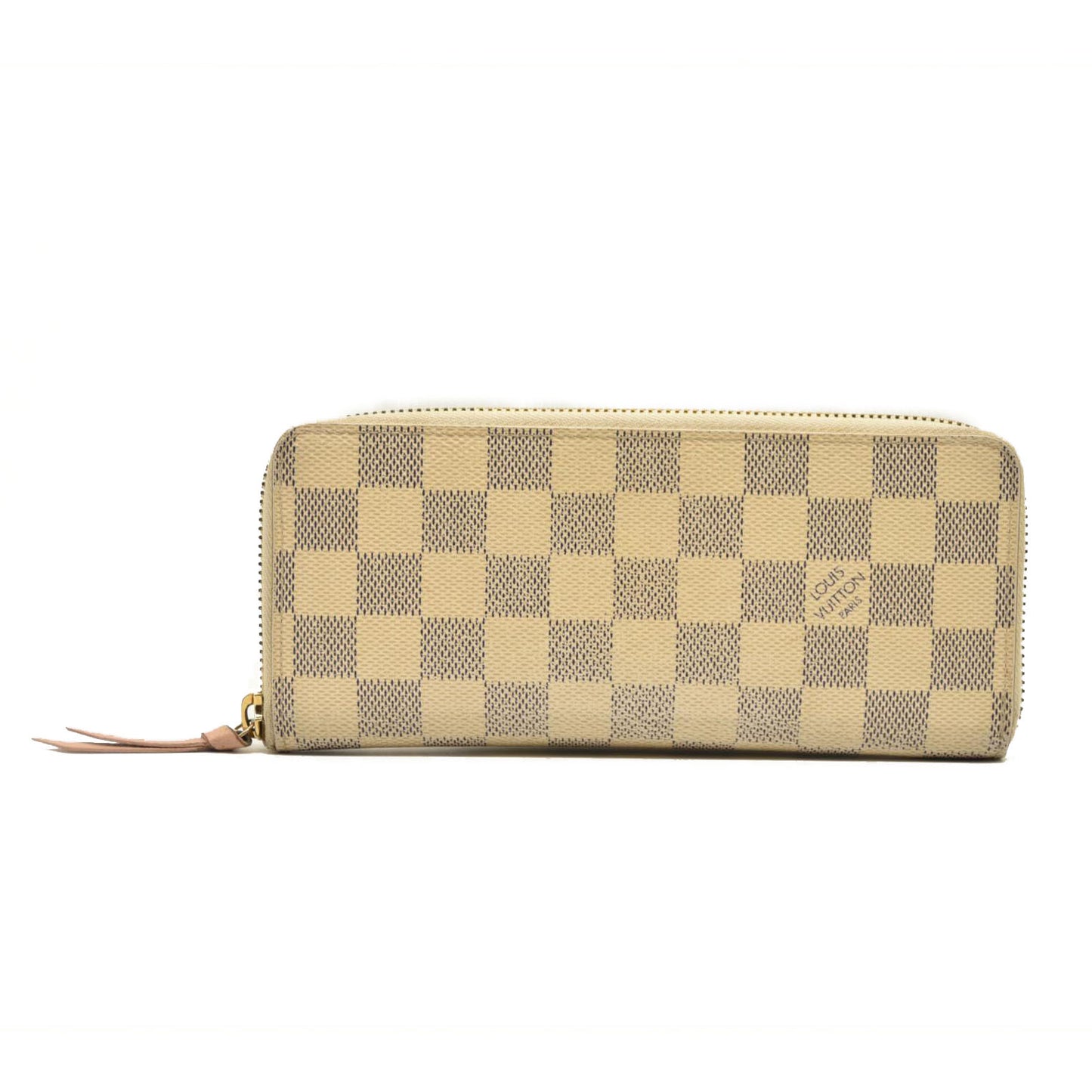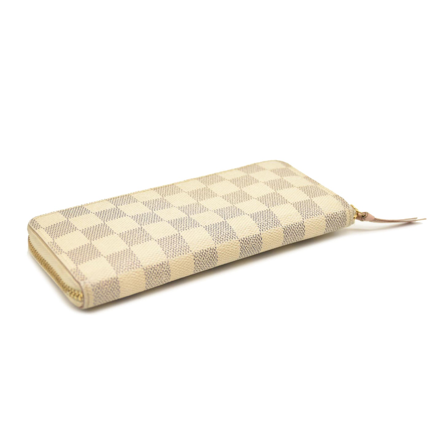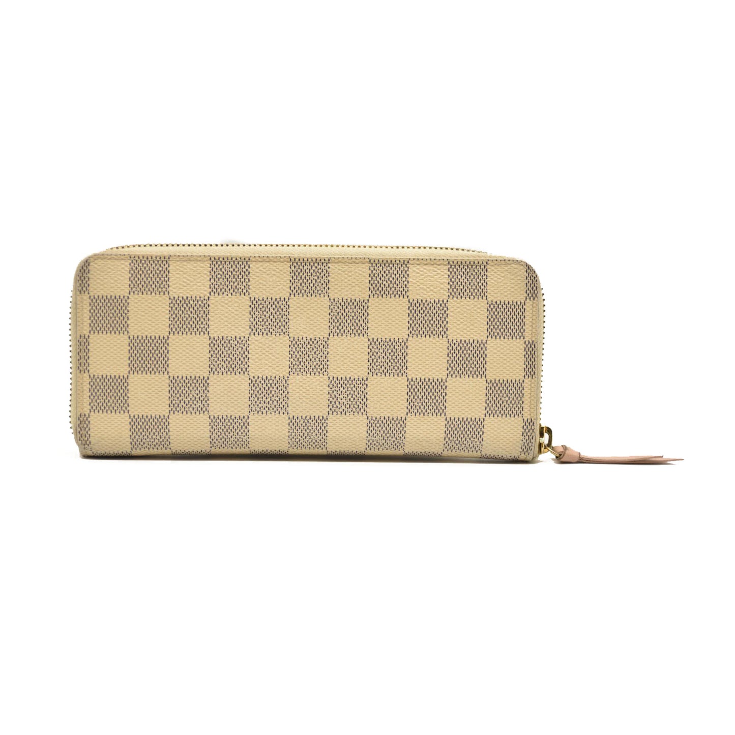 This is an authentic LOUIS VUITTON Damier Azur Clemence Wallet in Rose Ballerine. This stylish wallet is crafted of Damier checkered canvas in blue and white. The wrap-around brass zipper opens to a partitioned interior of ballerina pink cross-grain leather with card slots, patch pockets, and a central zipper compartment.