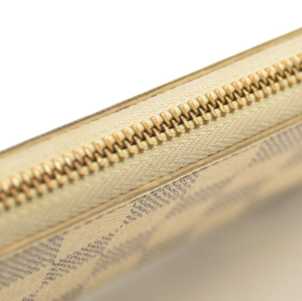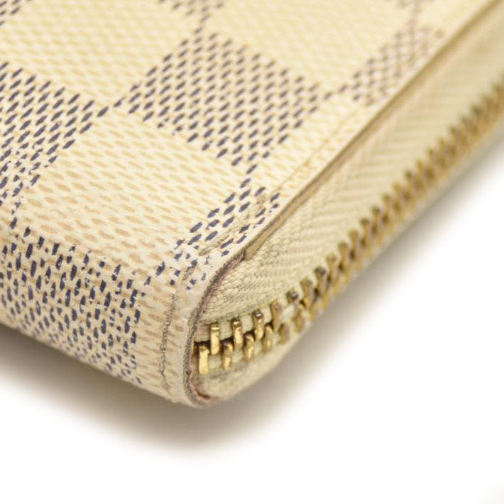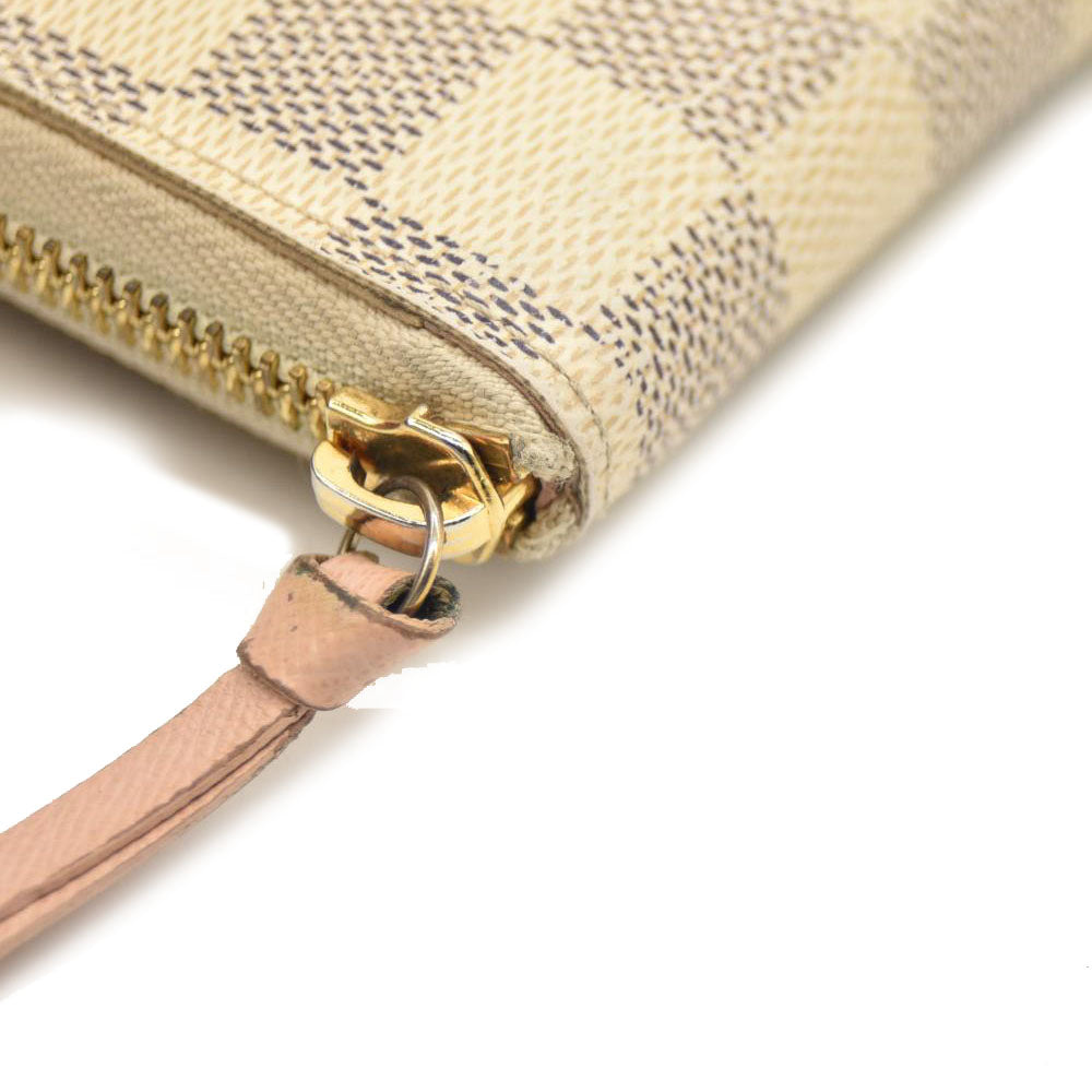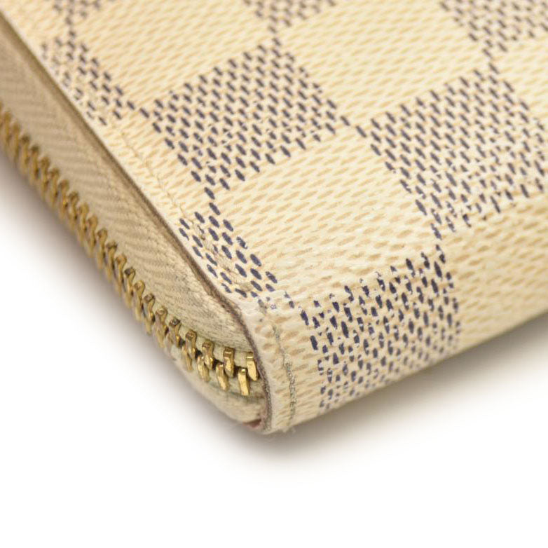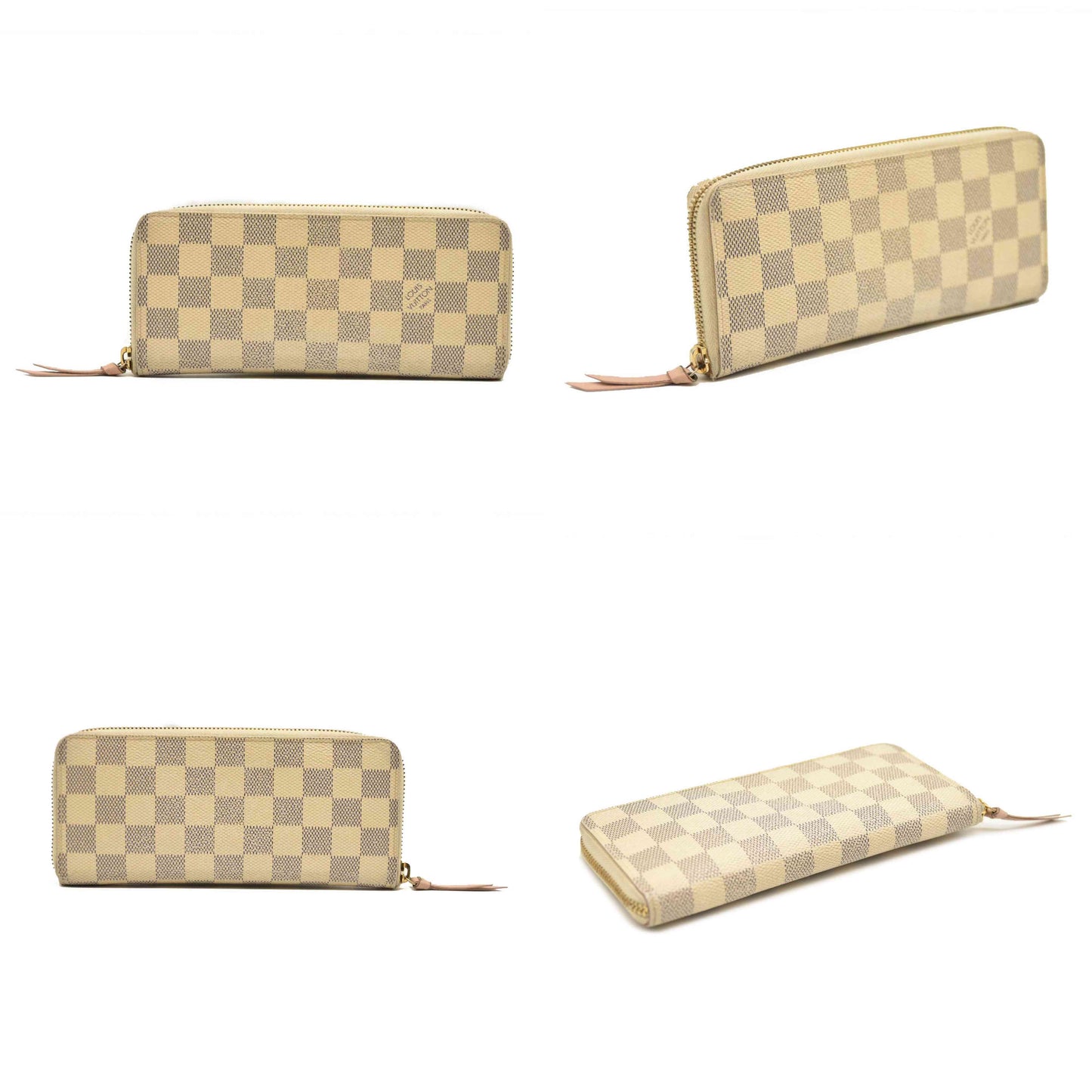 This is an authentic LOUIS VUITTON Damier Azur Clemence Wallet in Rose Ballerine. This stylish wallet is crafted of Damier checkered canvas in blue and white. The wrap-around brass zipper opens to a partitioned interior of ballerina pink cross-grain leather with card slots, patch pockets, and a central zipper compartment.