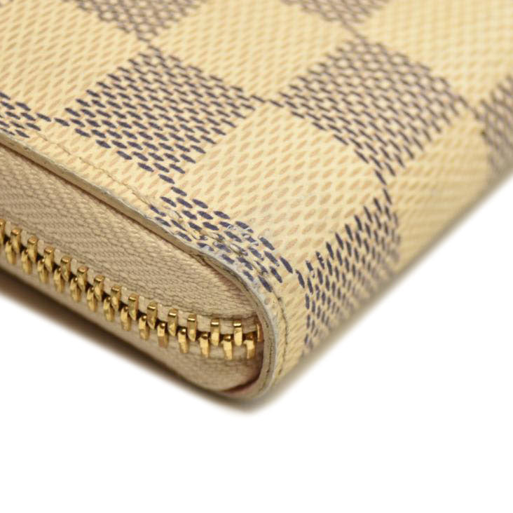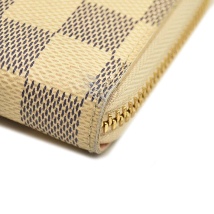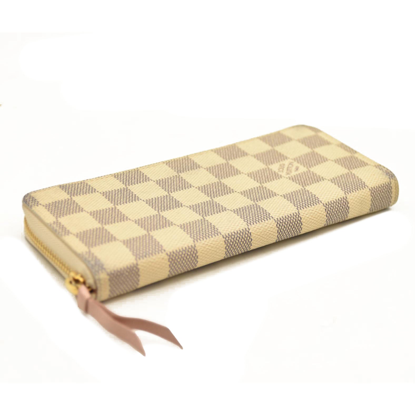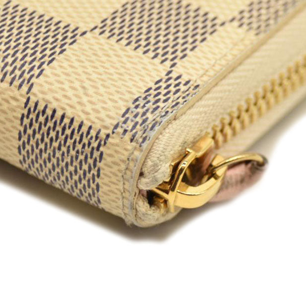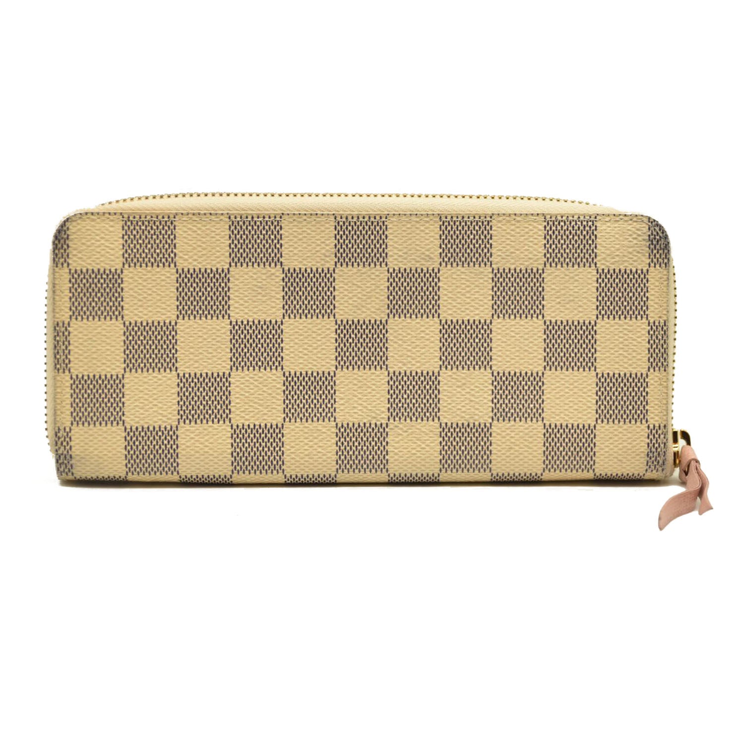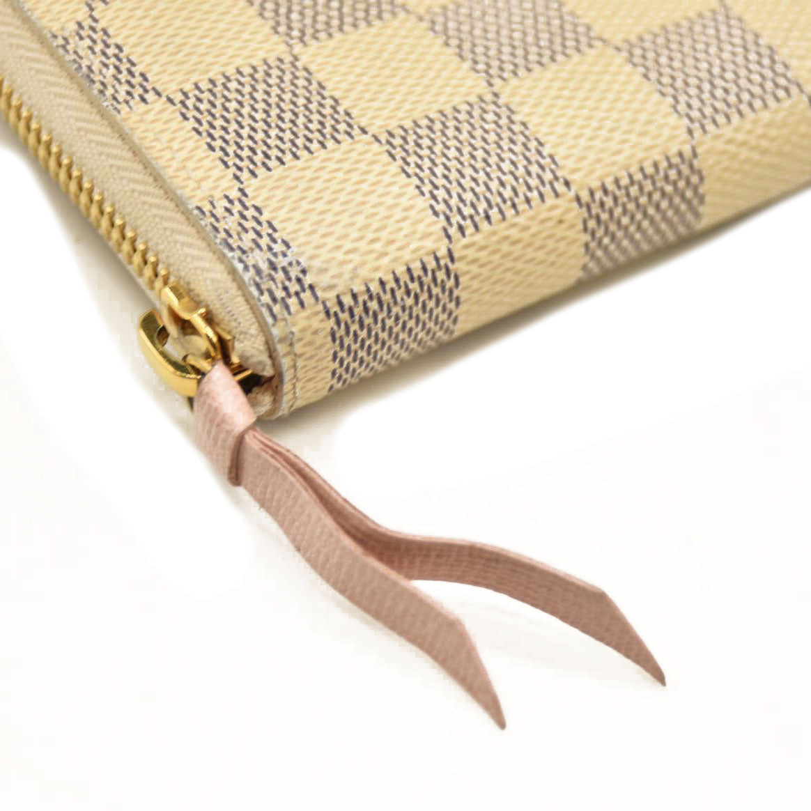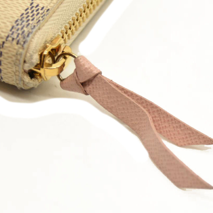This is an authentic LOUIS VUITTON Damier Azur Clemence Wallet in Rose Ballerine. This stylish wallet is crafted of Damier checkered canvas in blue and white. The wrap-around brass zipper opens to a partitioned interior of ballerina pink cross-grain leather with card slots, patch pockets, and a central zipper compartment.