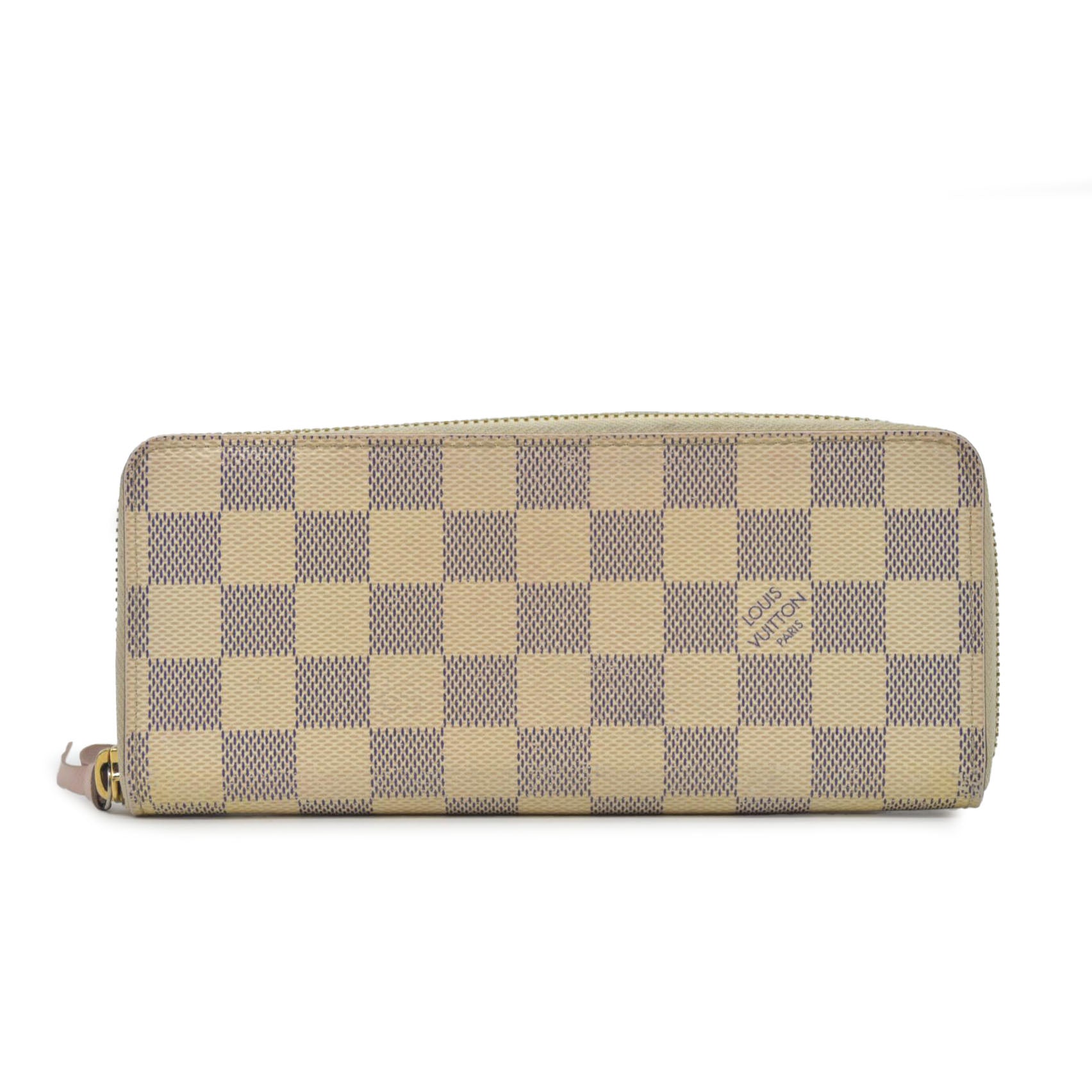 This is an authentic LOUIS VUITTON Damier Azur Clemence Wallet in Rose Ballerine. This stylish wallet is crafted of Damier checkered canvas in blue and white. The wrap-around brass zipper opens to a partitioned interior of ballerina pink cross-grain leather with card slots, patch pockets, and a central zipper compartment.