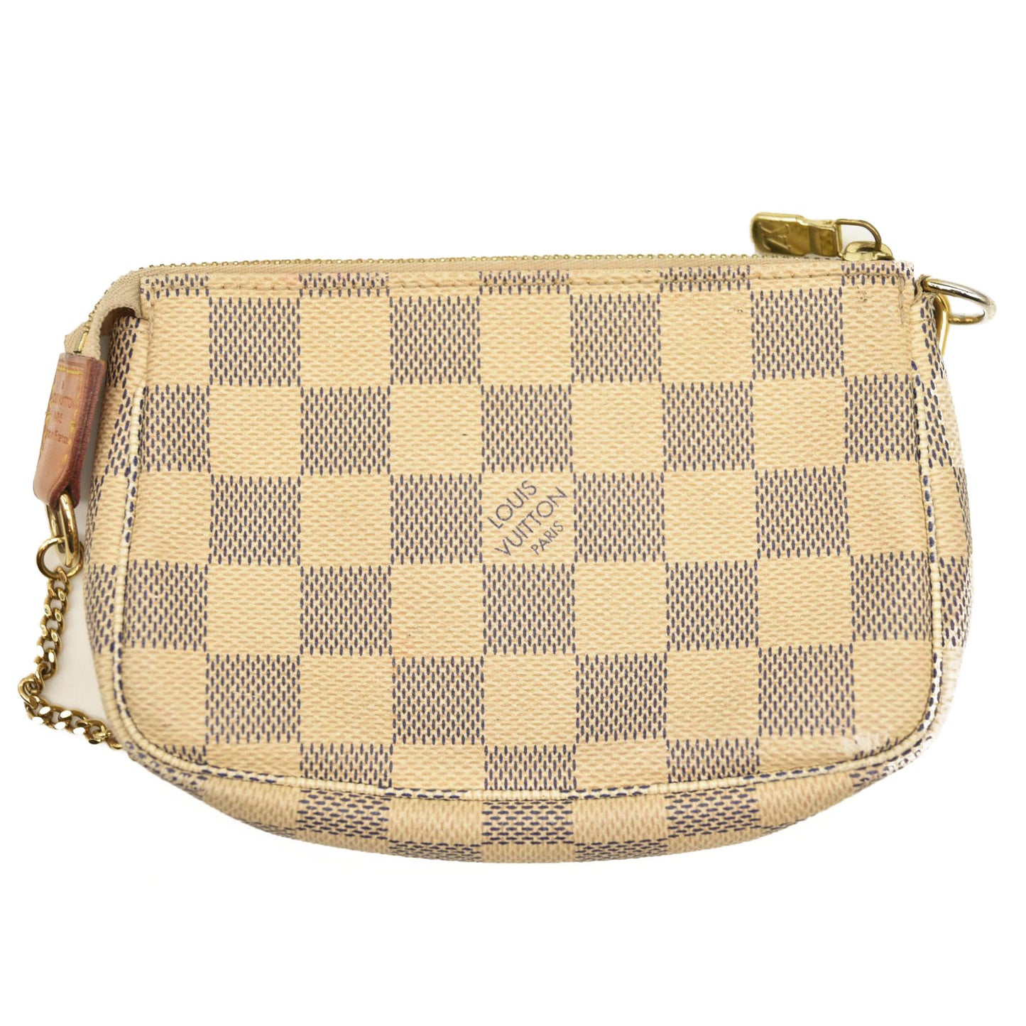 This is an authentic LOUIS VUITTON Damier Azur Mini Pochette Accessories. This stylish small pochette is crafted of Louis Vuitton signature damier azur check coated canvas. The bag features a polished gold wristlet and a top zipper that opens to an ivory fabric interior.