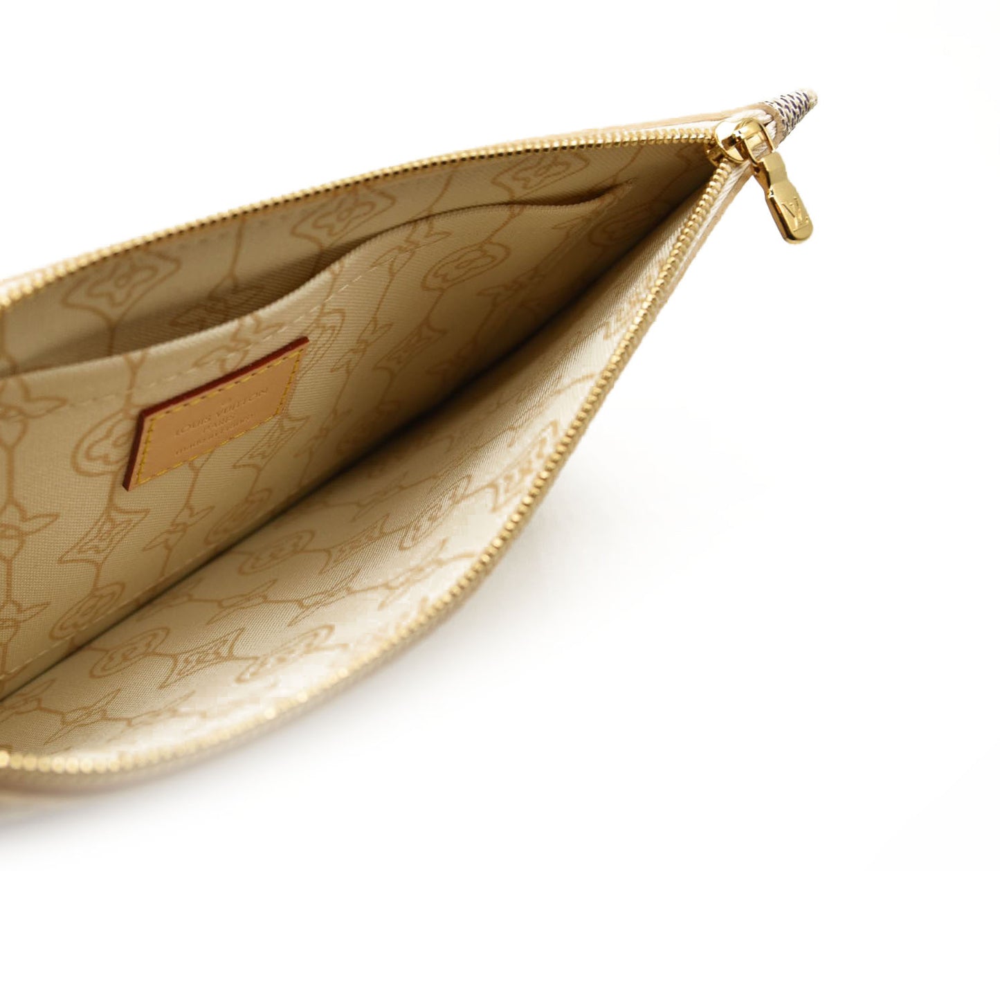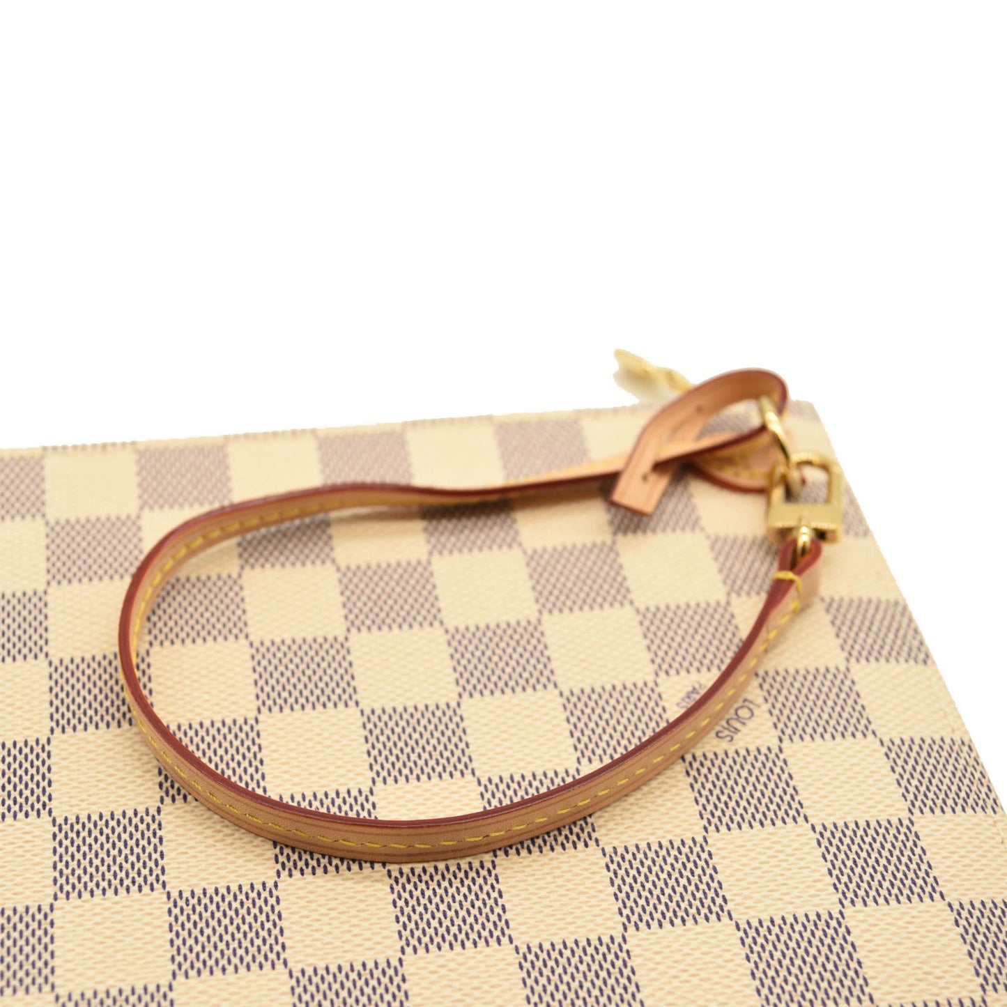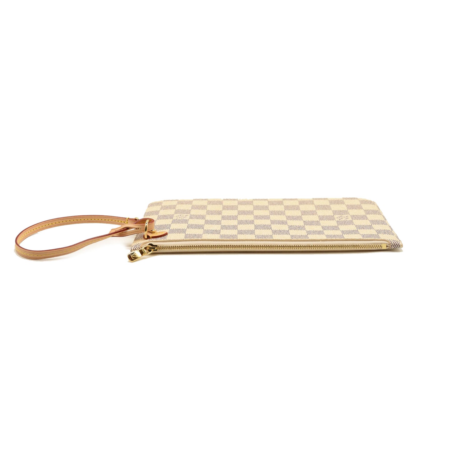 This an authentic LOUIS VUITTON Damier Azur Nautical Neverfull MM GM Pochette. This pouch is crafted of signature Louis Vuitton Damier Azur check coated canvas in blue and white complemented with a vachetta leather cowhide wristlet strap. The brushed gold top zipper opens to a light beige striped fabric interior with a patch pocket.