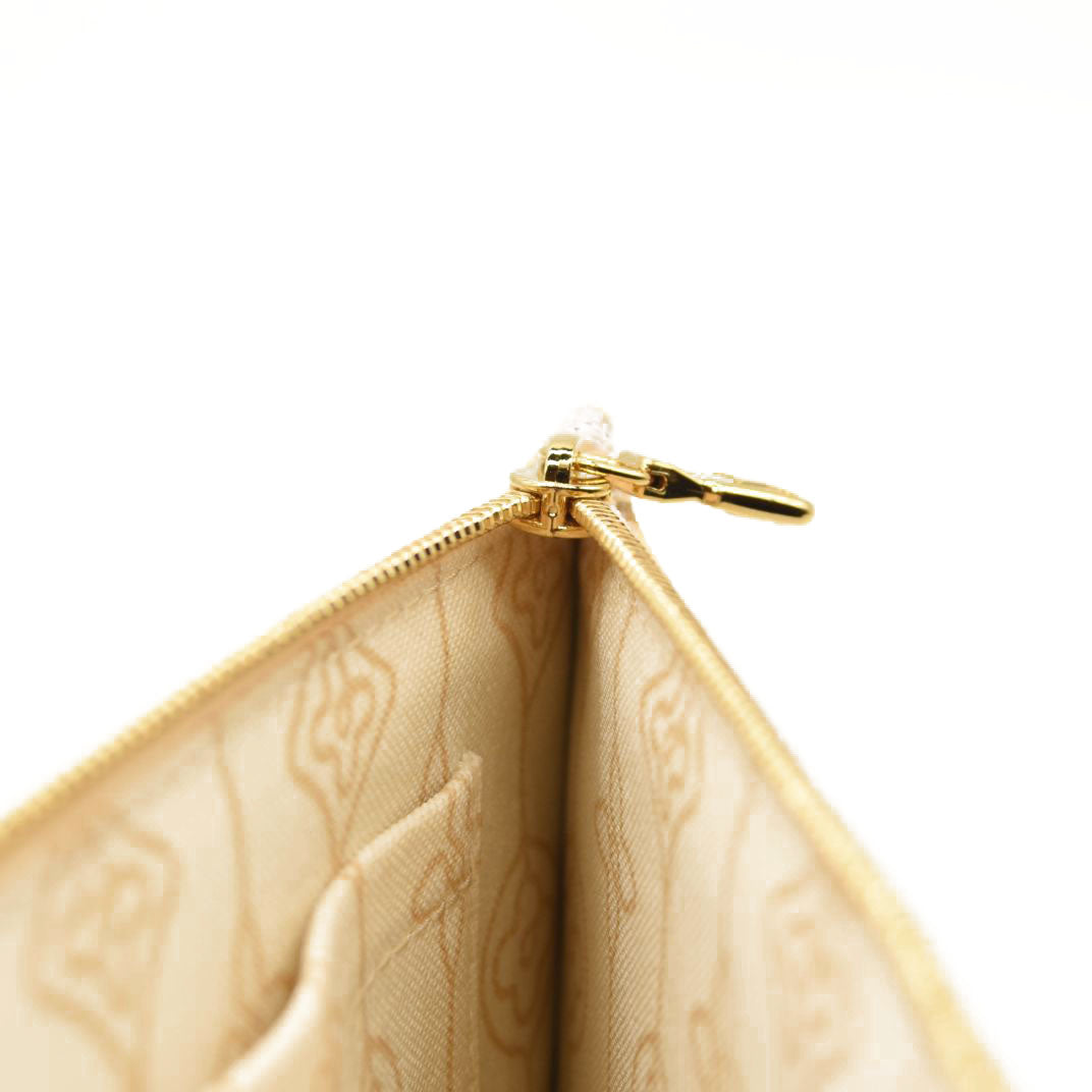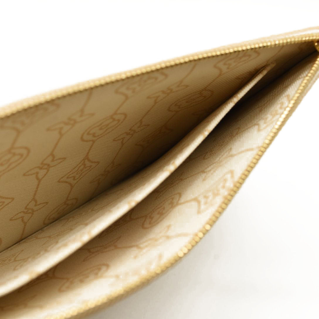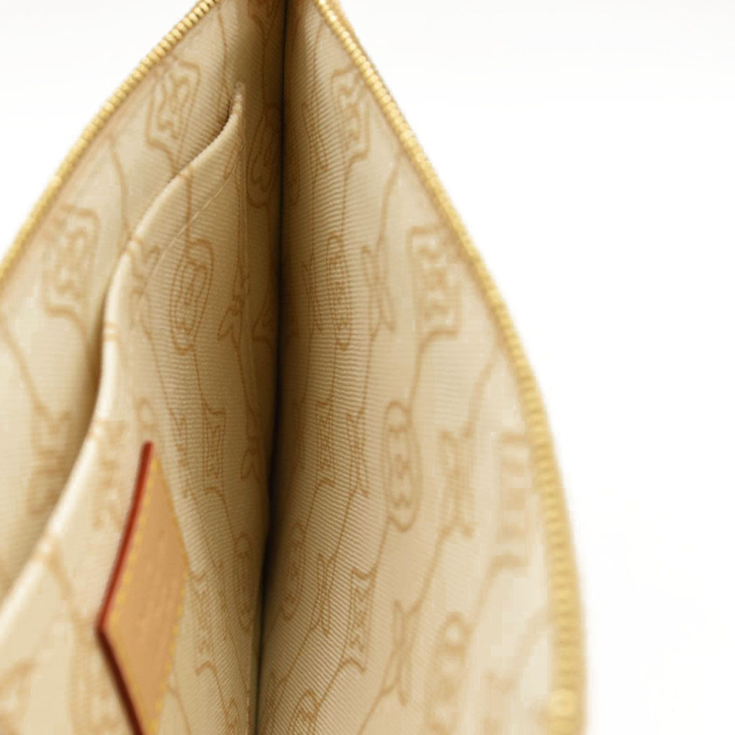 This an authentic LOUIS VUITTON Damier Azur Nautical Neverfull MM GM Pochette. This pouch is crafted of signature Louis Vuitton Damier Azur check coated canvas in blue and white complemented with a vachetta leather cowhide wristlet strap. The brushed gold top zipper opens to a light beige striped fabric interior with a patch pocket.