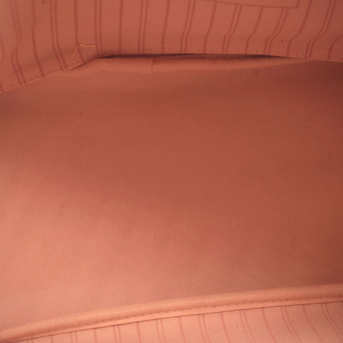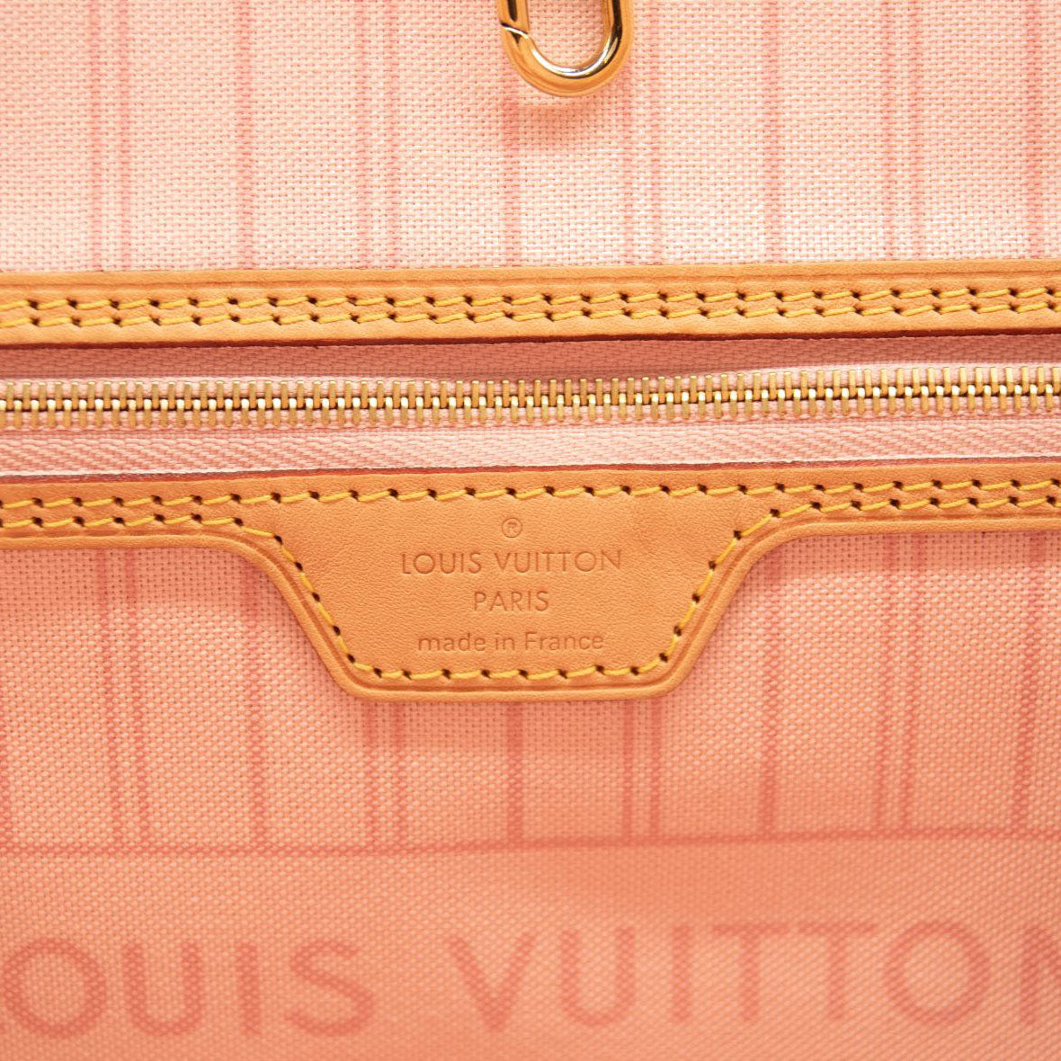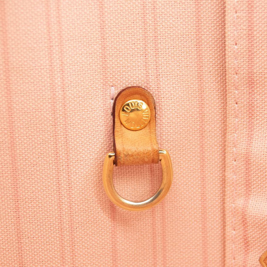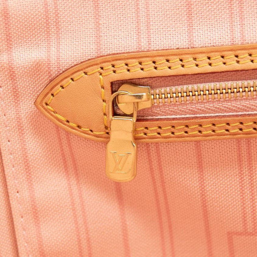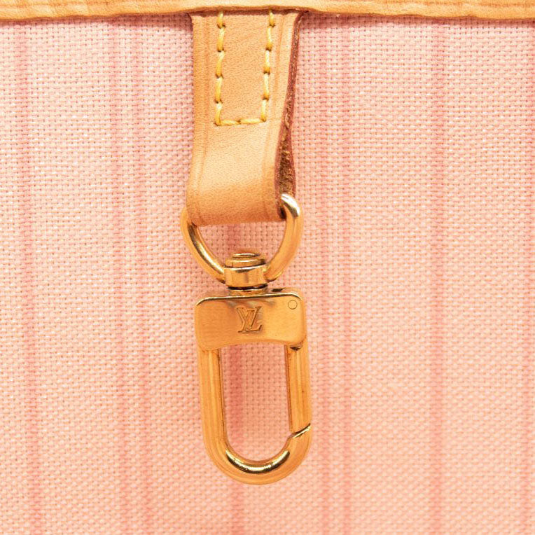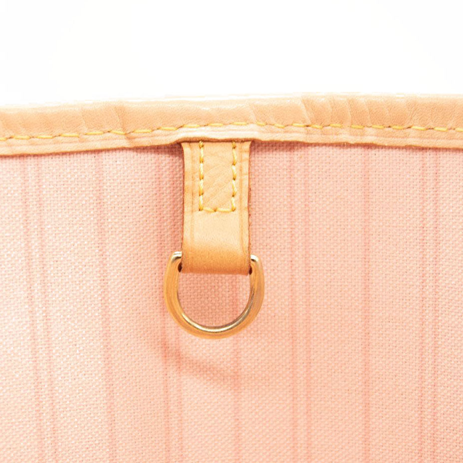 This is an authentic LOUIS VUITTON Damier Azur Neverfull MM Rose Ballerine. This tote bag is crafted of Louis Vuitton signature damier canvas in light azur blue in medium size. This handbag features vachetta cowhide leather strap handles, trim and side cinch cords with polished brass hardware. The top is wide and open to a light pink striped fabric interior with a zipper pocket. This tote is ideal for everyday use from Louis Vuitton.