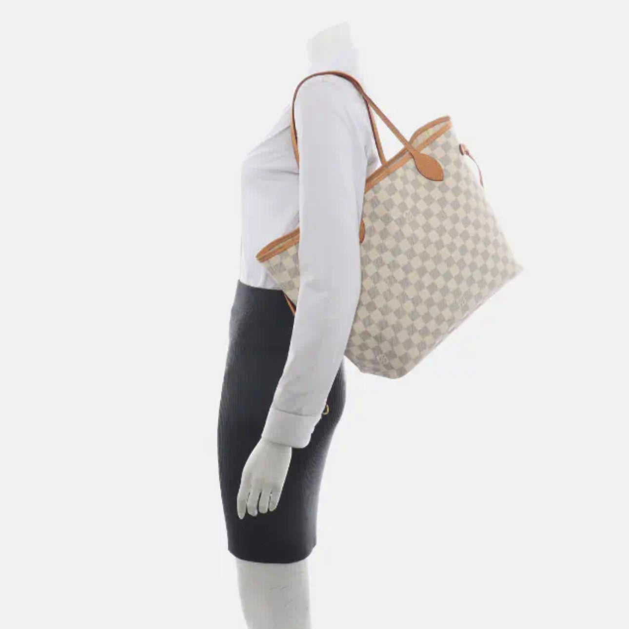 This is an authentic LOUIS VUITTON Damier Azur Neverfull MM. This tote bag is crafted of Louis Vuitton signature damier canvas in light azur blue in medium size. This handbag features vachetta cowhide leather strap handles, trim and side cinch cords with polished brass hardware. The top is wide and open to a beige and brown striped fabric interior with a zipper pocket. This tote is ideal for everyday use from Louis Vuitton.