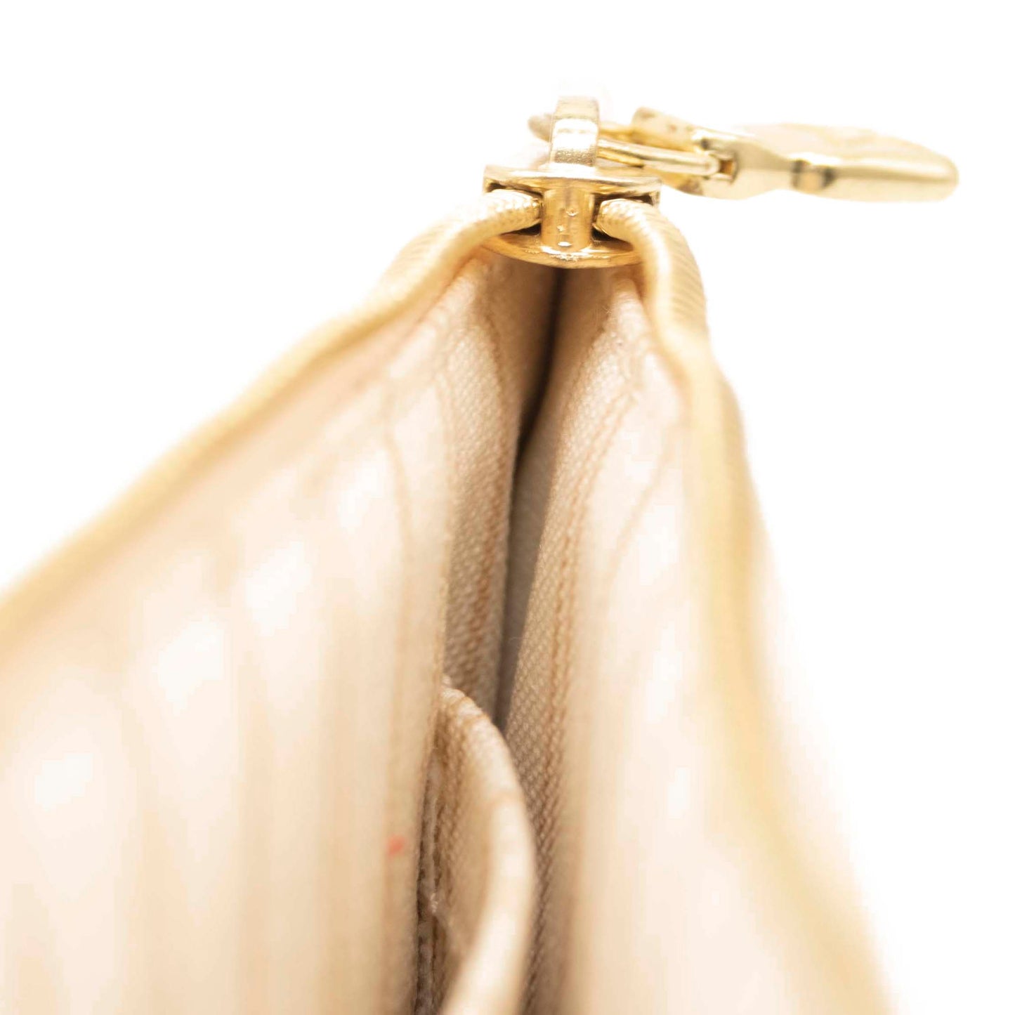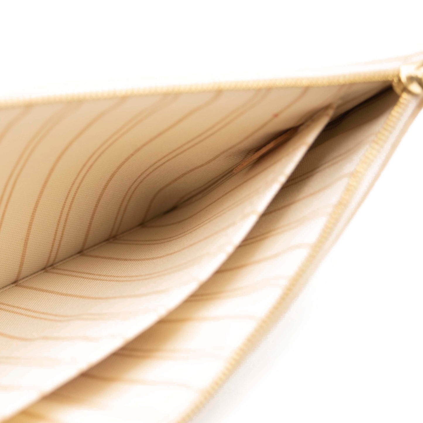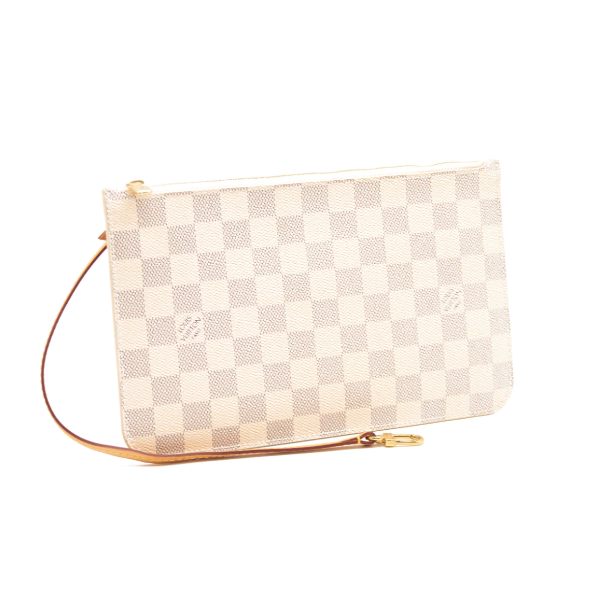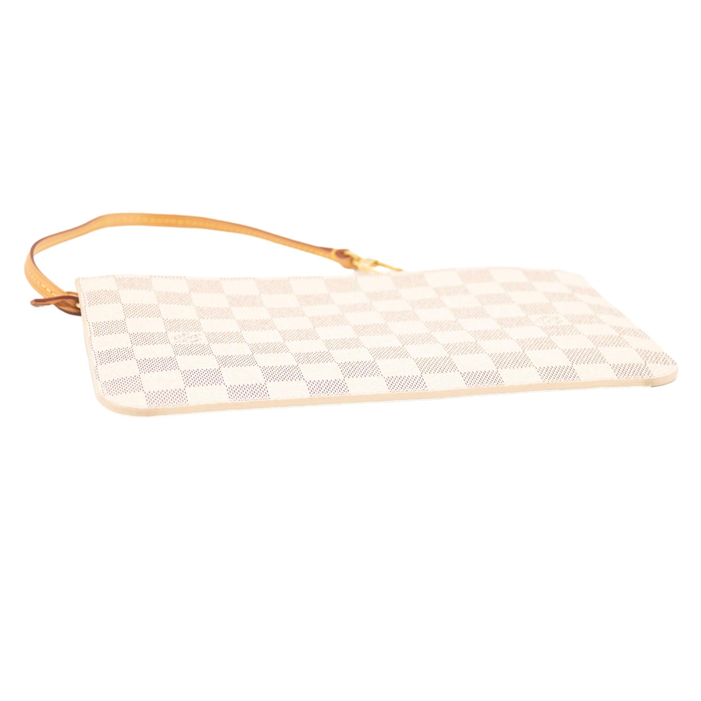 This an authentic LOUIS VUITTON Damier Azur Neverfull MM GM in Pochette. This pouch is crafted of signature Louis Vuitton Damier Azur check coated canvas in blue and white, complemented with a vachetta leather cowhide wristlet strap. The brushed gold top zipper opens to a light beige striped fabric interior with a patch pocket.