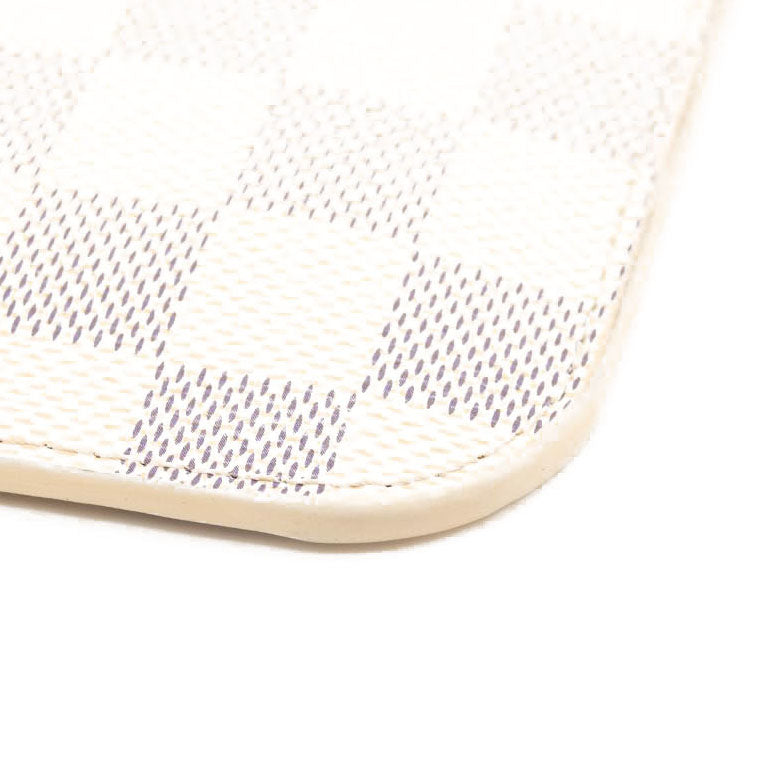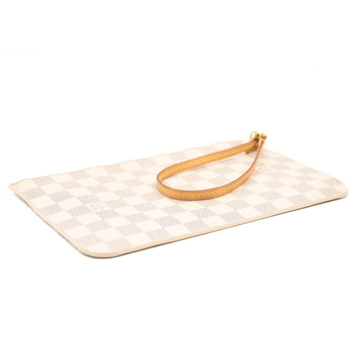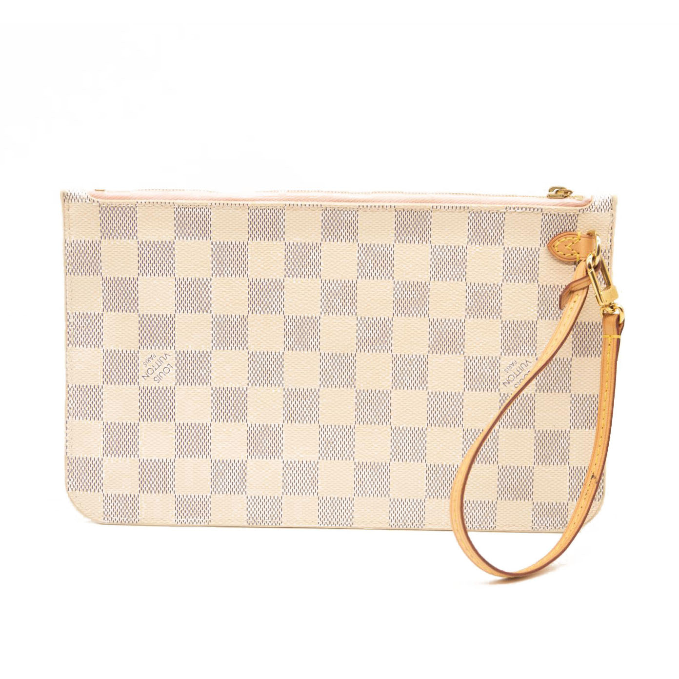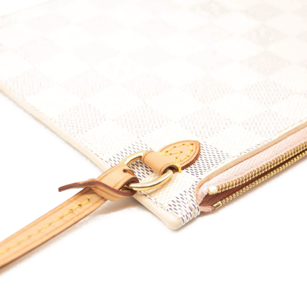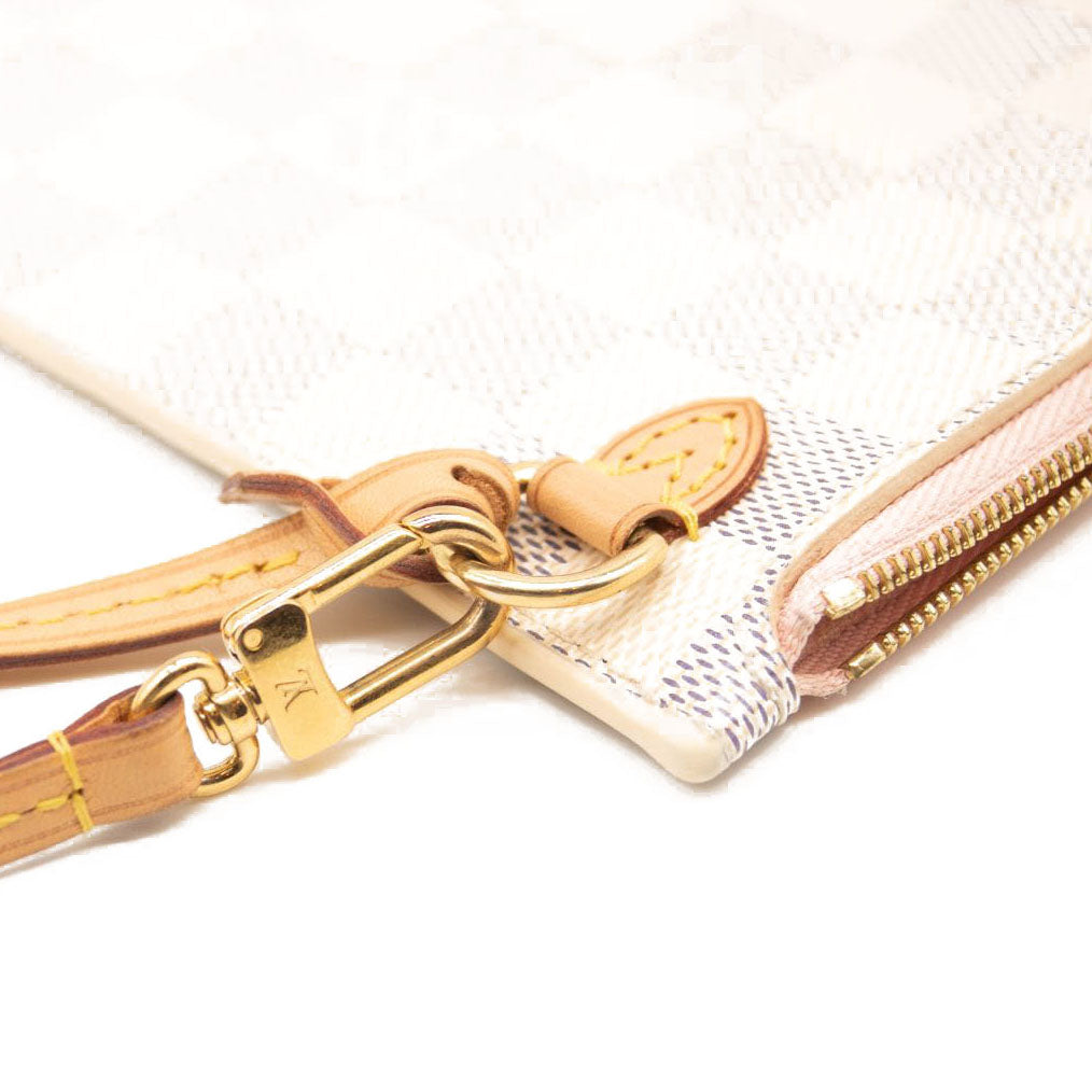 This an authentic LOUIS VUITTON Damier Azur Neverfull MM GM Pochette. This pouch is crafted of signature Louis Vuitton azur check canvas in blue and white with a vachetta leather cowhide wristlet strap. The brushed gold top zipper opens to a pink striped fabric interior with a pocket.